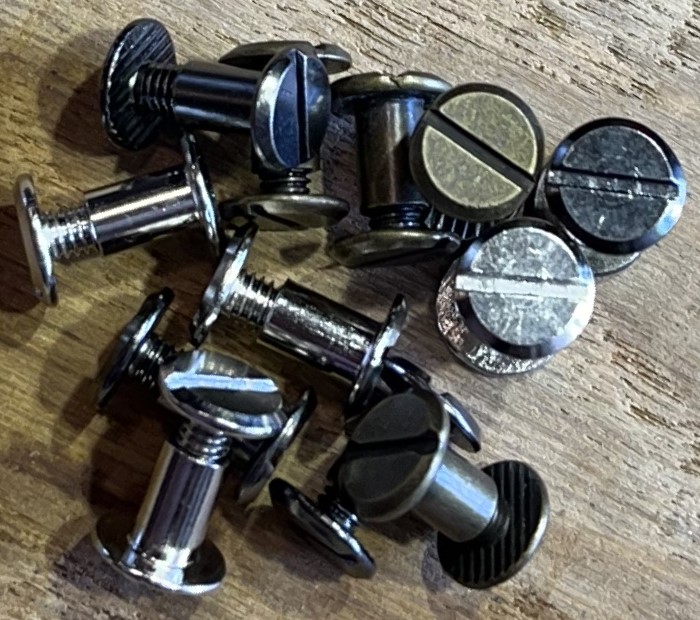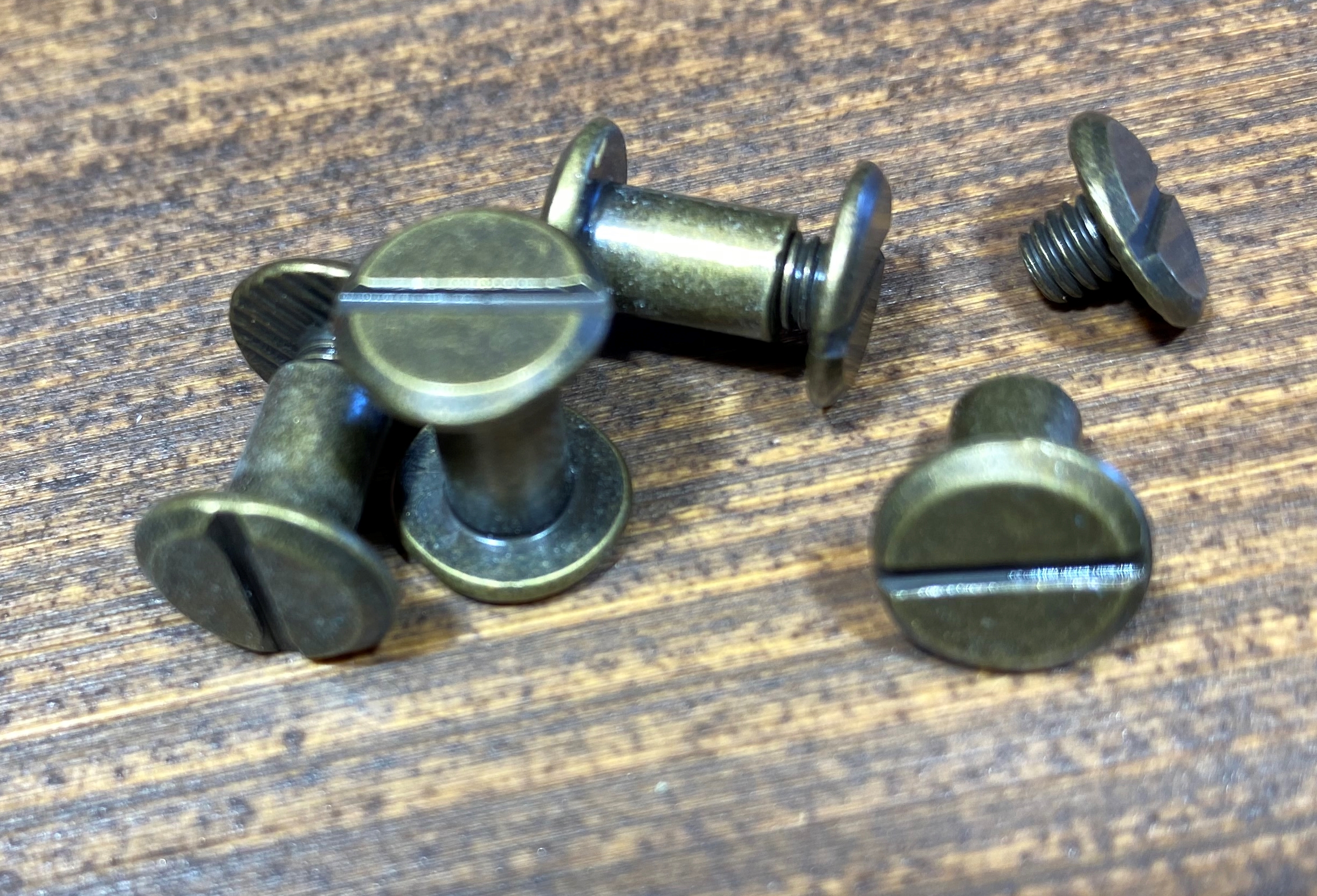 Opaskový šroubek 5x8mm M4, šířka hlavy 10mm. Barvy: černý zinek, bílý zinek, staromosaz zinek. Obostranné utahování. Cena za jeden komplet (dva díly). Bez příměsi niklu.
