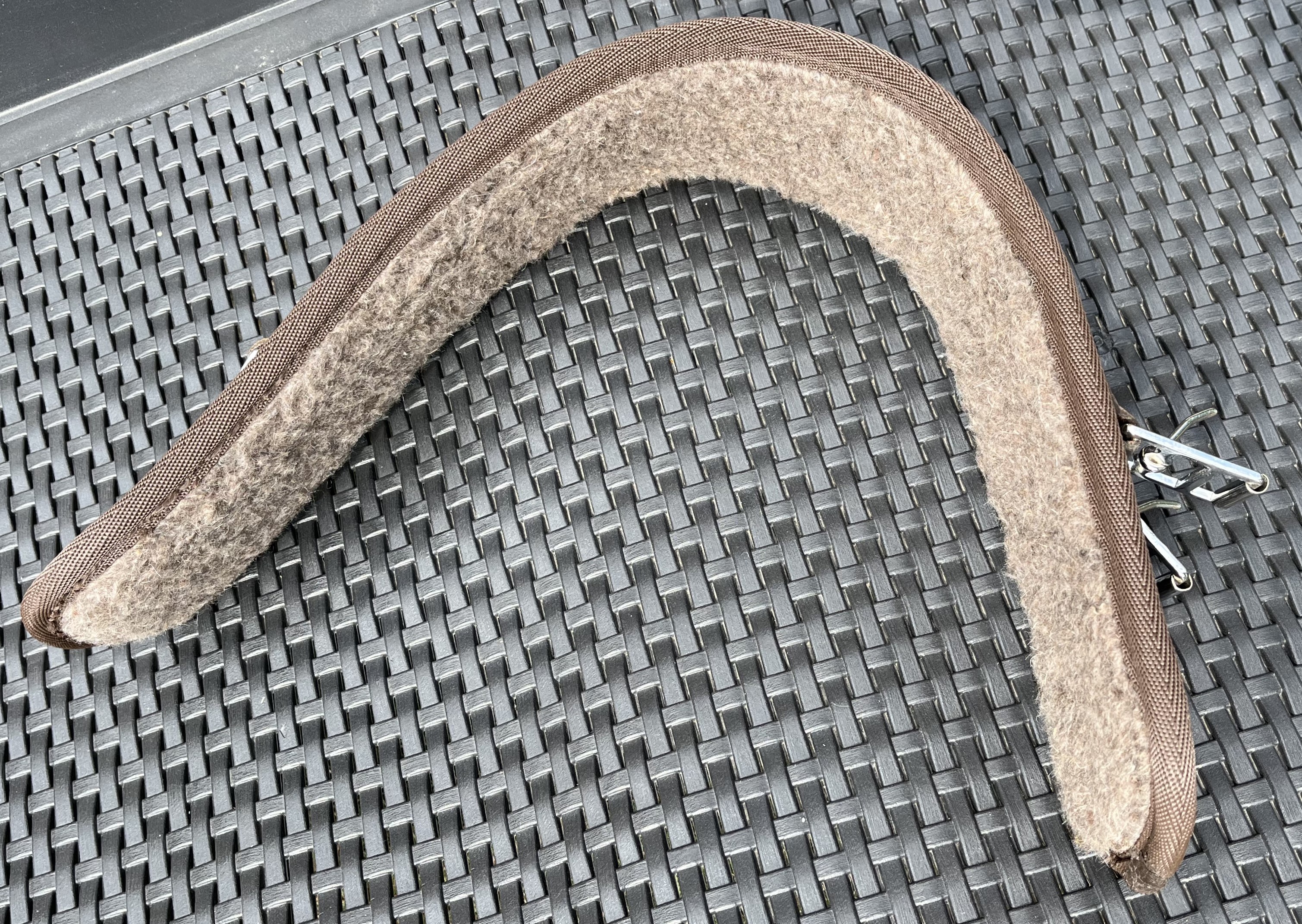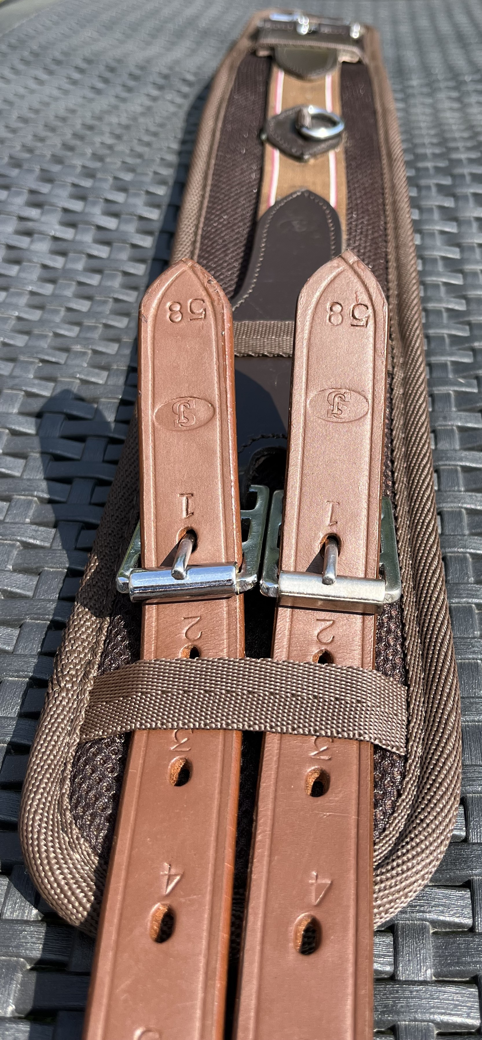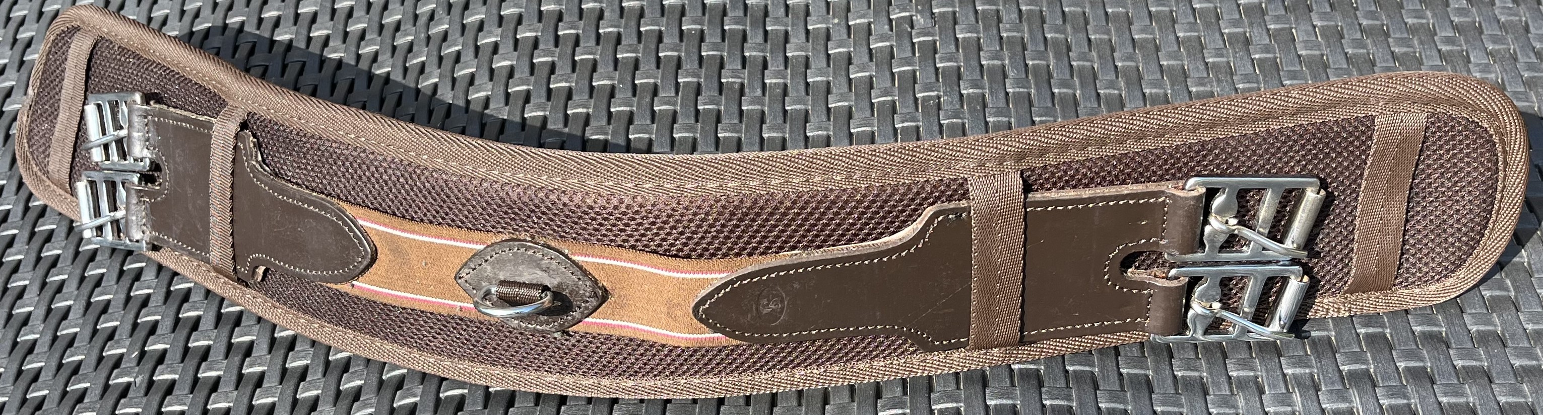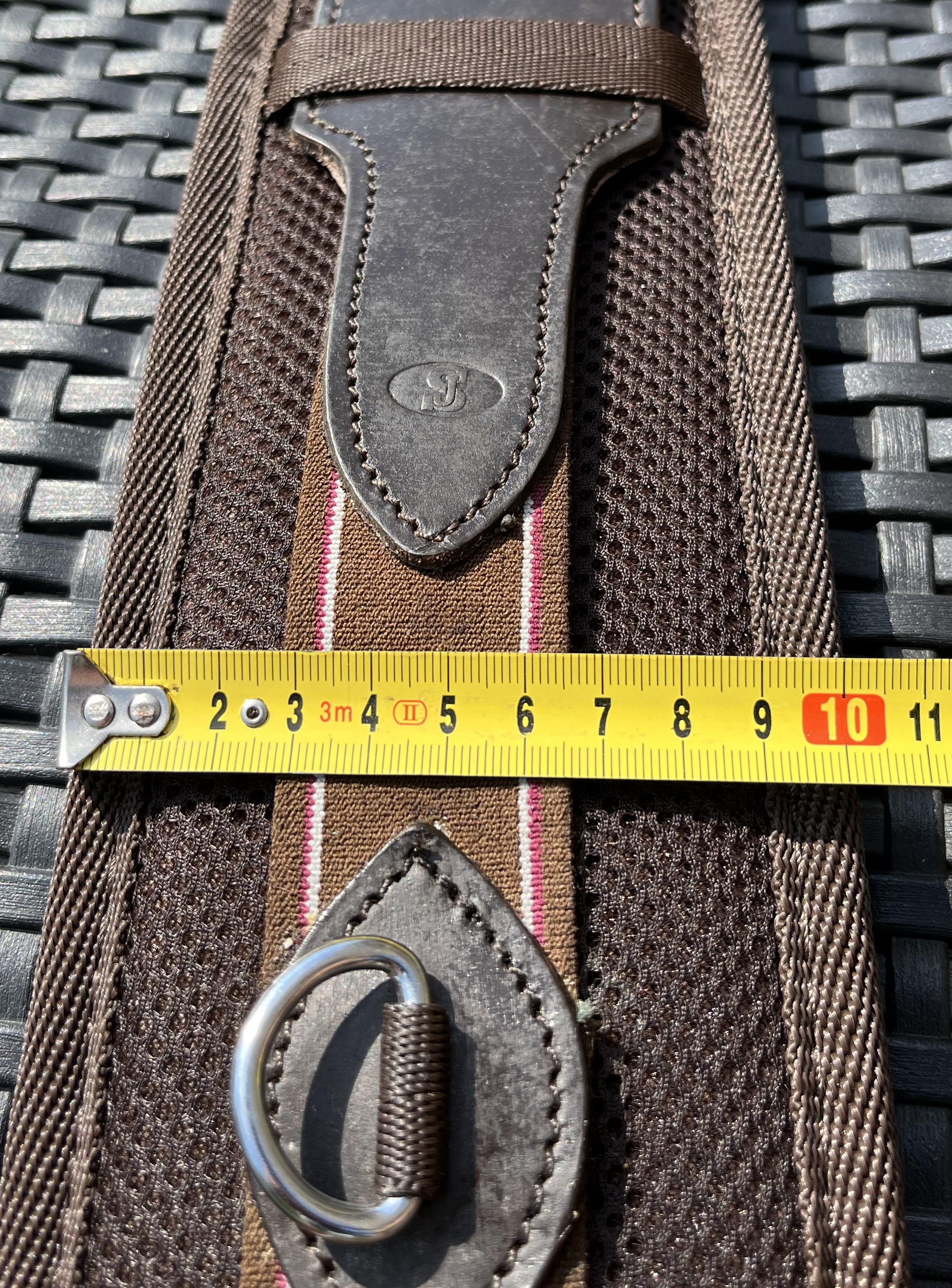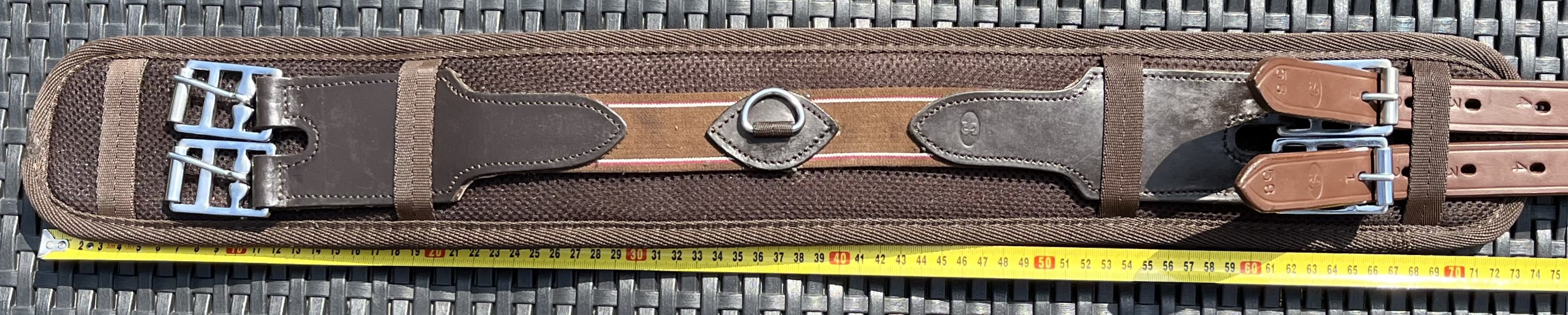 Podbřišník k anglickému nebo bezkostrovému sedlu, textilní s koženými řemeny u přezek, podšitý chlupatinou, pevný. Celková délka podbřišníku 75cm, pracovní délka přezka/přezka 60cm, šířka 10cm, průchodnost přezek 2,7cm. Použitelné k většině podpínkových řemenů. Uprostřed s "D" kroužkem pro propojení s martingalem, nebo poprsníkem. Kvalitní prošití.