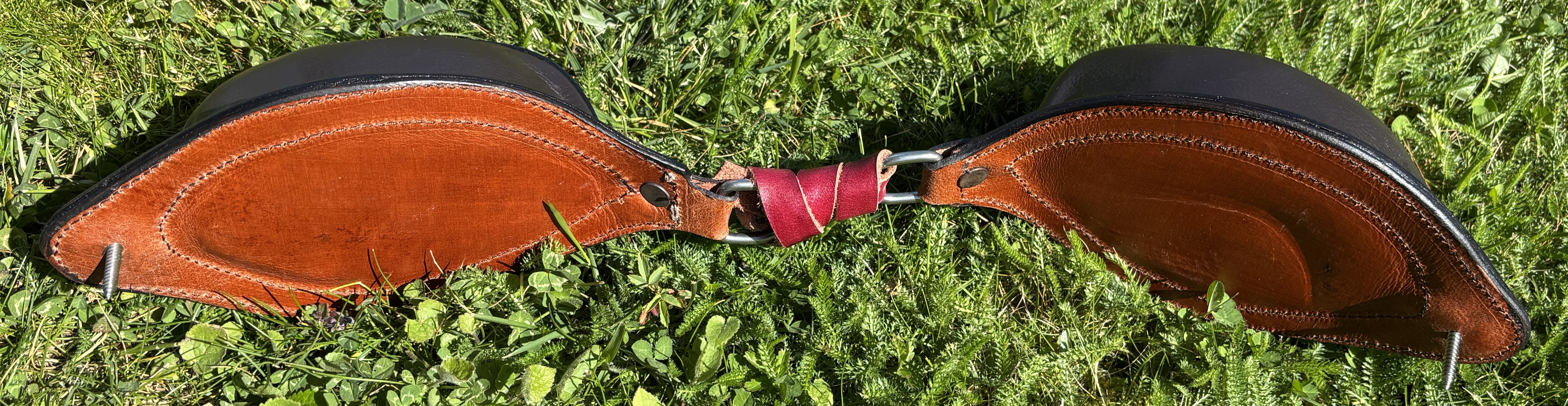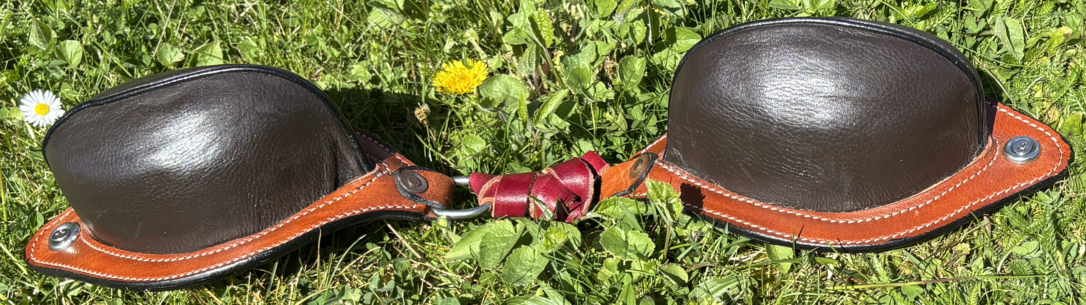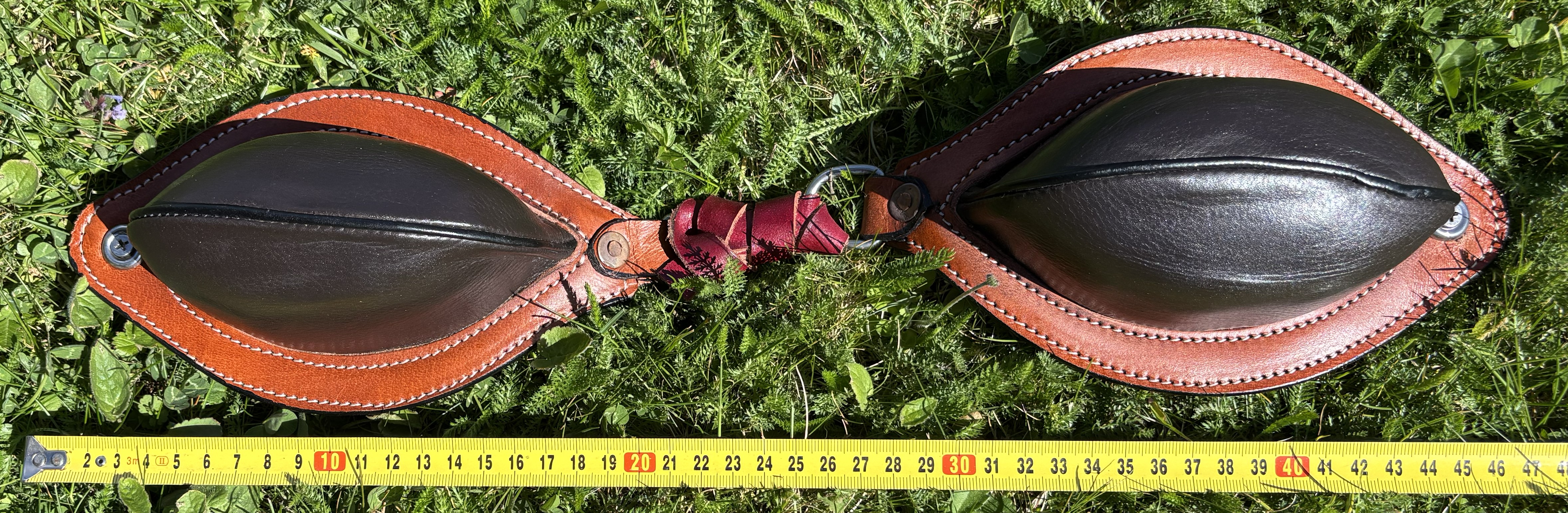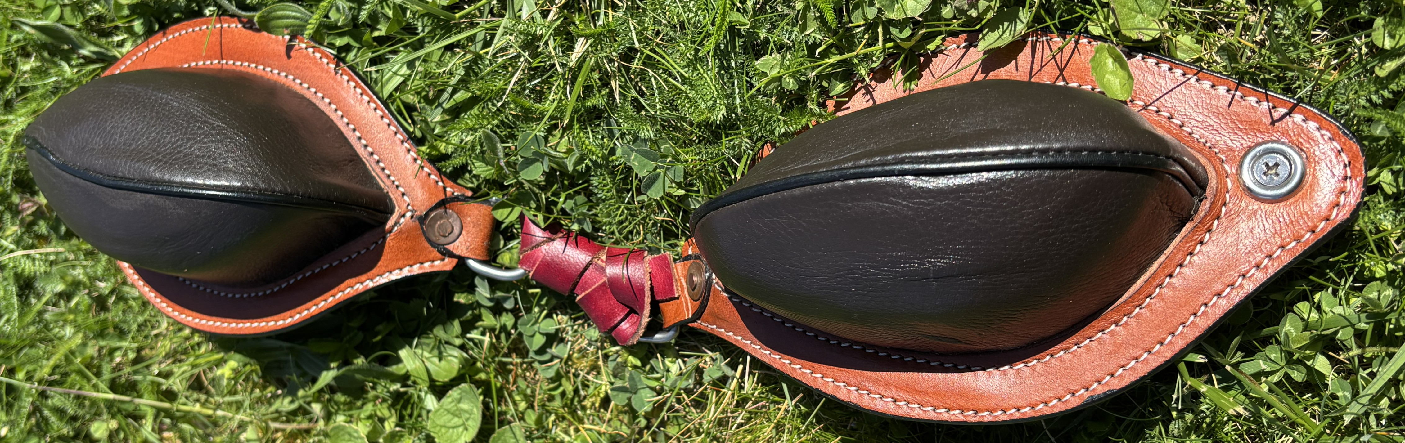 Kožené hnědé, kombinace světlé a tmavé, "Bucking rolls/Ropingové zarážky", sloužící u westernového sedla k: a) Opoře stehen/pomáhají jezdci udržet stabilní pozici. b) Ke zvýšení bezpečnosti/při prudkém zastavení nebo tahu lana (např.při westernových disciplínách v chytání dobytka...). c) Drží jezdce v sedle, lepší kontrola koně/jezdec má pevnější a jistější sed. Součástí vruty s podložkami/pár. Šířka zarážky 11cm, délka 20cm. Délka spárovaného kompletu 46cm. Použitelné k většině westernových sedel bez nutnosti vrtání, připevnění k již použitému kování na Vašem sedle. Nové, nepoužité. Ruční výroba.
