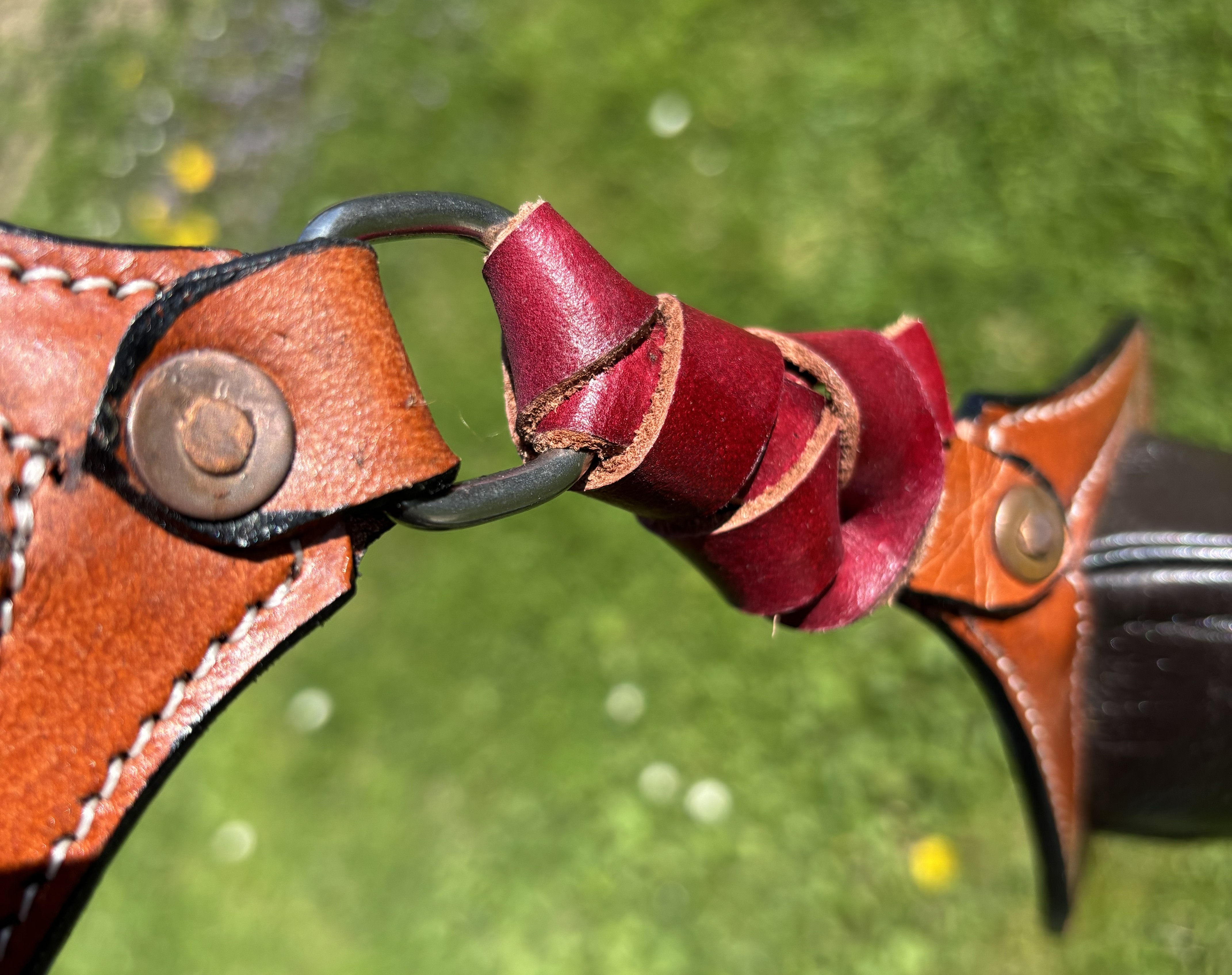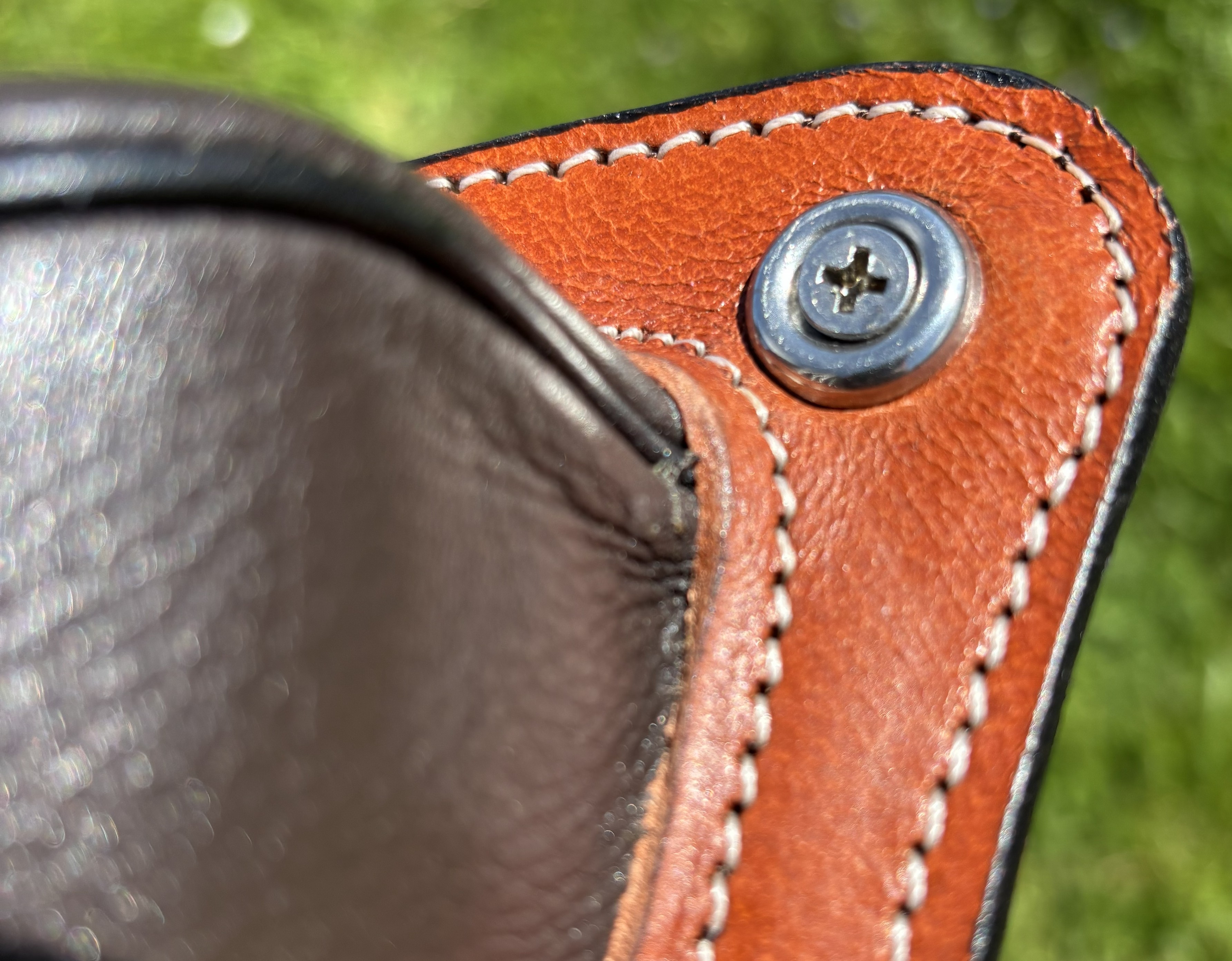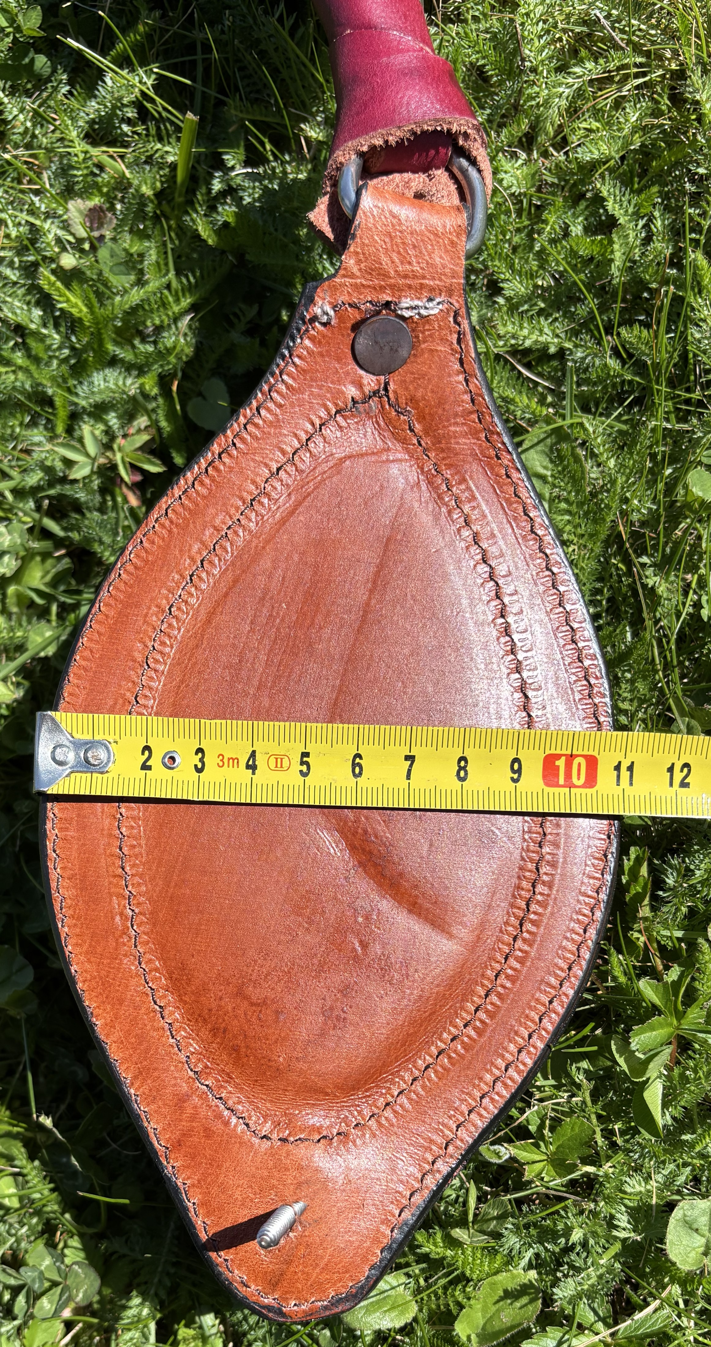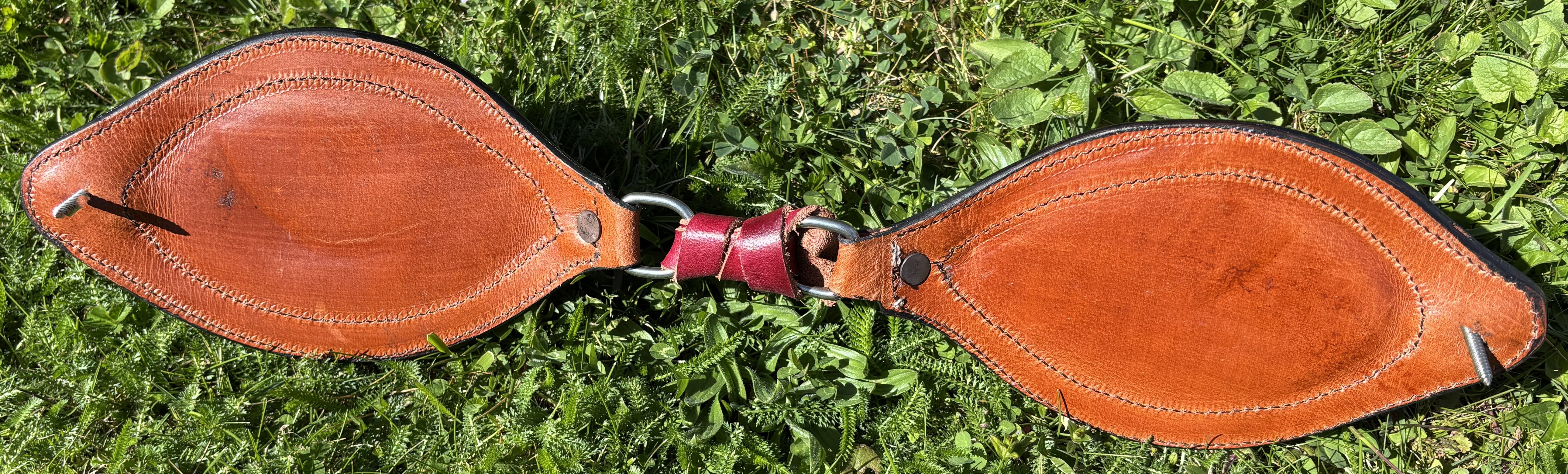 Kožené hnědé, kombinace světlé a tmavé, "Bucking rolls/Ropingové zarážky", sloužící u westernového sedla k: a) Opoře stehen/pomáhají jezdci udržet stabilní pozici. b) Ke zvýšení bezpečnosti/při prudkém zastavení nebo tahu lana (např.při westernových disciplínách v chytání dobytka...). c) Drží jezdce v sedle, lepší kontrola koně/jezdec má pevnější a jistější sed. Součástí vruty s podložkami/pár. Šířka zarážky 11cm, délka 20cm. Délka spárovaného kompletu 46cm. Použitelné k většině westernových sedel bez nutnosti vrtání, připevnění k již použitému kování na Vašem sedle. Nové, nepoužité. Ruční výroba.