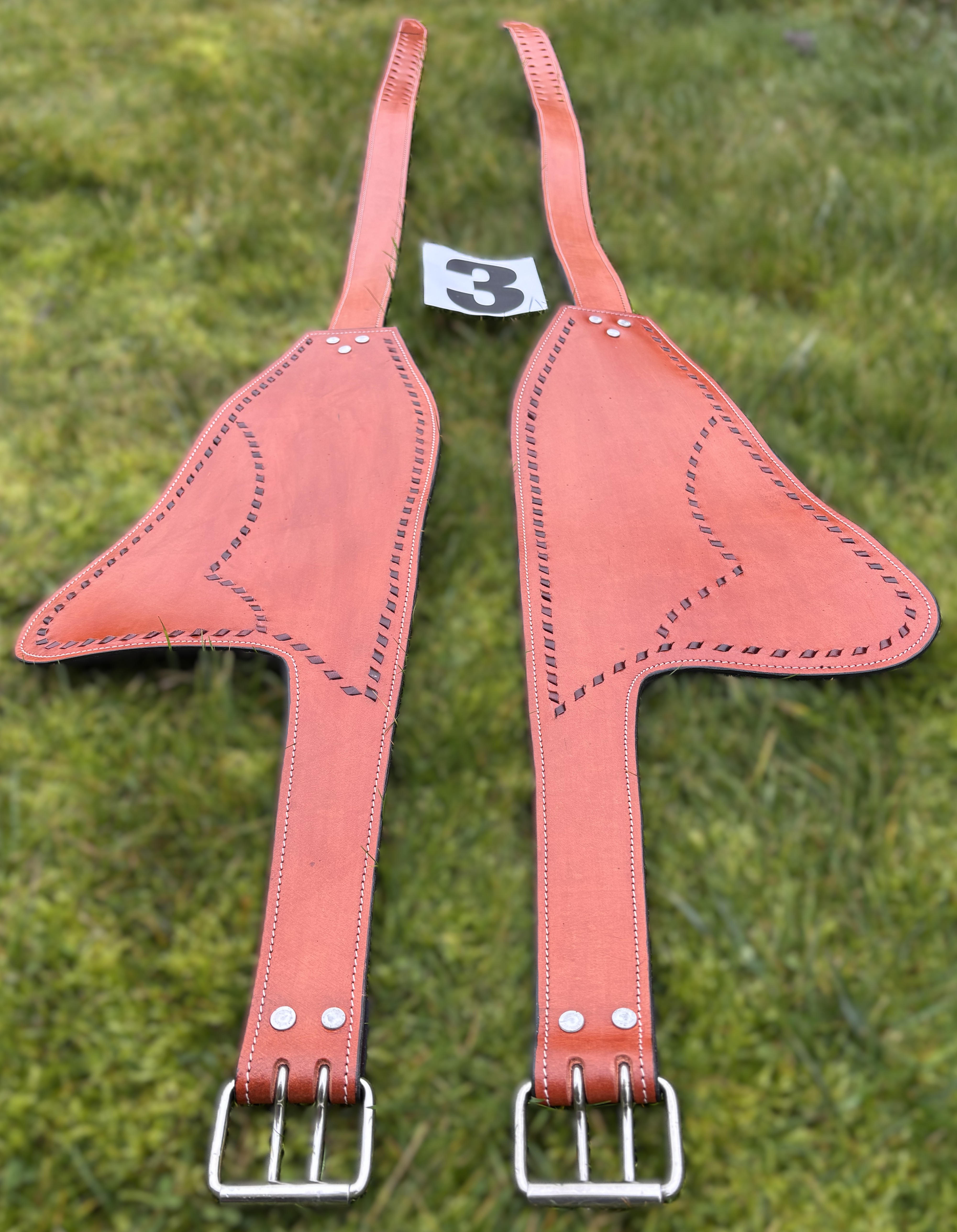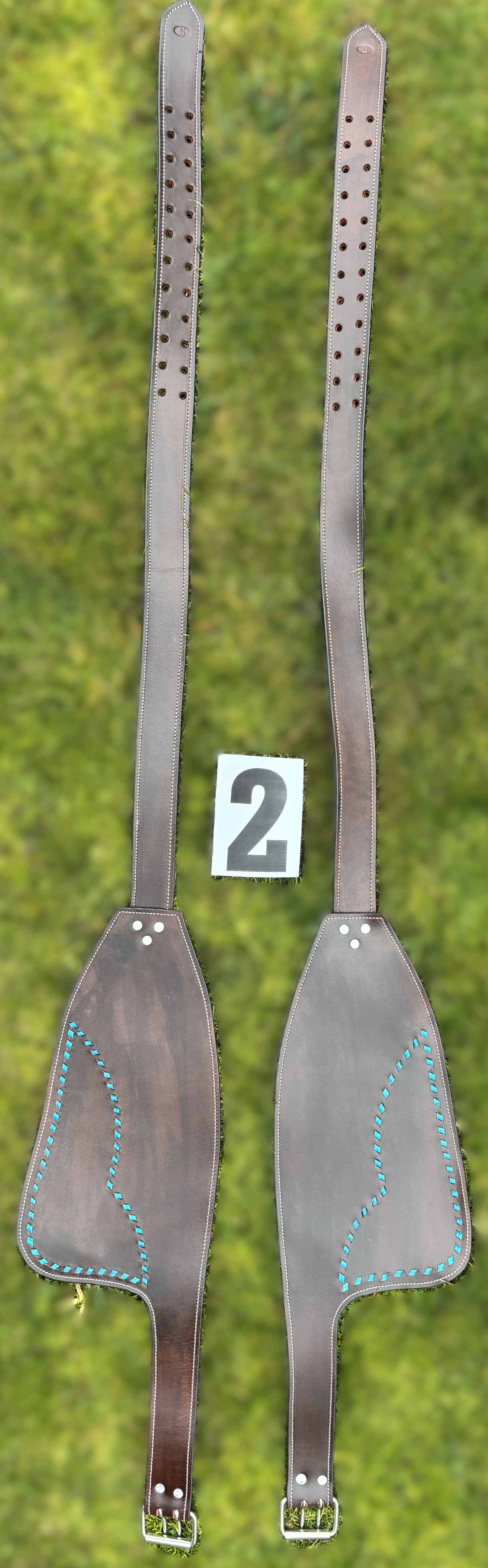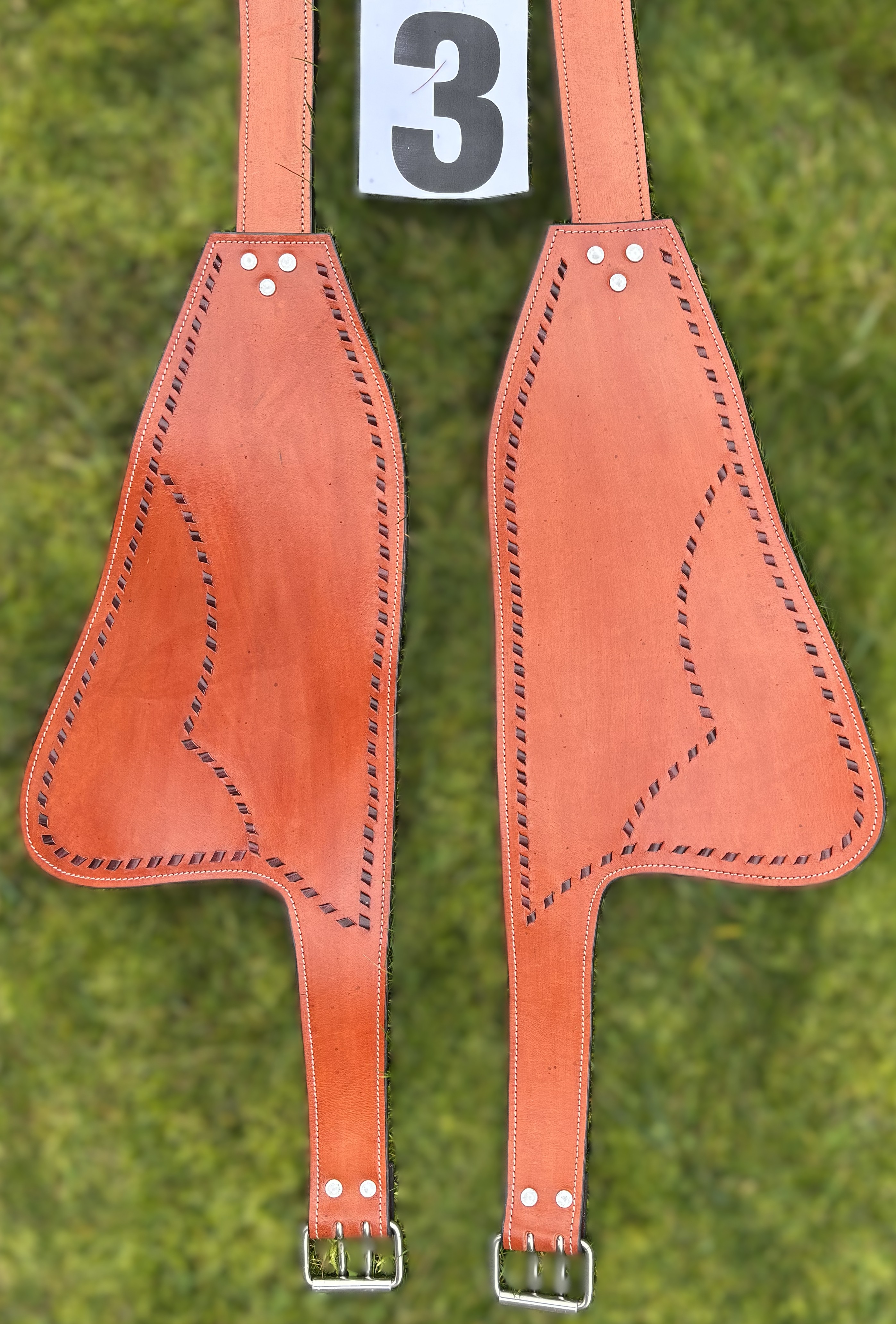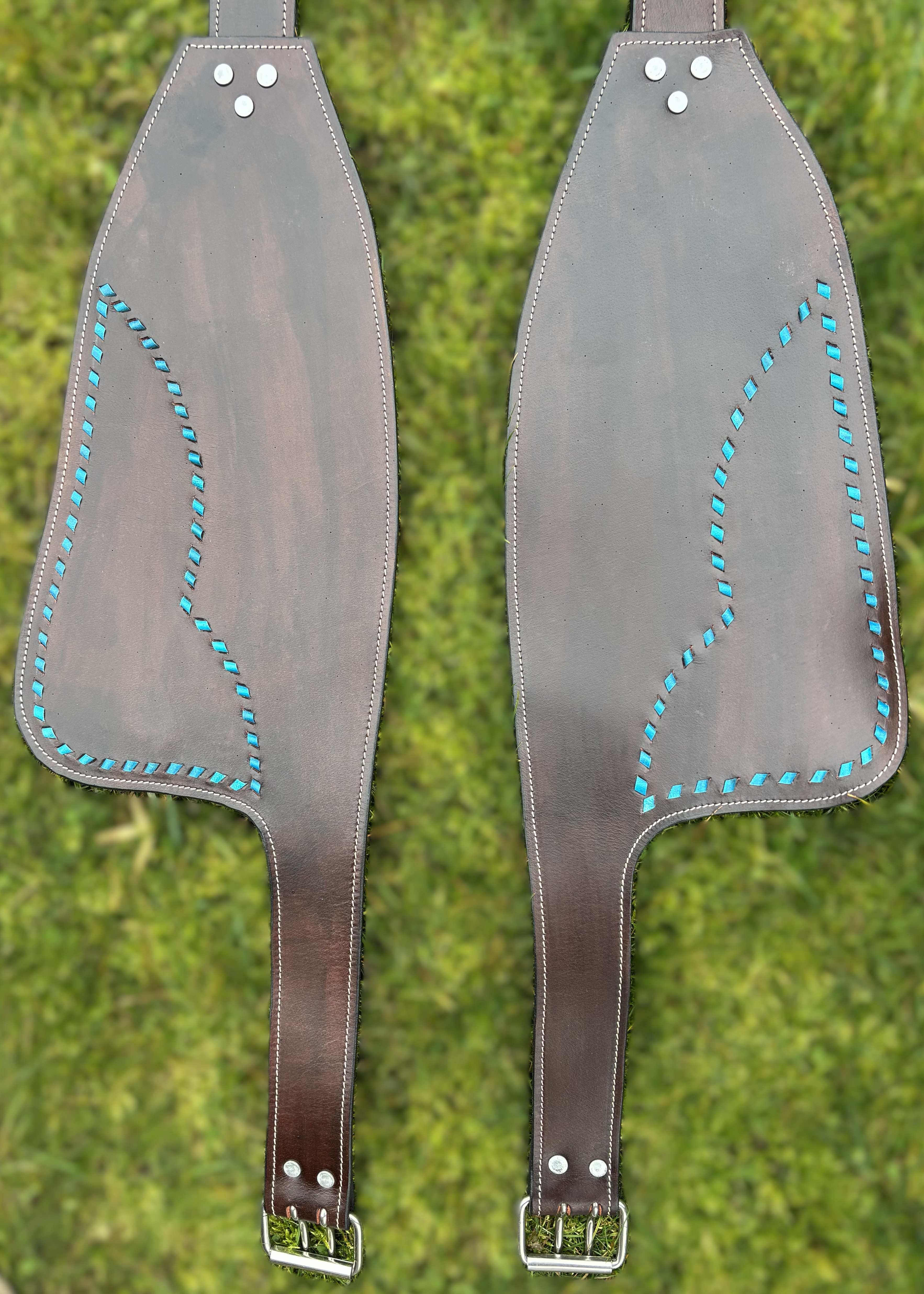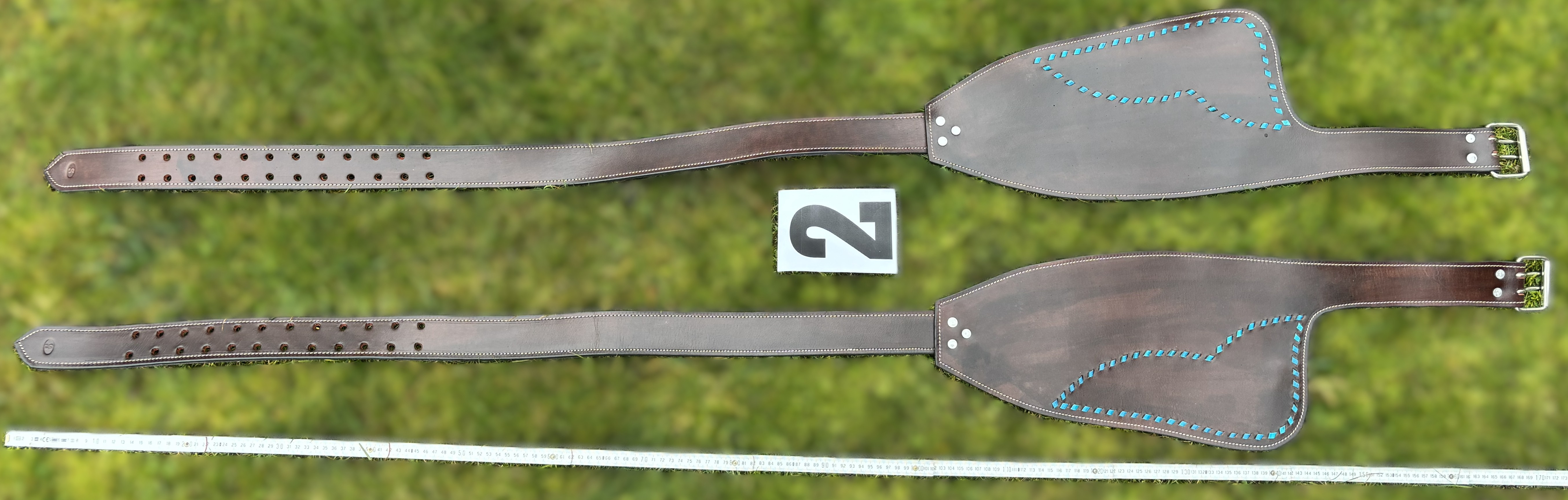 Kožené fendry/pár (třmenové řemeny) k westernovému sedlu, barevný MIX. Kožené díly jsou podlepené a podšité textilií, pro zabránění vytahávání kůže při zátěži. Zapínání řemene na klasickou dvoutrnovou přezku s rolnou. Celková délka cca.170cm, šířka řemene 4,8cm, délka fendrového listu 40cm, šířka fendrového listu 21-24cm, tloušťka kůže 0,5cm. Součástí jsou fendrové řemínky/pár k utažení třmenů. Ruční výroba.
