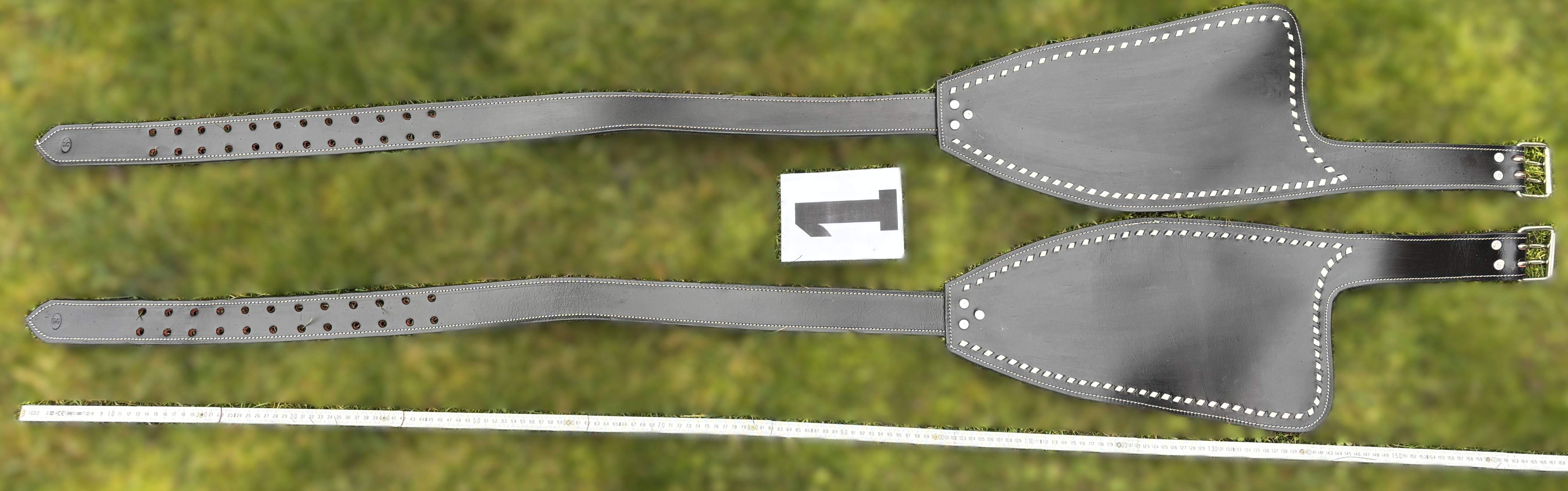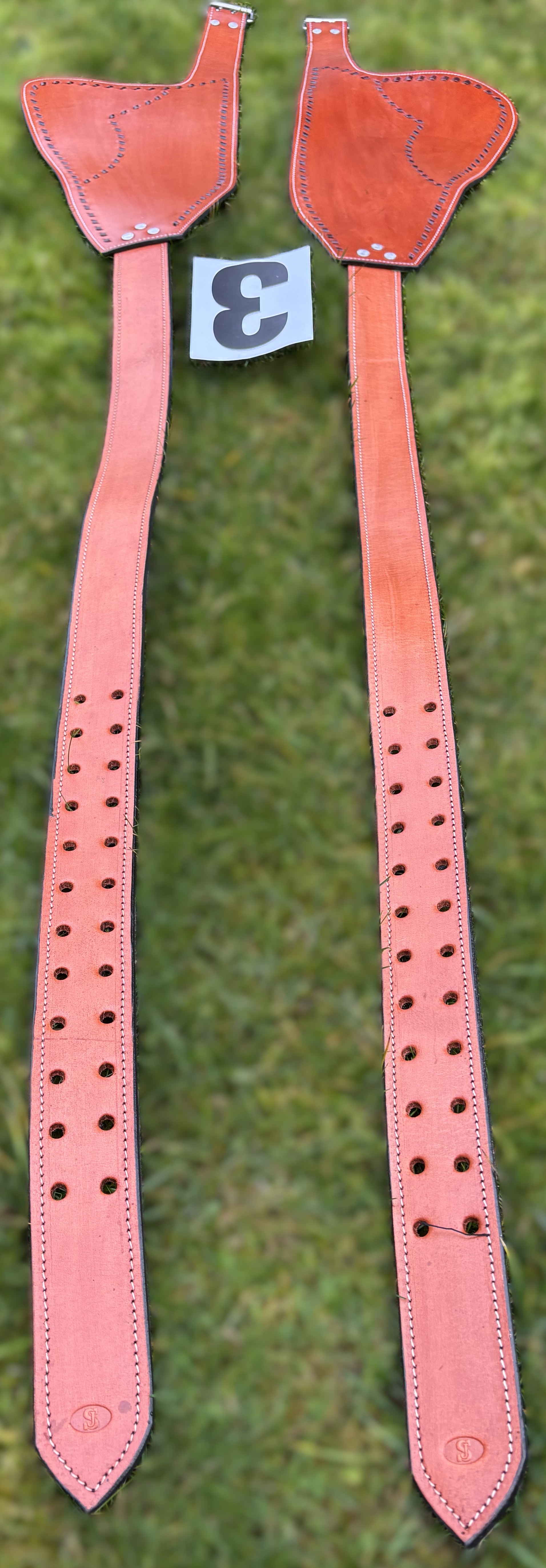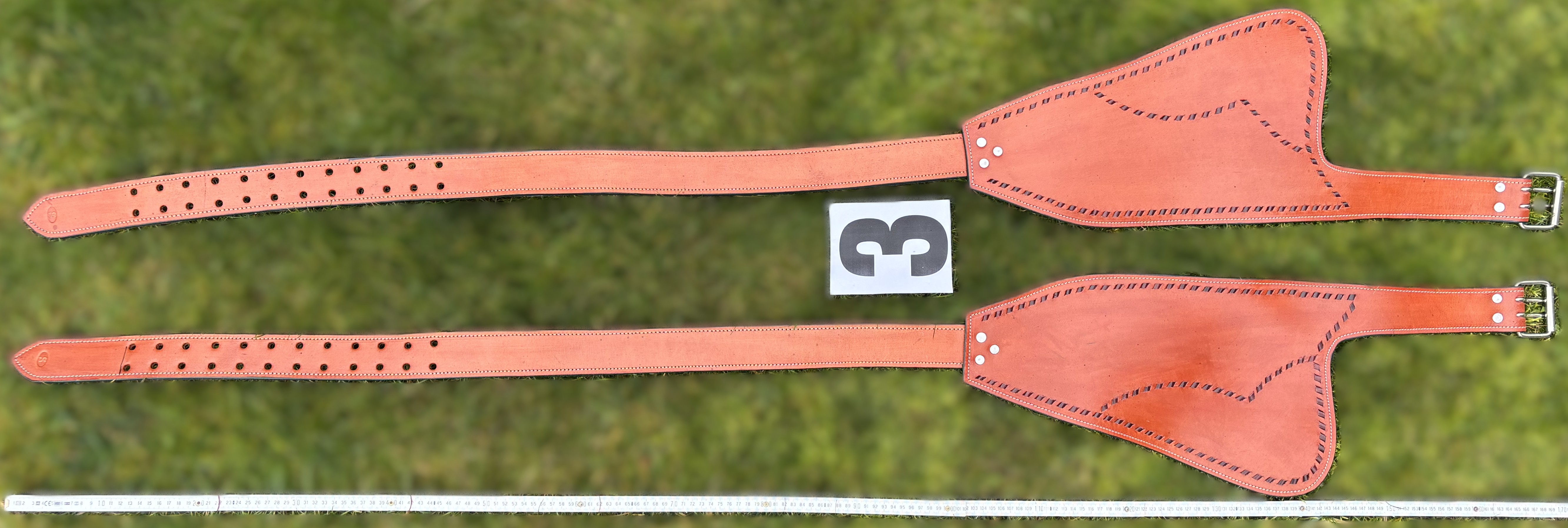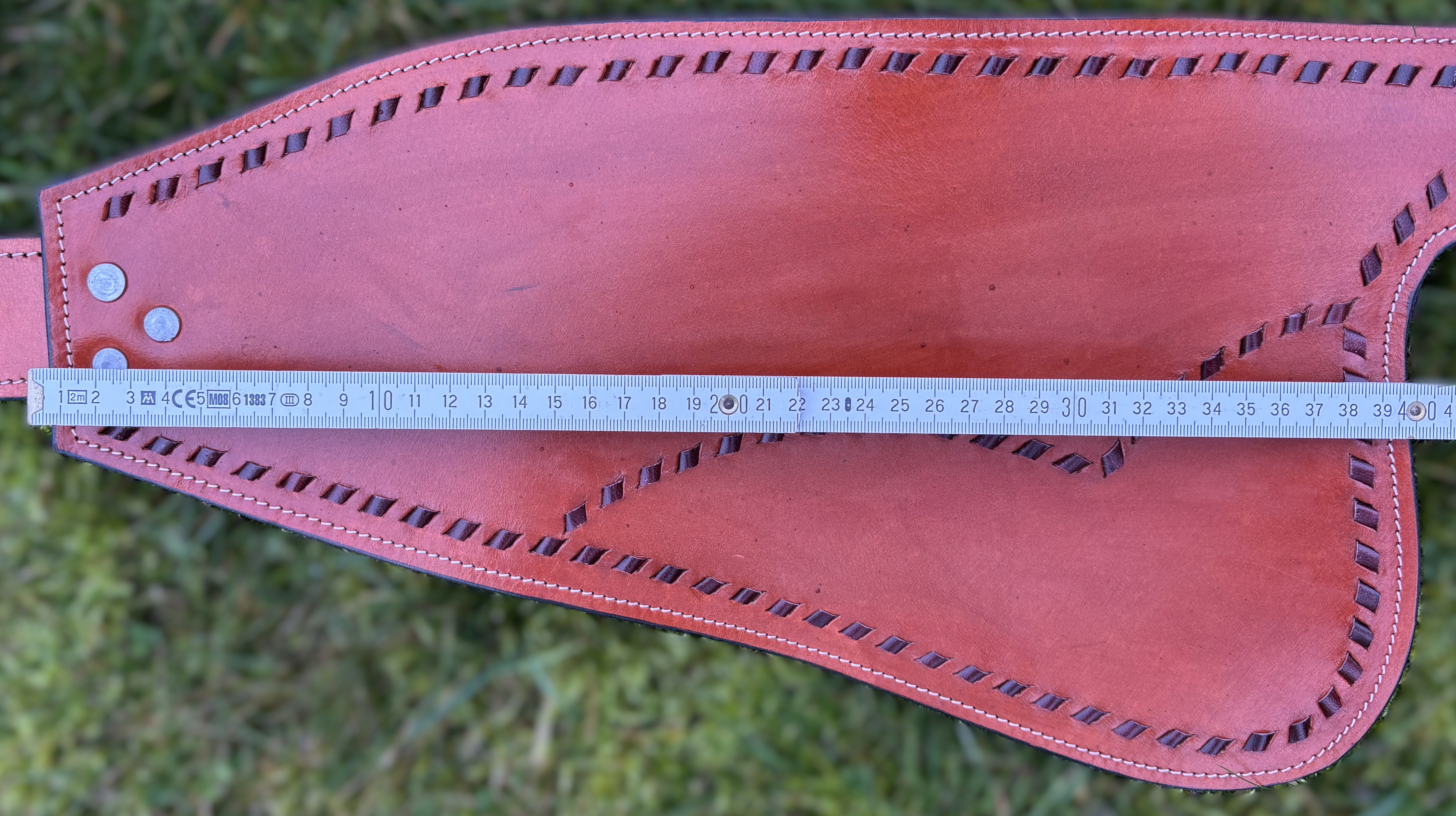 Kožené fendry/pár (třmenové řemeny) k westernovému sedlu, barevný MIX. Kožené díly jsou podlepené a podšité textilií, pro zabránění vytahávání kůže při zátěži. Zapínání řemene na klasickou dvoutrnovou přezku s rolnou. Celková délka cca.170cm, šířka řemene 4,8cm, délka fendrového listu 40cm, šířka fendrového listu 21-24cm, tloušťka kůže 0,5cm. Součástí jsou fendrové řemínky/pár k utažení třmenů. Ruční výroba.