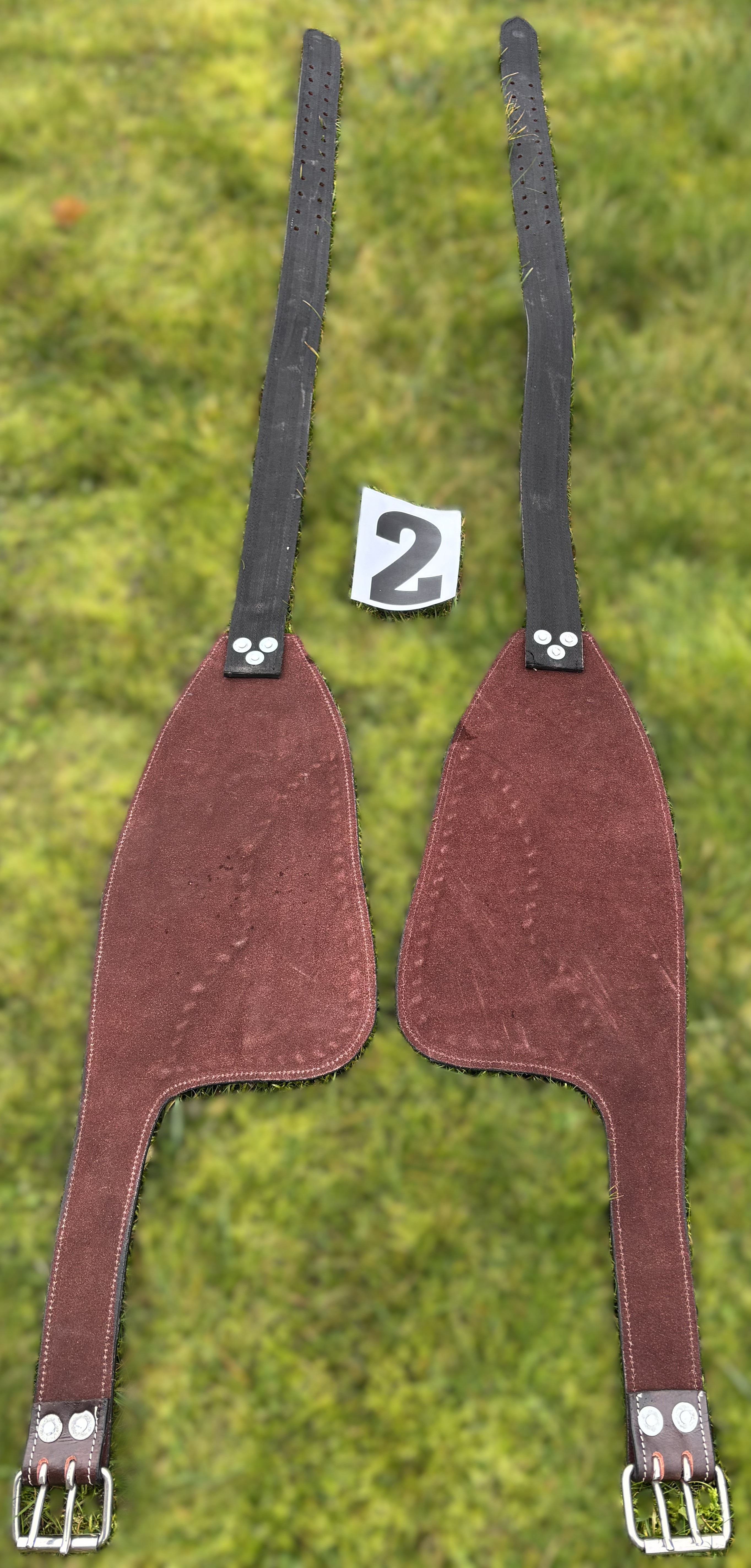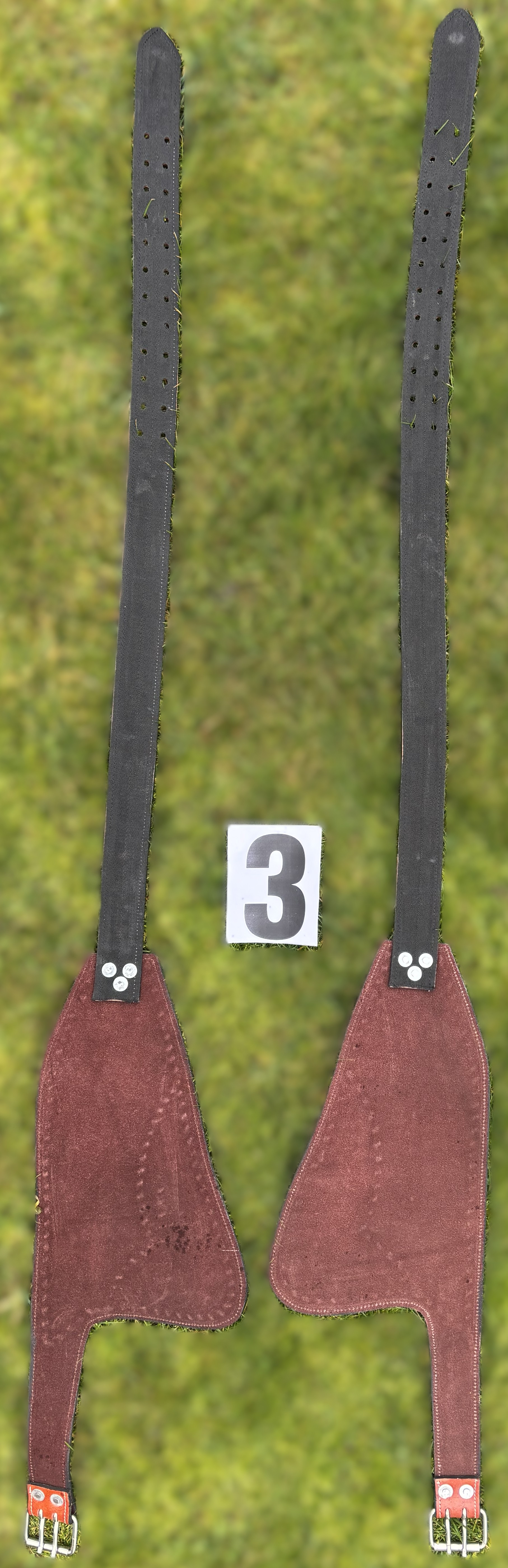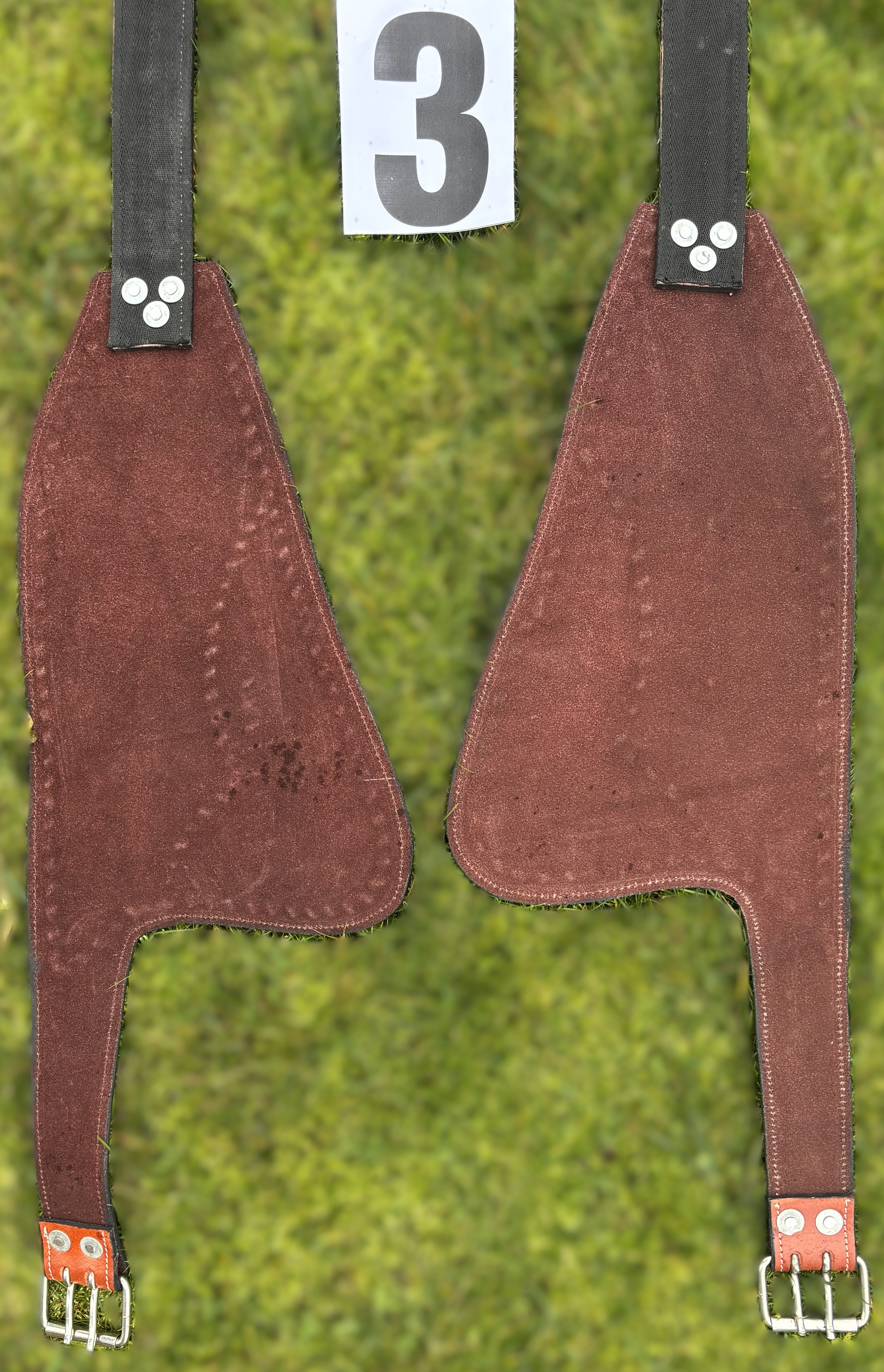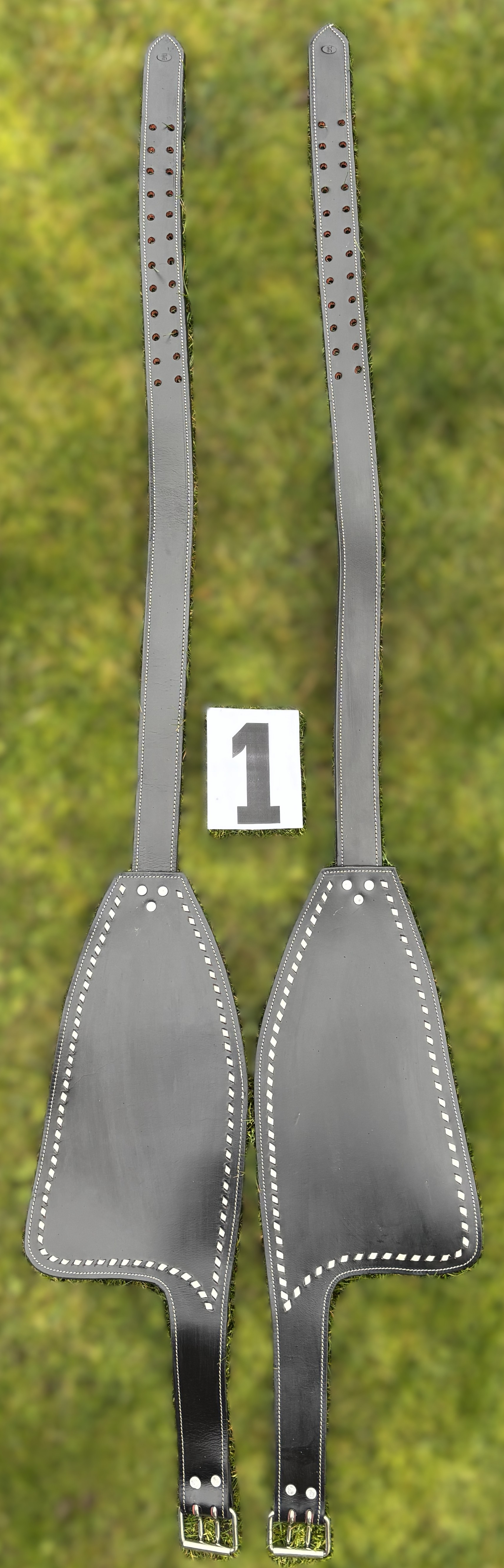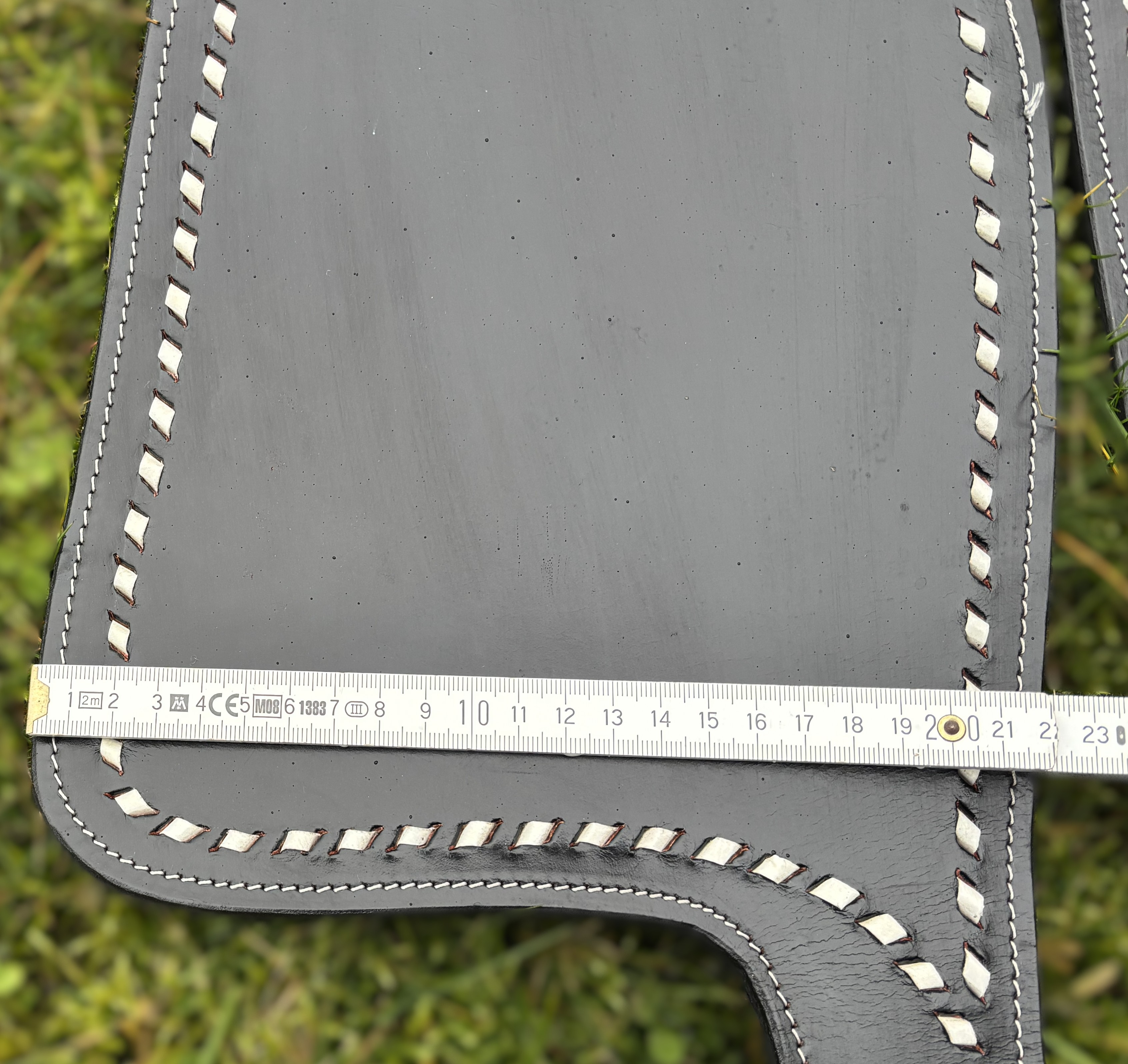 Kožené fendry/pár (třmenové řemeny) k westernovému sedlu, barevný MIX. Kožené díly jsou podlepené a podšité textilií, pro zabránění vytahávání kůže při zátěži. Zapínání řemene na klasickou dvoutrnovou přezku s rolnou. Celková délka cca.170cm, šířka řemene 4,8cm, délka fendrového listu 40cm, šířka fendrového listu 21-24cm, tloušťka kůže 0,5cm. Součástí jsou fendrové řemínky/pár k utažení třmenů. Ruční výroba.