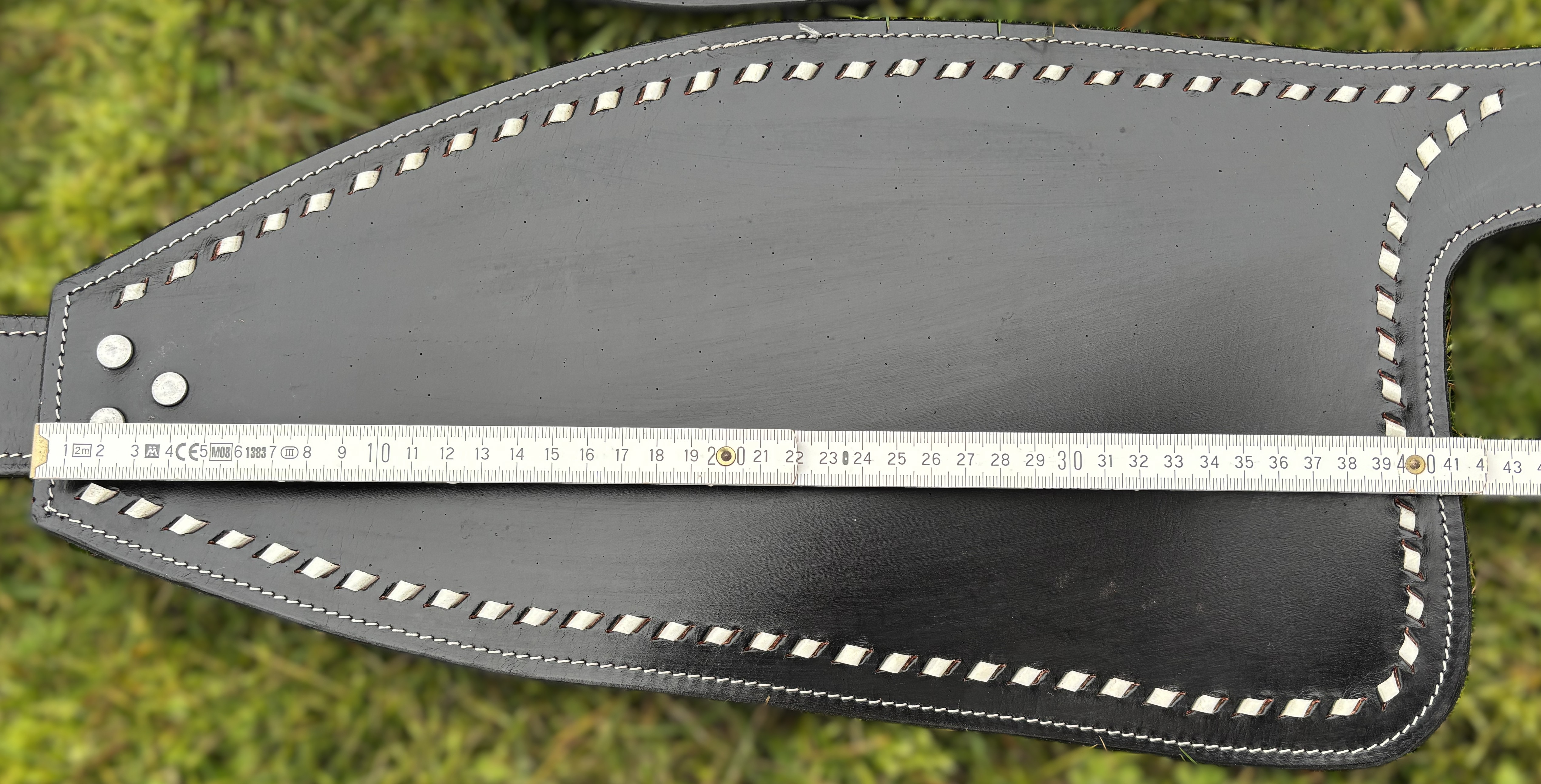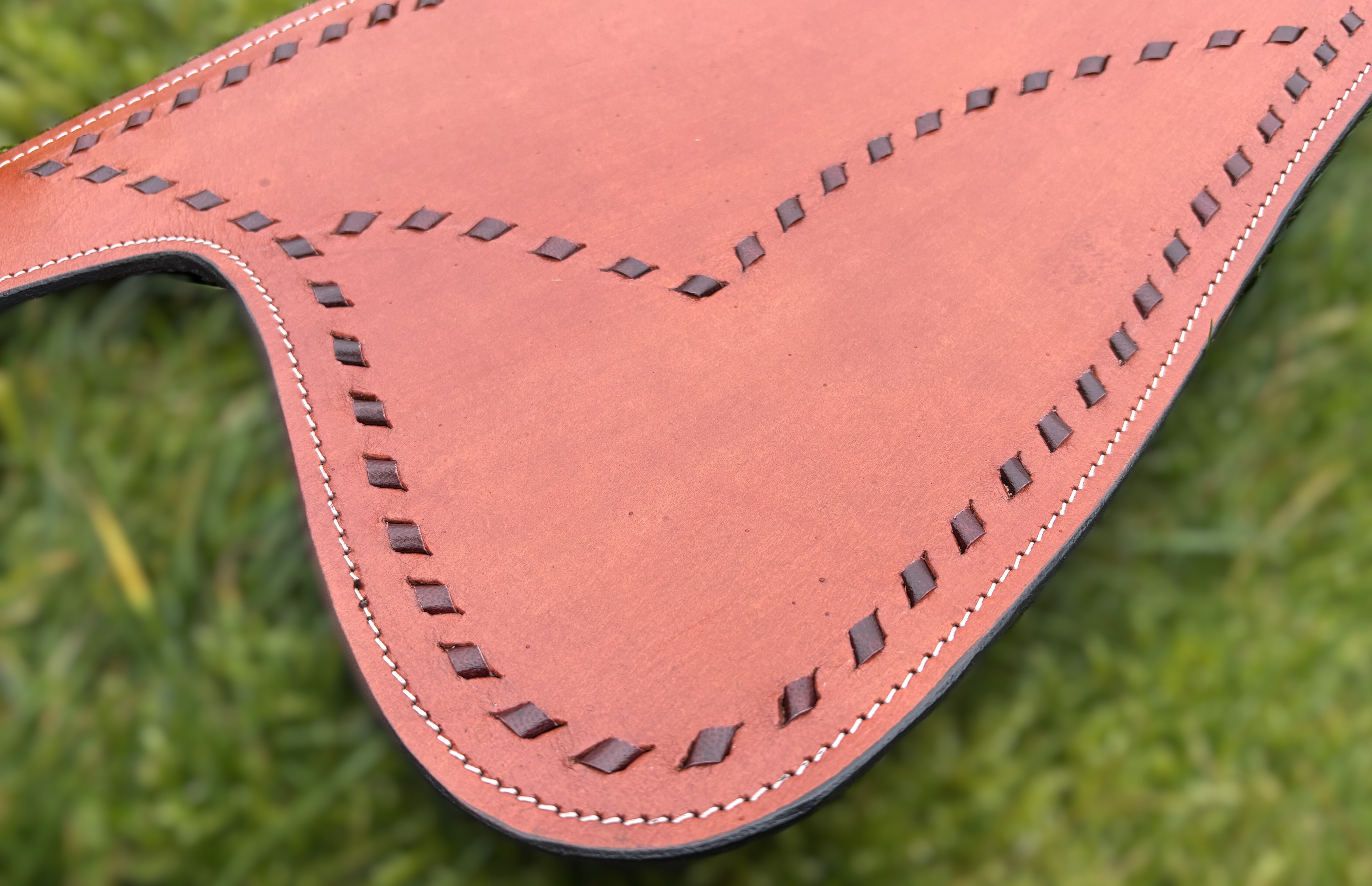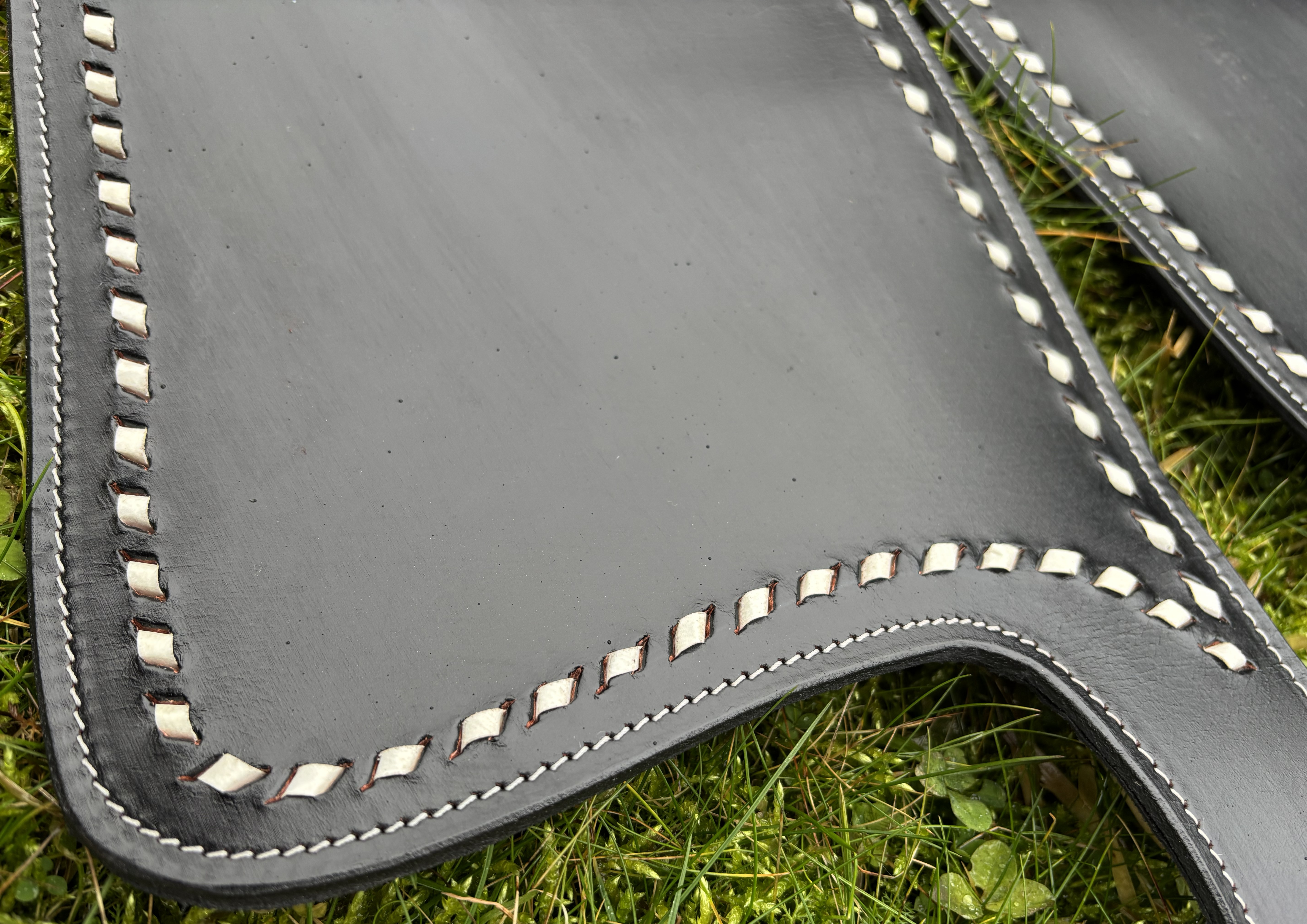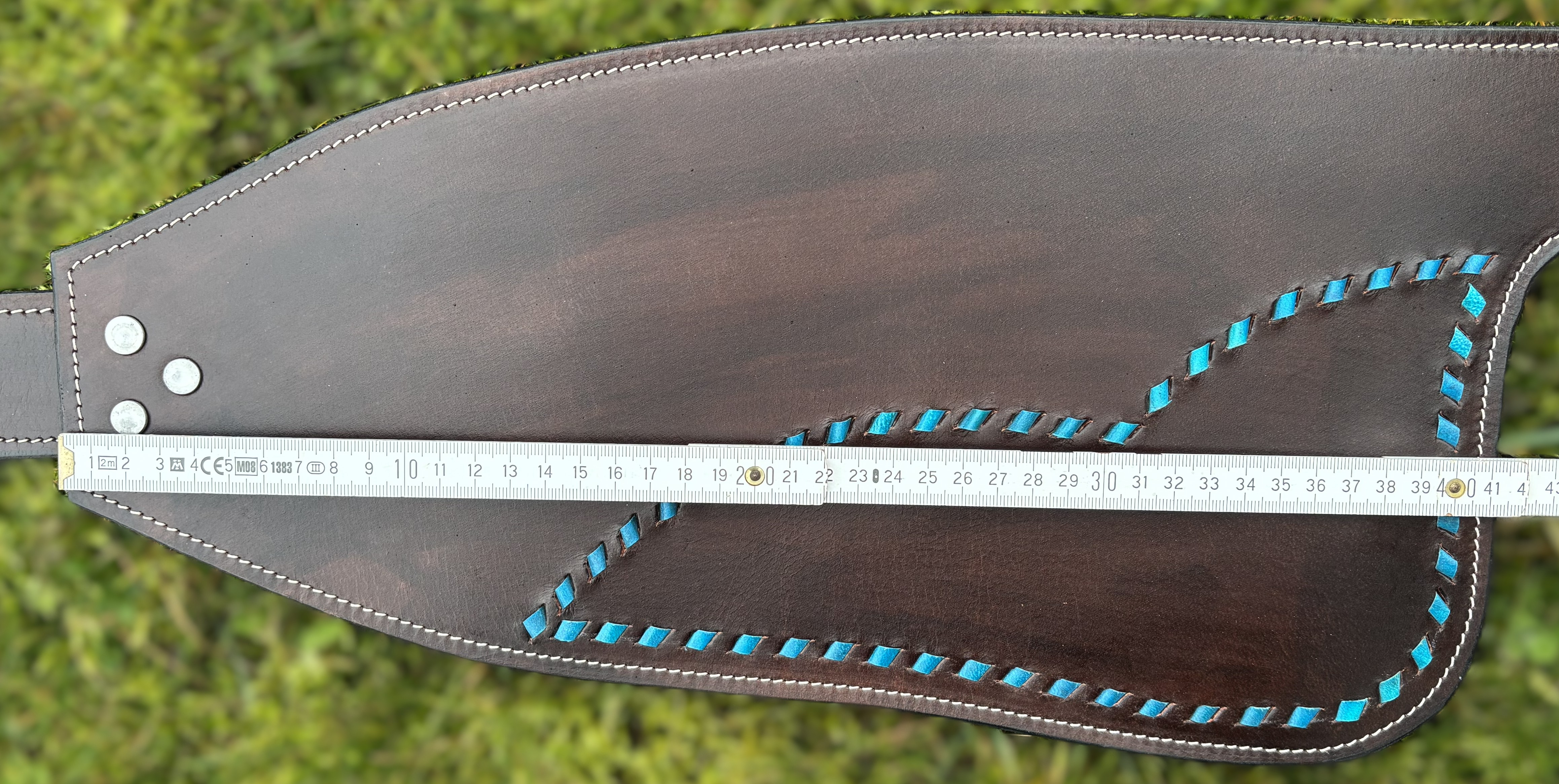 Kožené fendry/pár (třmenové řemeny) k westernovému sedlu, barevný MIX. Kožené díly jsou podlepené a podšité textilií, pro zabránění vytahávání kůže při zátěži. Zapínání řemene na klasickou dvoutrnovou přezku s rolnou. Celková délka cca.170cm, šířka řemene 4,8cm, délka fendrového listu 40cm, šířka fendrového listu 21-24cm, tloušťka kůže 0,5cm. Součástí jsou fendrové řemínky/pár k utažení třmenů. Ruční výroba.