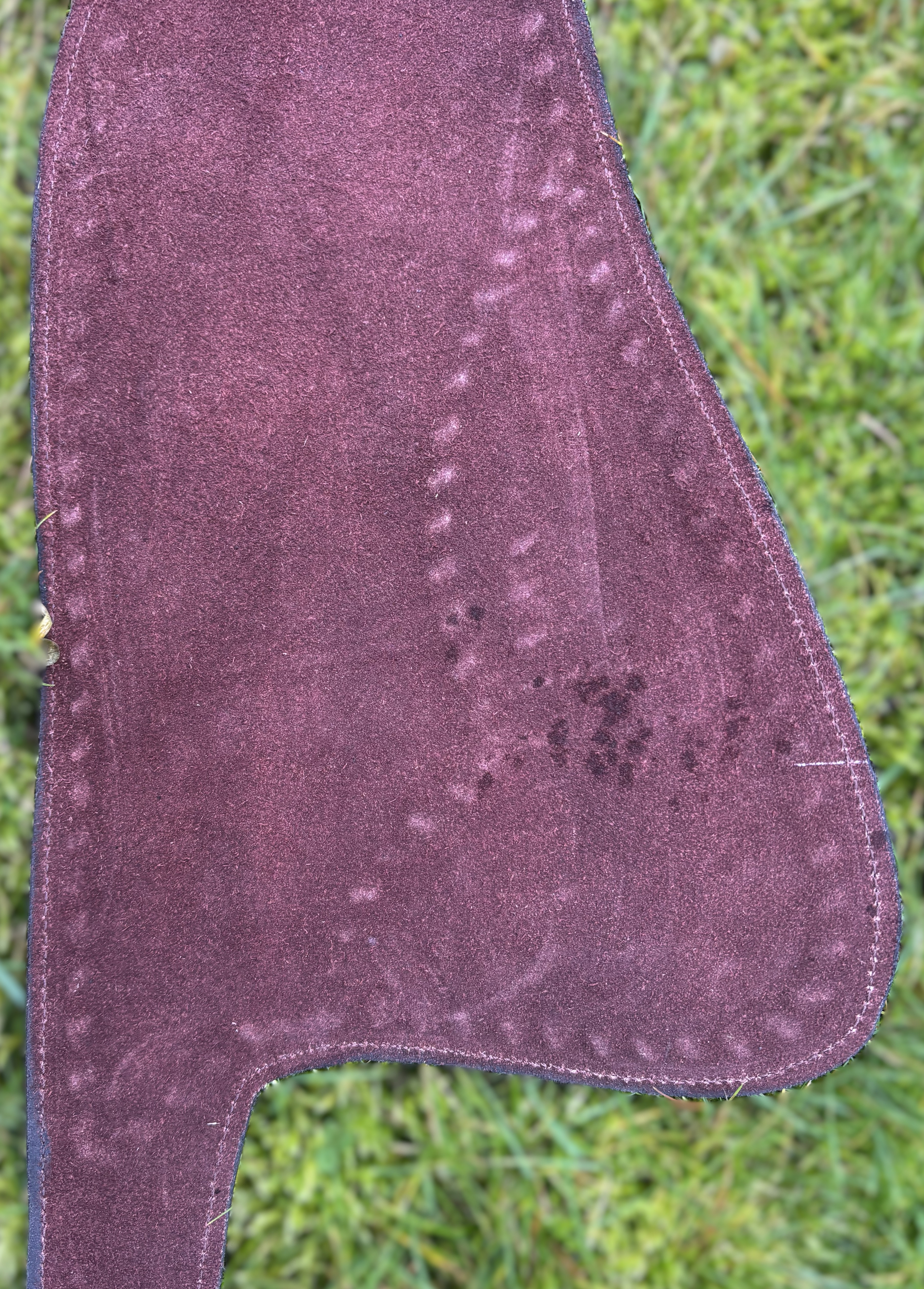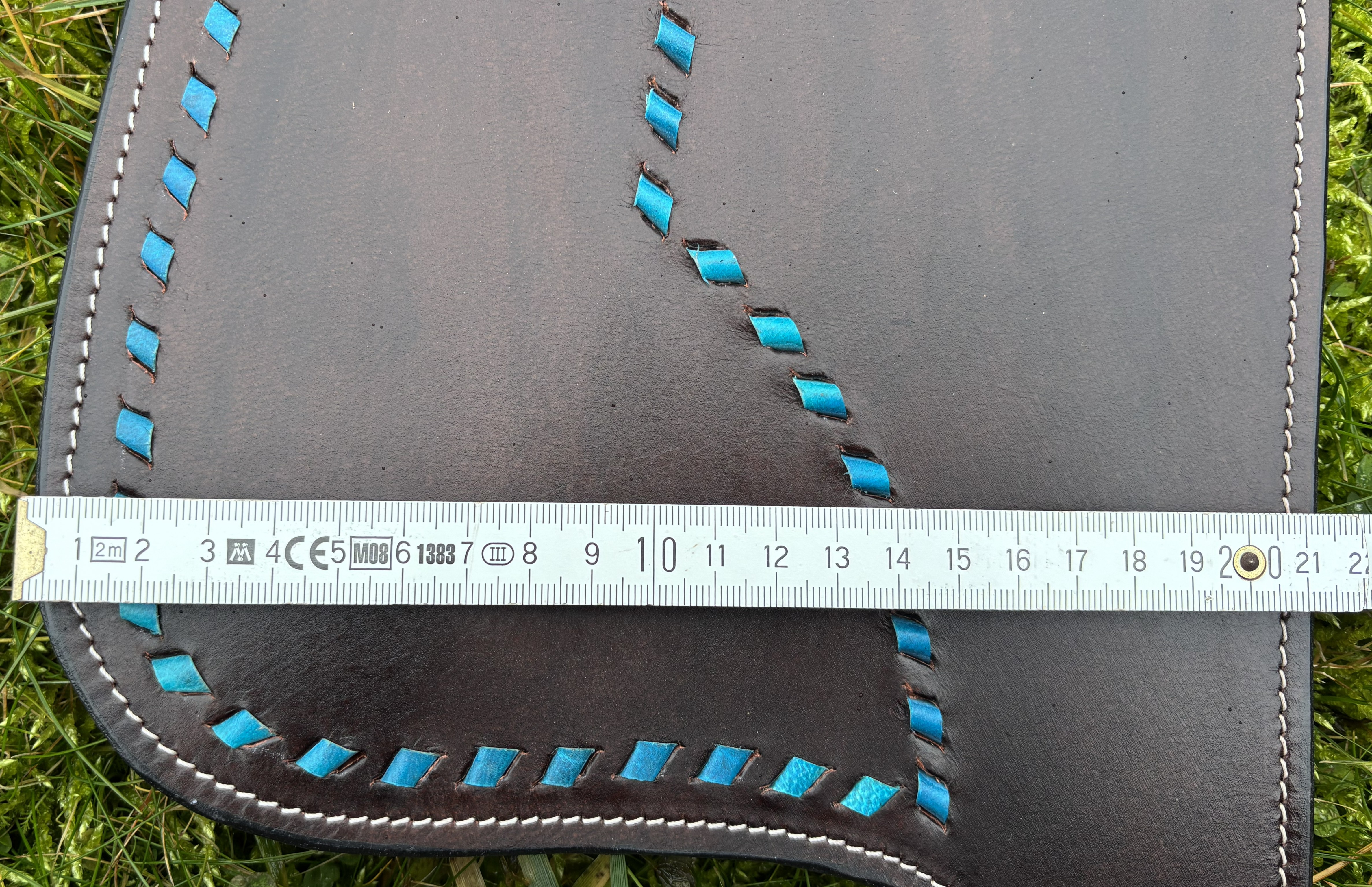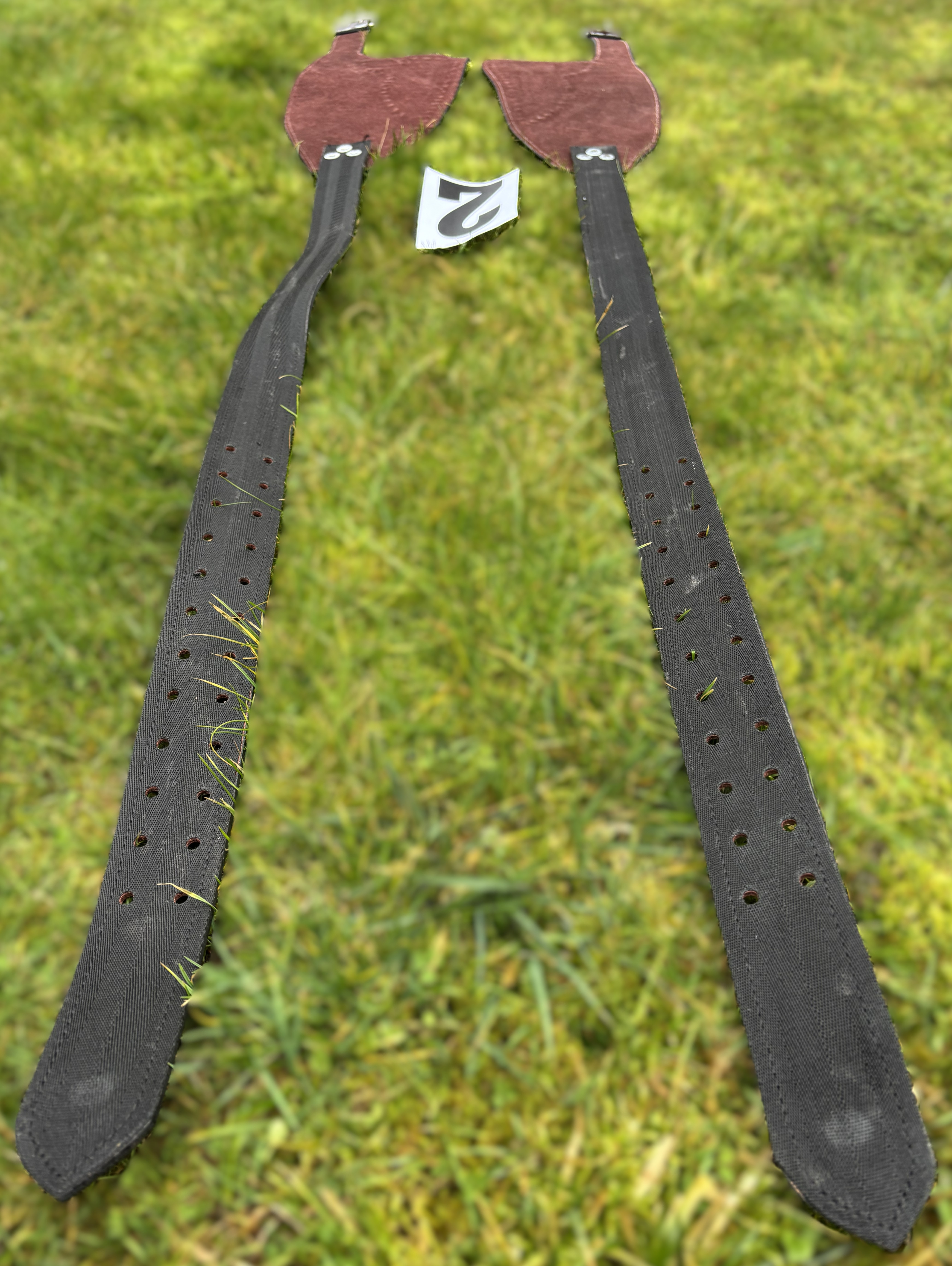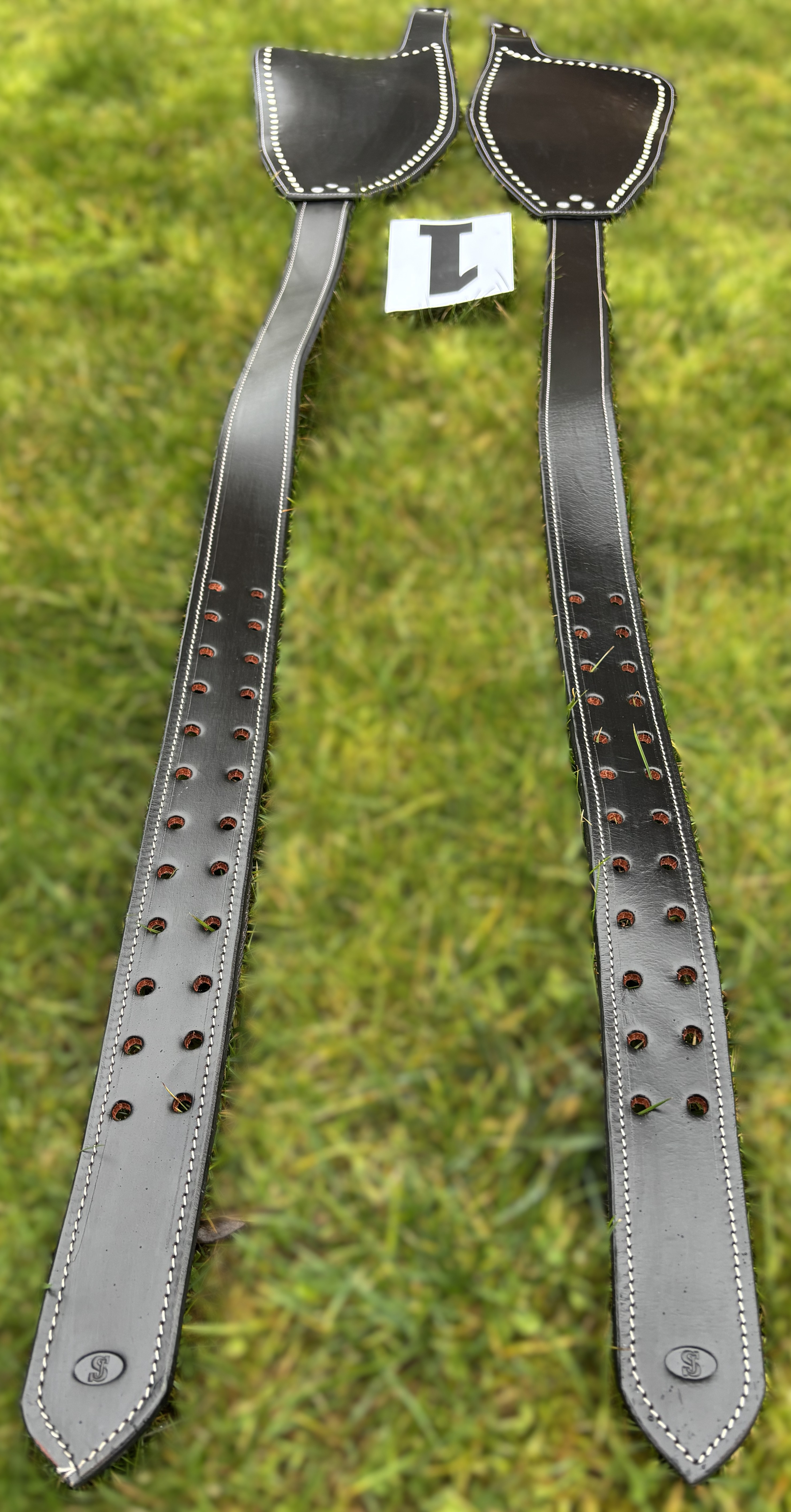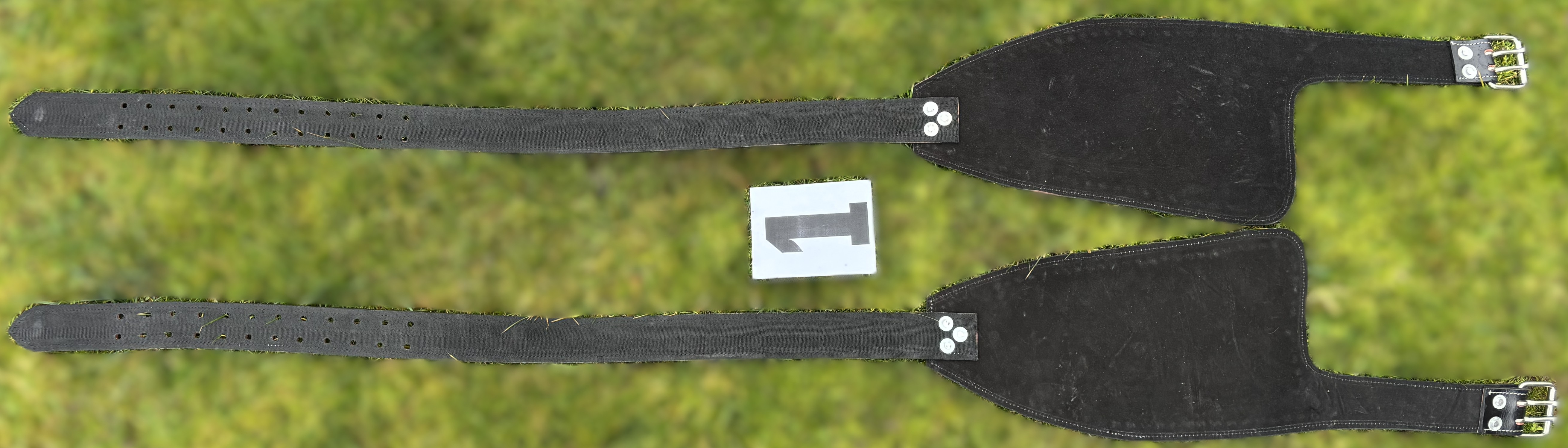 Kožené fendry/pár (třmenové řemeny) k westernovému sedlu, barevný MIX. Kožené díly jsou podlepené a podšité textilií, pro zabránění vytahávání kůže při zátěži. Zapínání řemene na klasickou dvoutrnovou přezku s rolnou. Celková délka cca.170cm, šířka řemene 4,8cm, délka fendrového listu 40cm, šířka fendrového listu 21-24cm, tloušťka kůže 0,5cm. Součástí jsou fendrové řemínky/pár k utažení třmenů. Ruční výroba.