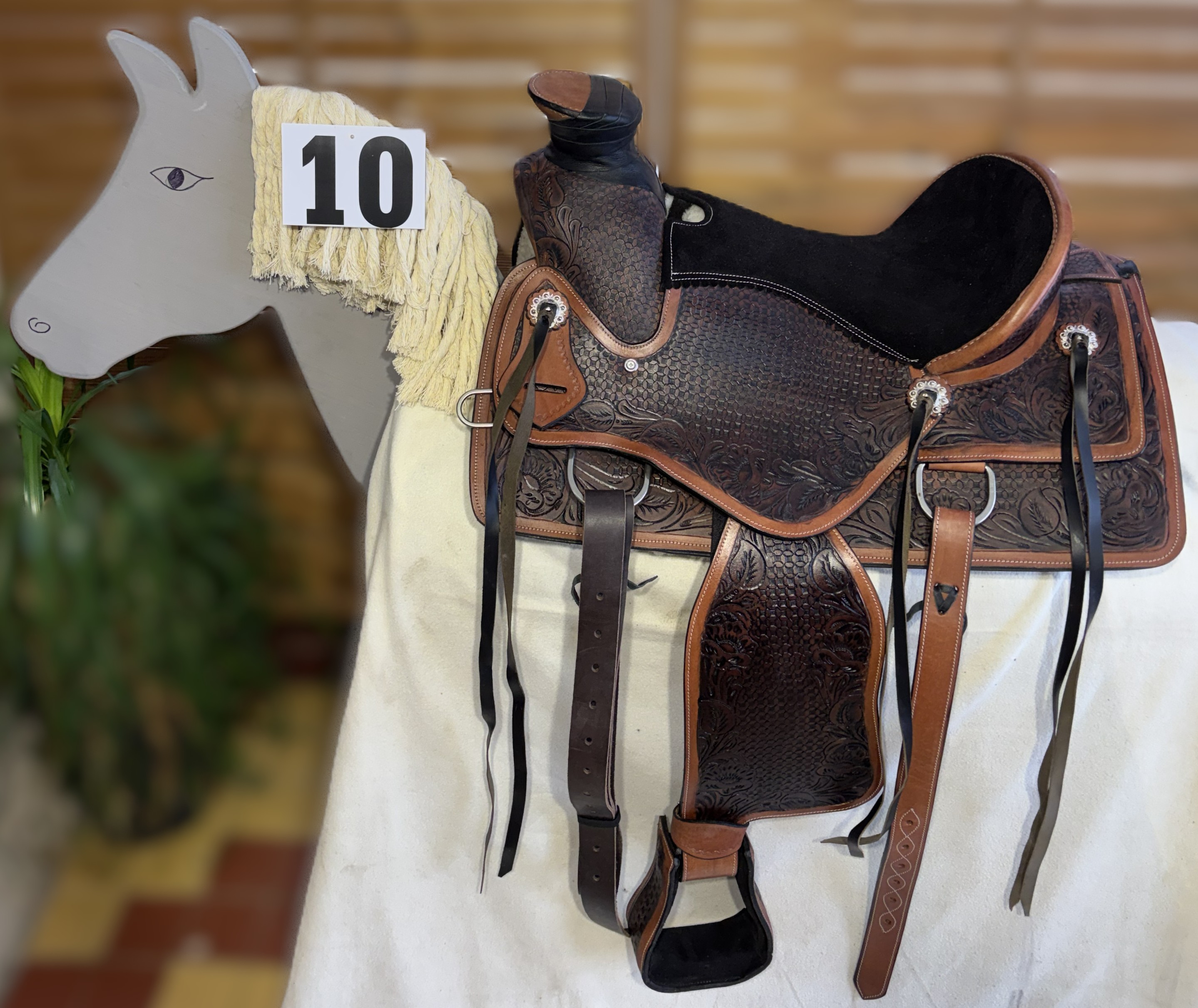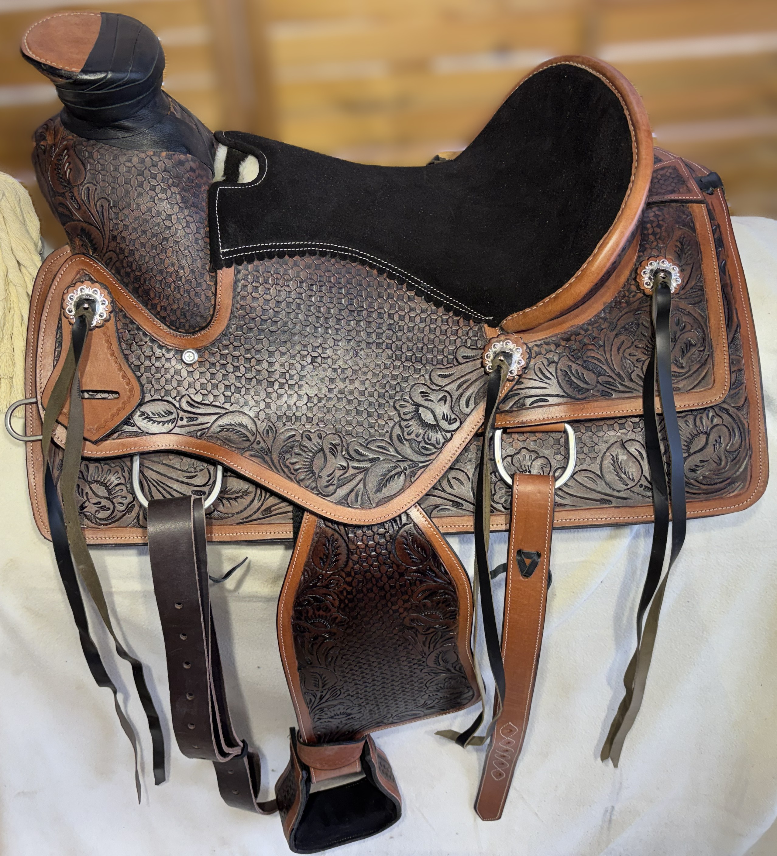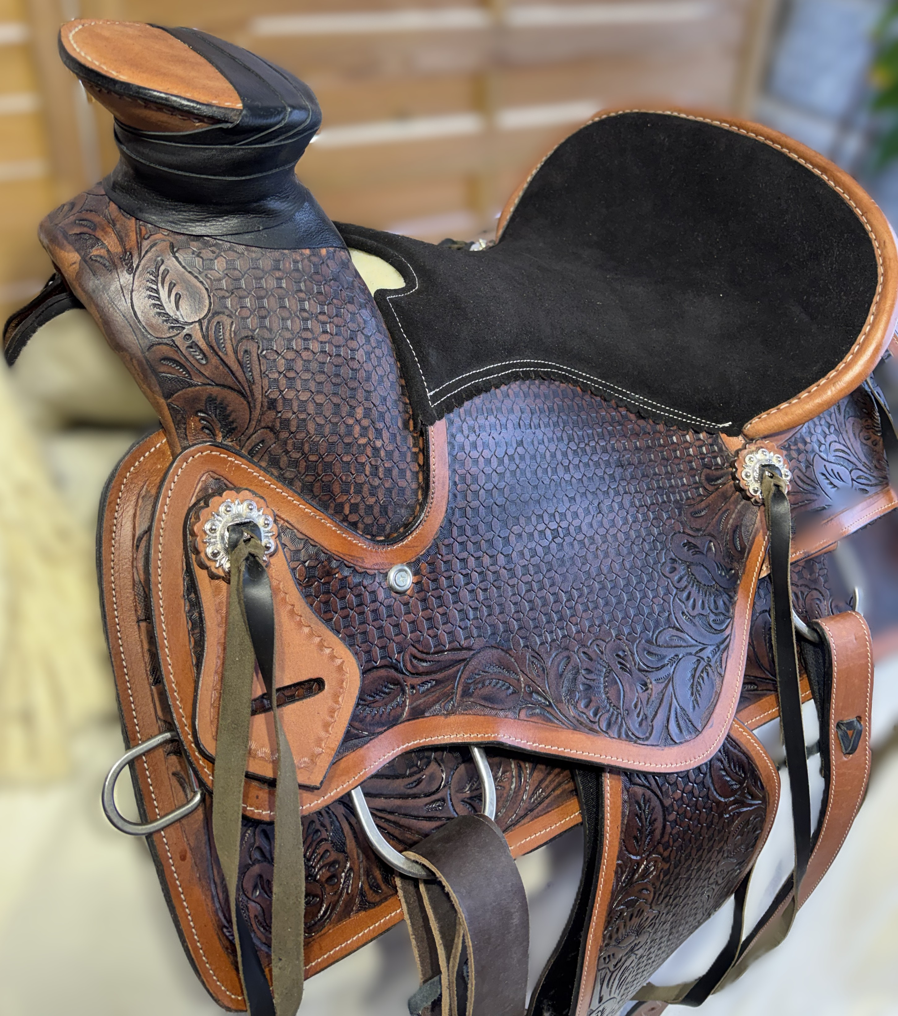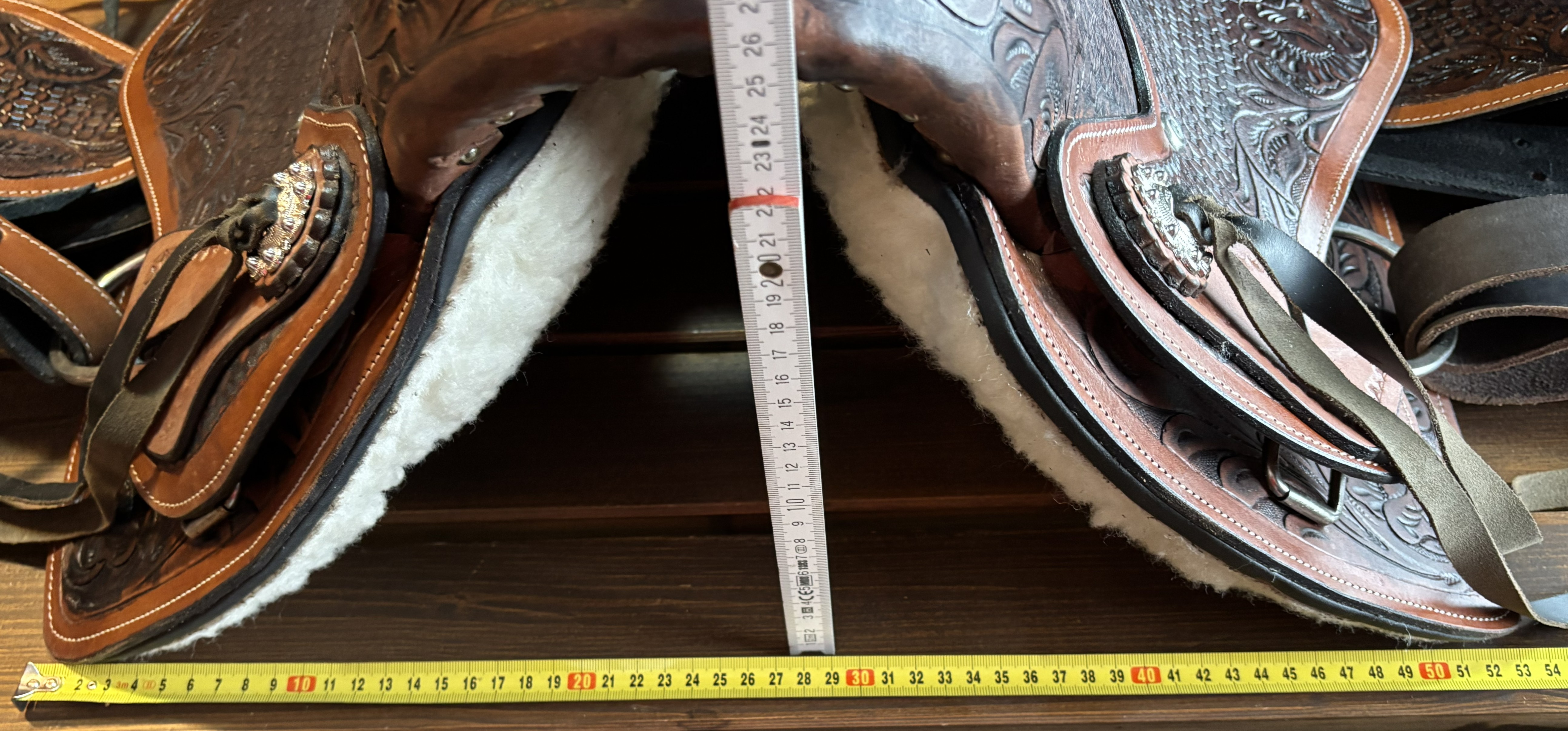 Westernové sedlo-komplet č.10) WADE v tmavě hnědé barvě se světlým lemovánín, s černým měkčeným sedem z "nubuk" kůže bez prošívání. Velikost sedla je Full/QH, 16” (40,5cm) v sedu, gulett/komorou 7” (18cm). Celková délka sedla je 67cm. Sedlo je v plné dekoraci v kombinacích Floral/Basket, s tmavým barvením. Kvalitní a silná kůže na Fiber-glass kostře (lehké, pružné a pevné). Jednoduchý systém posouvání délky fendrových řemenů přes klasickou přezku. Sedlo je zkompletováno se: Zadními sedlovými řemeny k zadnímu podbřišníku. Uzdečkou, poprsníkem a otěžemi vše v barvě i dekoraci sedla. Předním provázkovým podbřišníkem a zadním koženým podbřišníkem s propojovacím řemínkem. Ruční výroba.