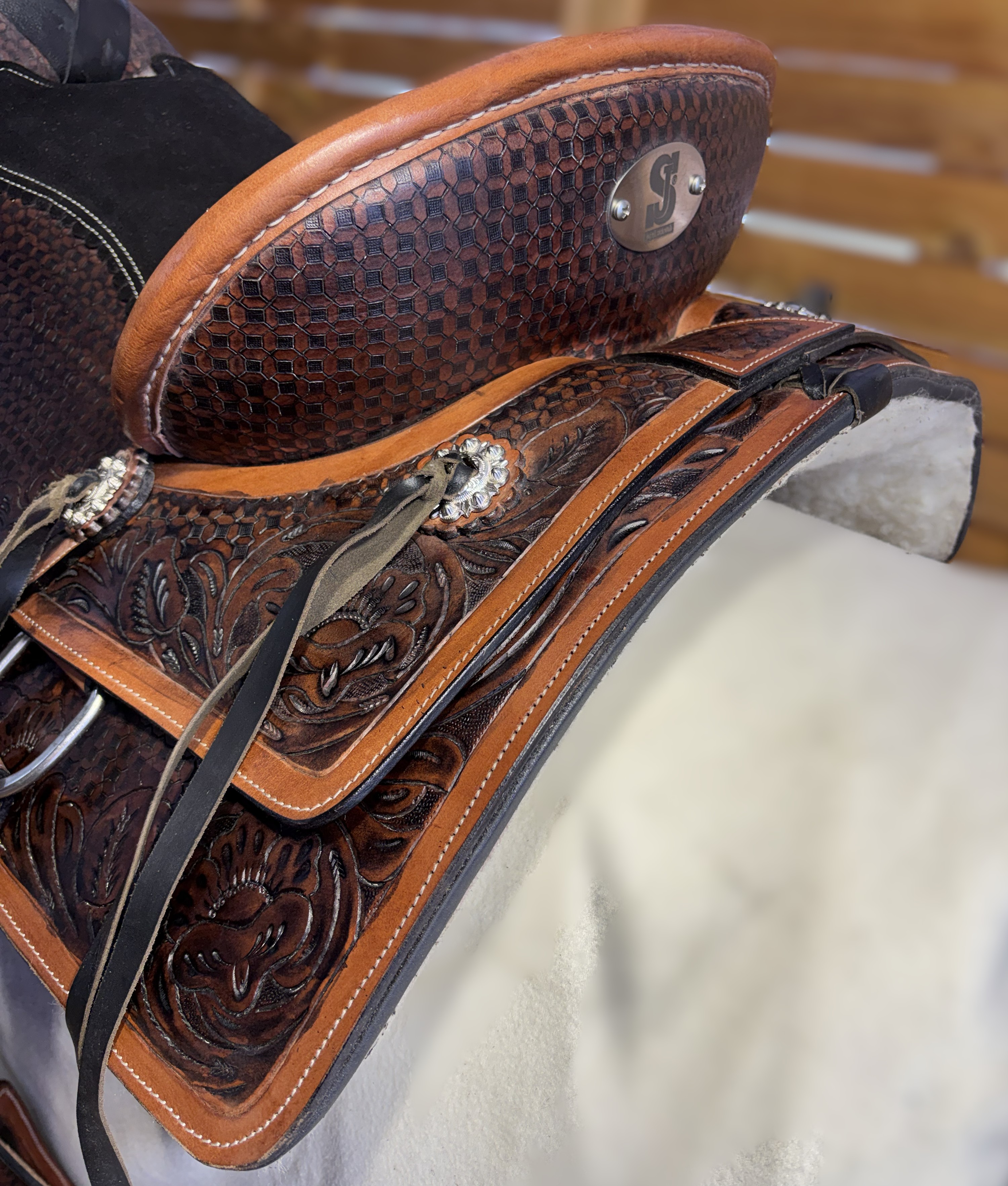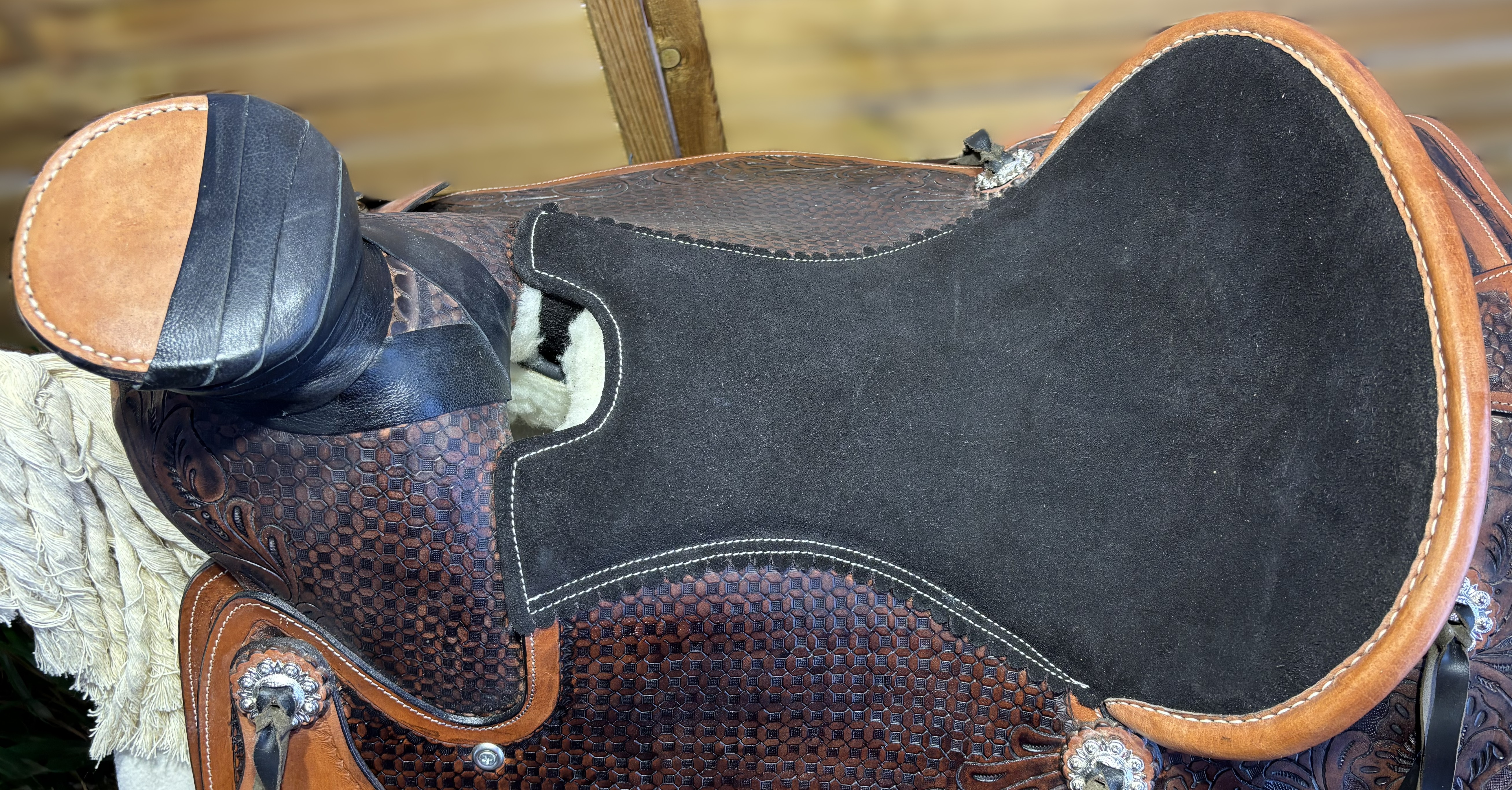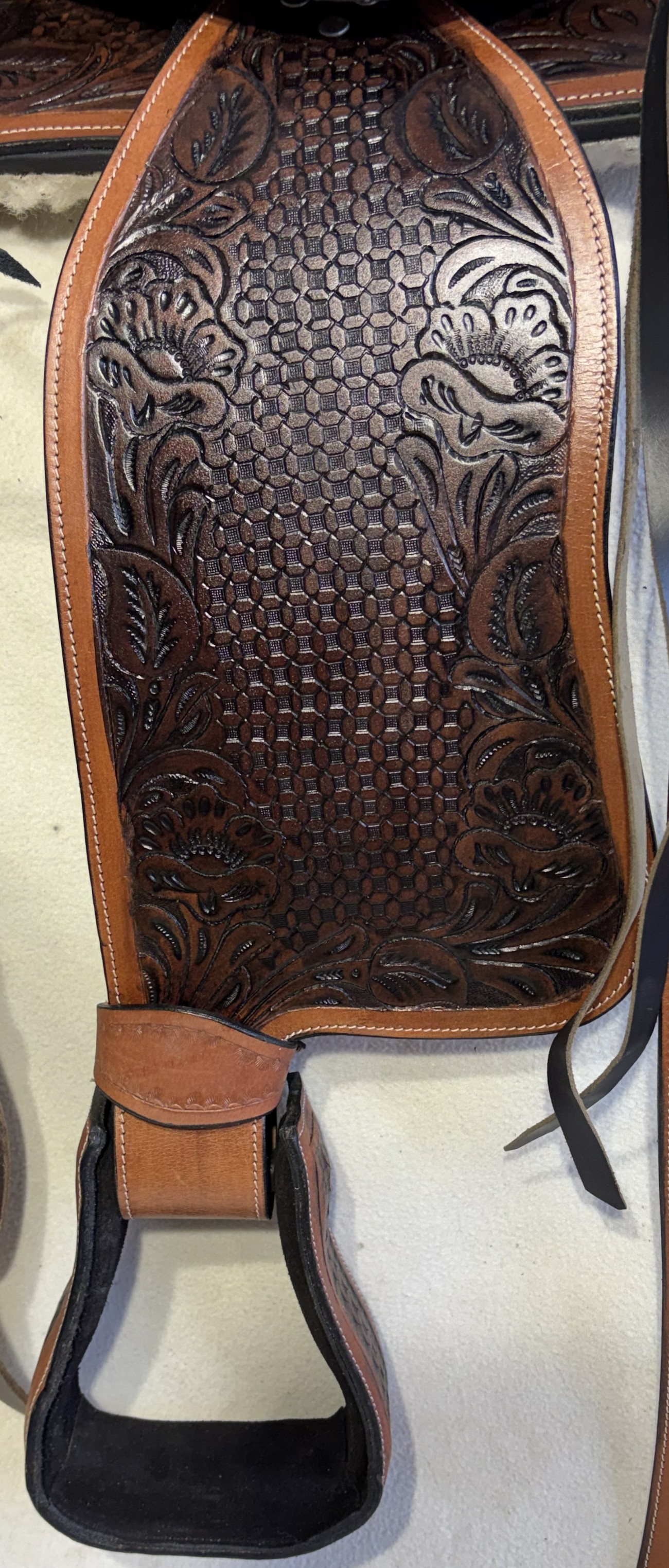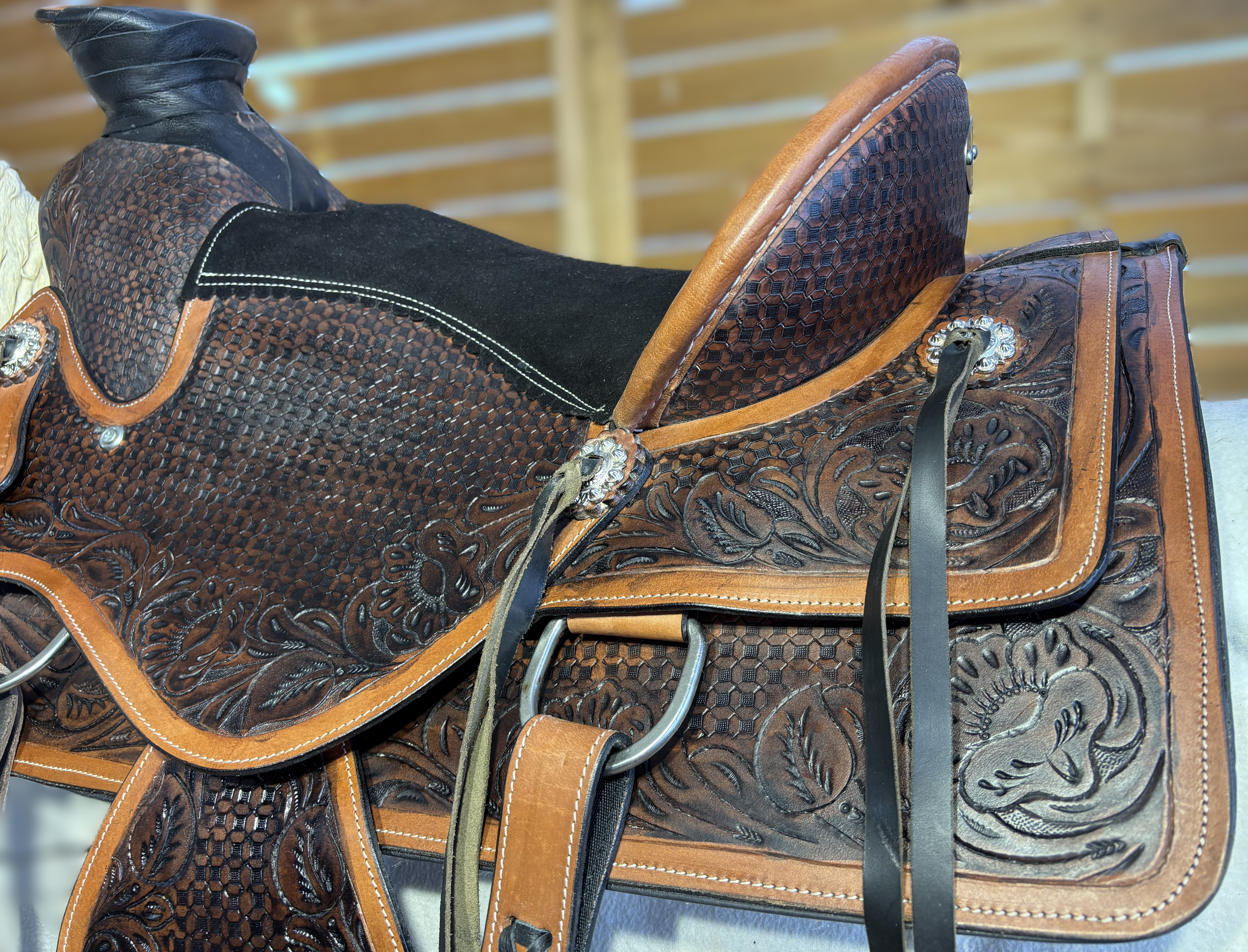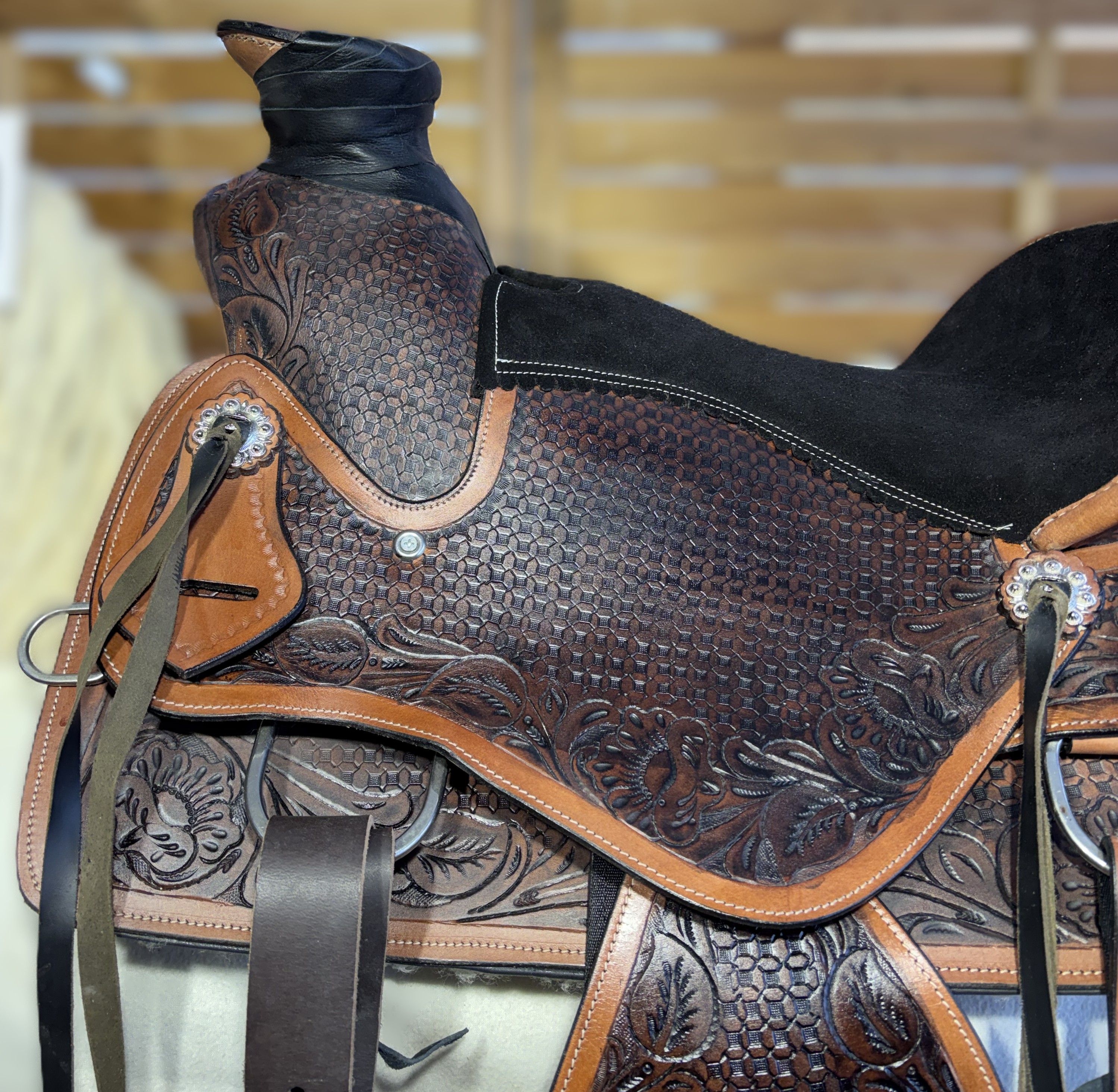 Westernové sedlo-komplet č.10) WADE v tmavě hnědé barvě se světlým lemovánín, s černým měkčeným sedem z "nubuk" kůže bez prošívání. Velikost sedla je Full/QH, 16” (40,5cm) v sedu, gulett/komorou 7” (18cm). Celková délka sedla je 67cm. Sedlo je v plné dekoraci v kombinacích Floral/Basket, s tmavým barvením. Kvalitní a silná kůže na Fiber-glass kostře (lehké, pružné a pevné). Jednoduchý systém posouvání délky fendrových řemenů přes klasickou přezku. Sedlo je zkompletováno se: Zadními sedlovými řemeny k zadnímu podbřišníku. Uzdečkou, poprsníkem a otěžemi vše v barvě i dekoraci sedla. Předním provázkovým podbřišníkem a zadním koženým podbřišníkem s propojovacím řemínkem. Ruční výroba.