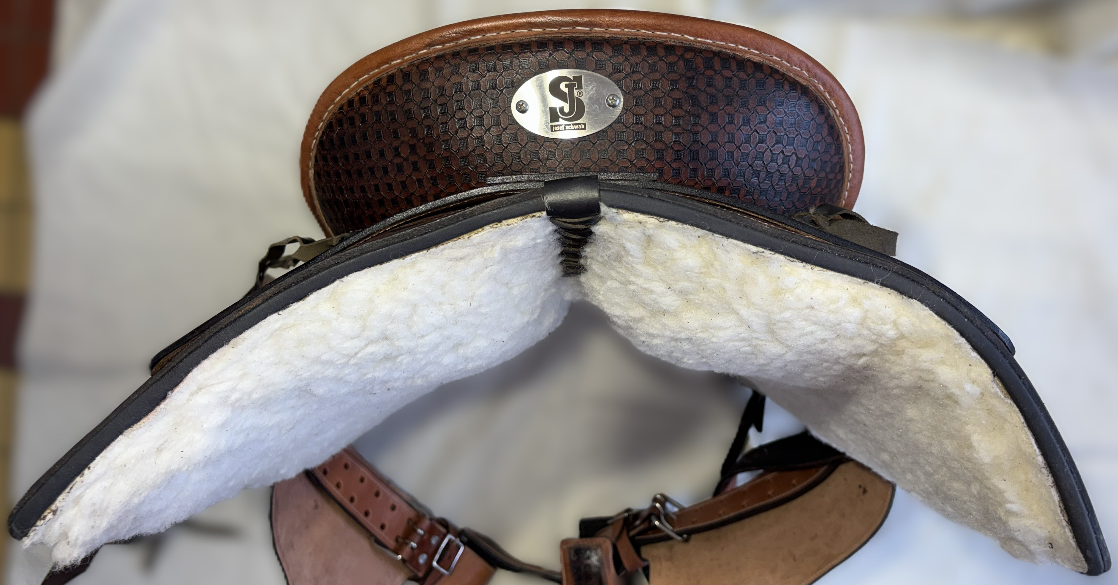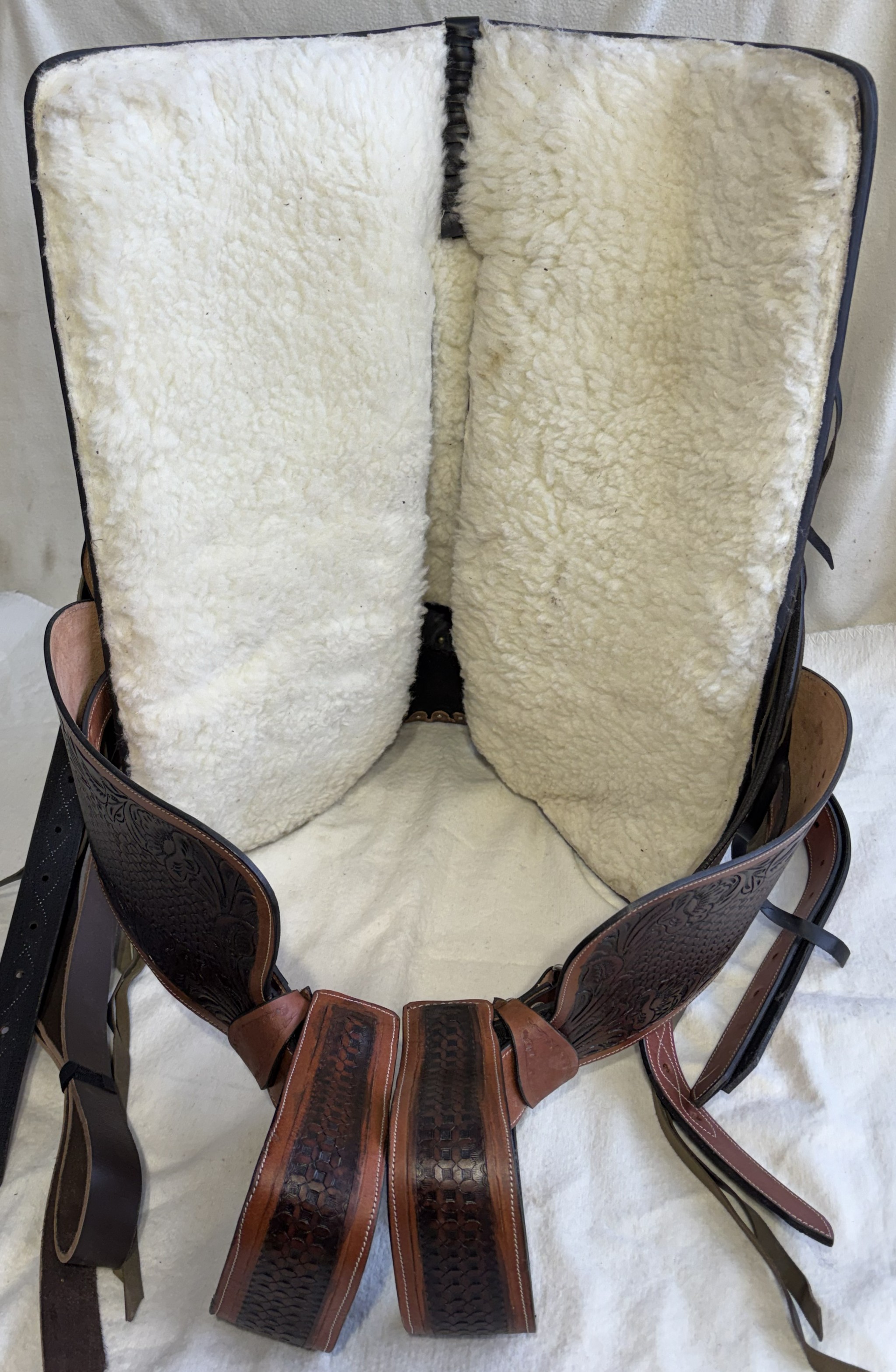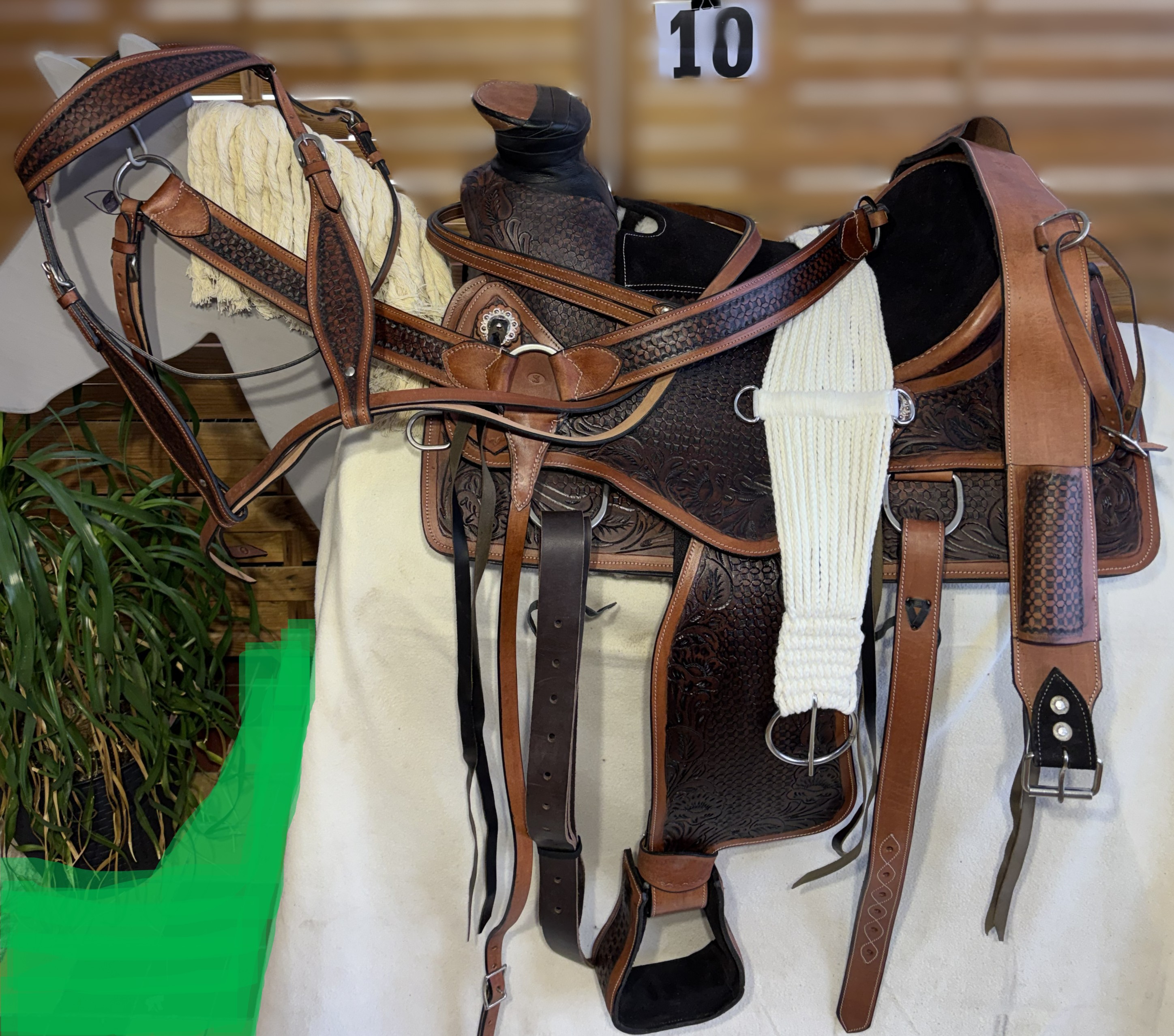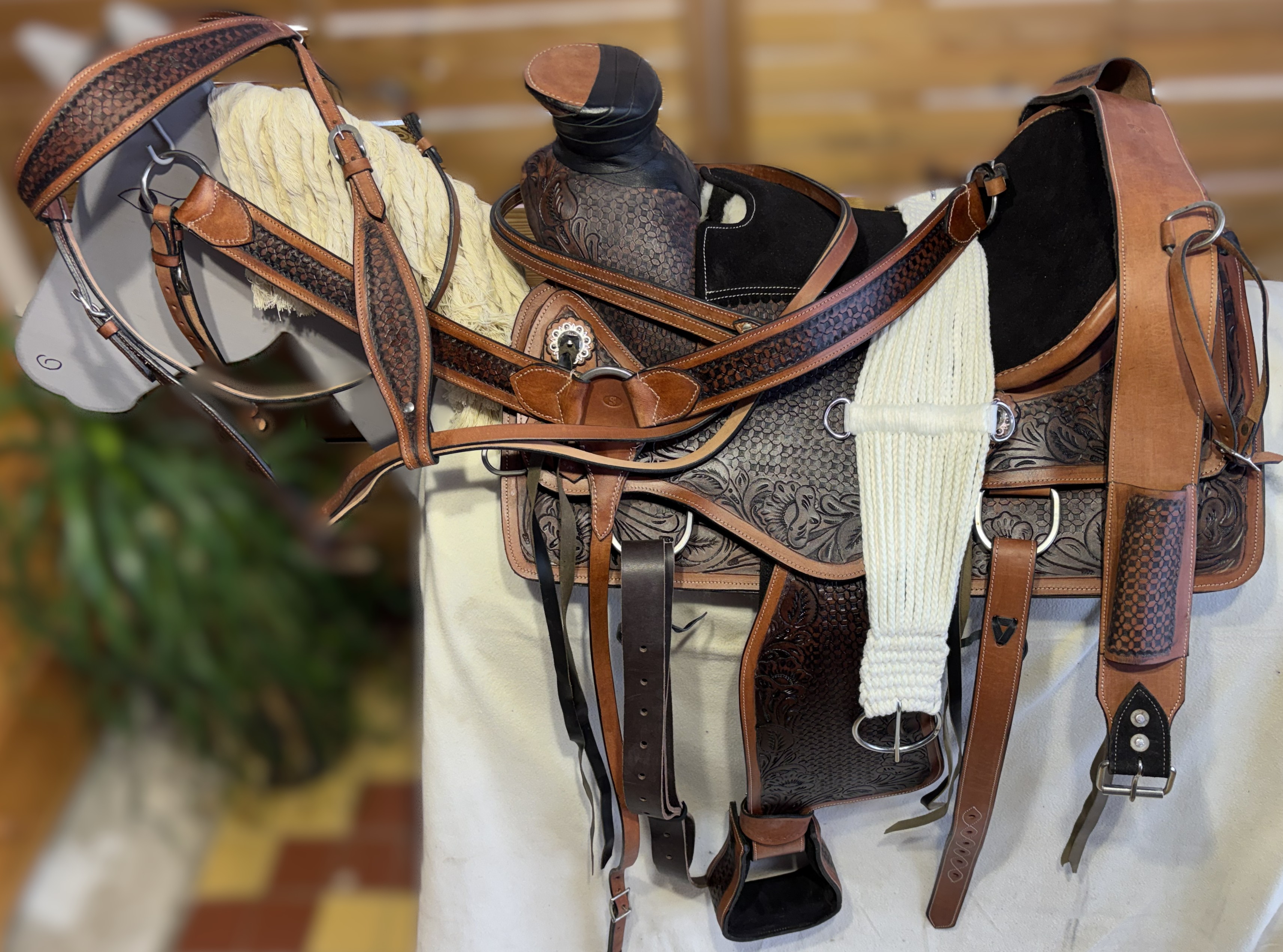 Westernové sedlo-komplet č.10) WADE v tmavě hnědé barvě se světlým lemovánín, s černým měkčeným sedem z "nubuk" kůže bez prošívání. Velikost sedla je Full/QH, 16” (40,5cm) v sedu, gulett/komorou 7” (18cm). Celková délka sedla je 67cm. Sedlo je v plné dekoraci v kombinacích Floral/Basket, s tmavým barvením. Kvalitní a silná kůže na Fiber-glass kostře (lehké, pružné a pevné). Jednoduchý systém posouvání délky fendrových řemenů přes klasickou přezku. Sedlo je zkompletováno se: Zadními sedlovými řemeny k zadnímu podbřišníku. Uzdečkou, poprsníkem a otěžemi vše v barvě i dekoraci sedla. Předním provázkovým podbřišníkem a zadním koženým podbřišníkem s propojovacím řemínkem. Ruční výroba.