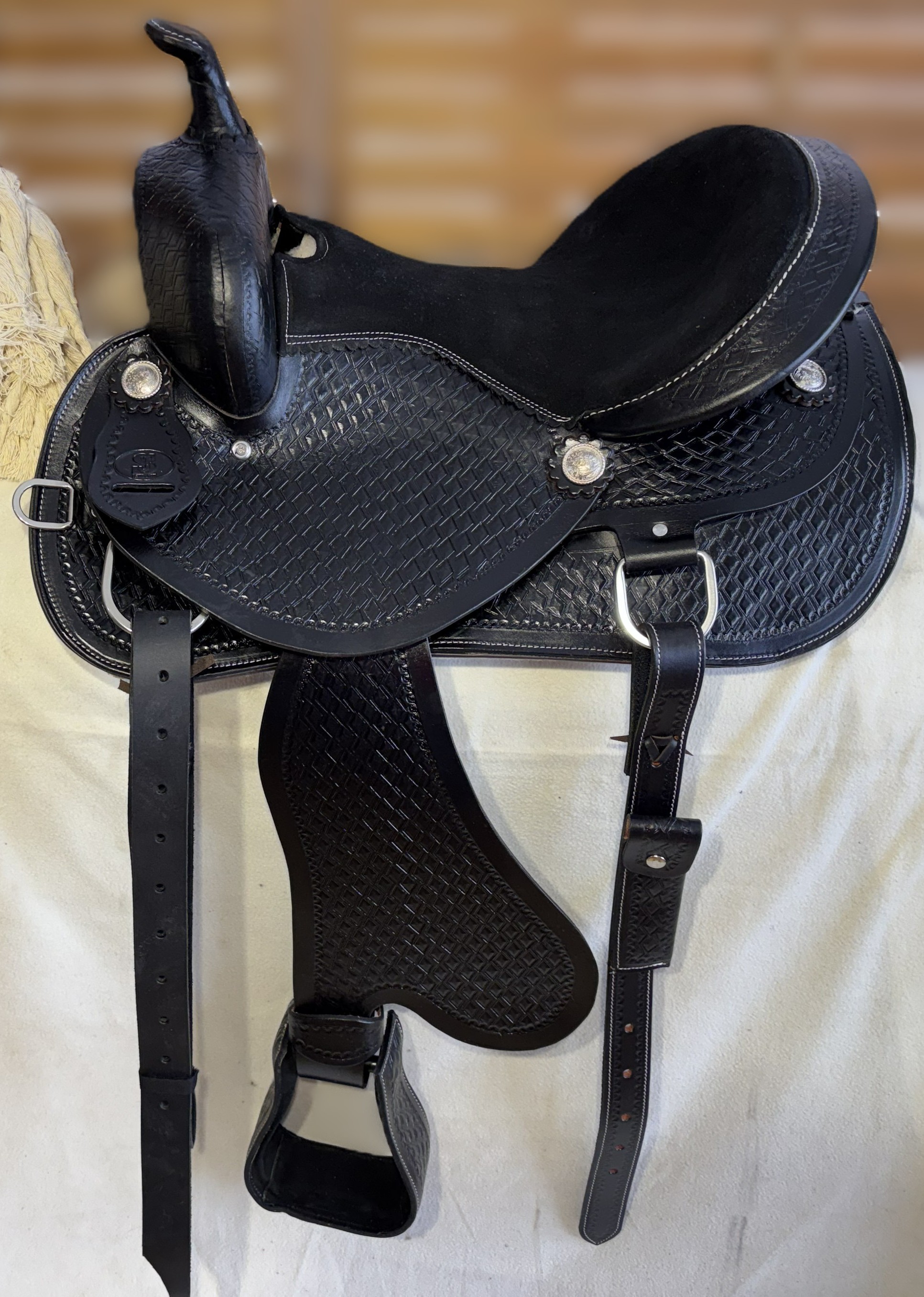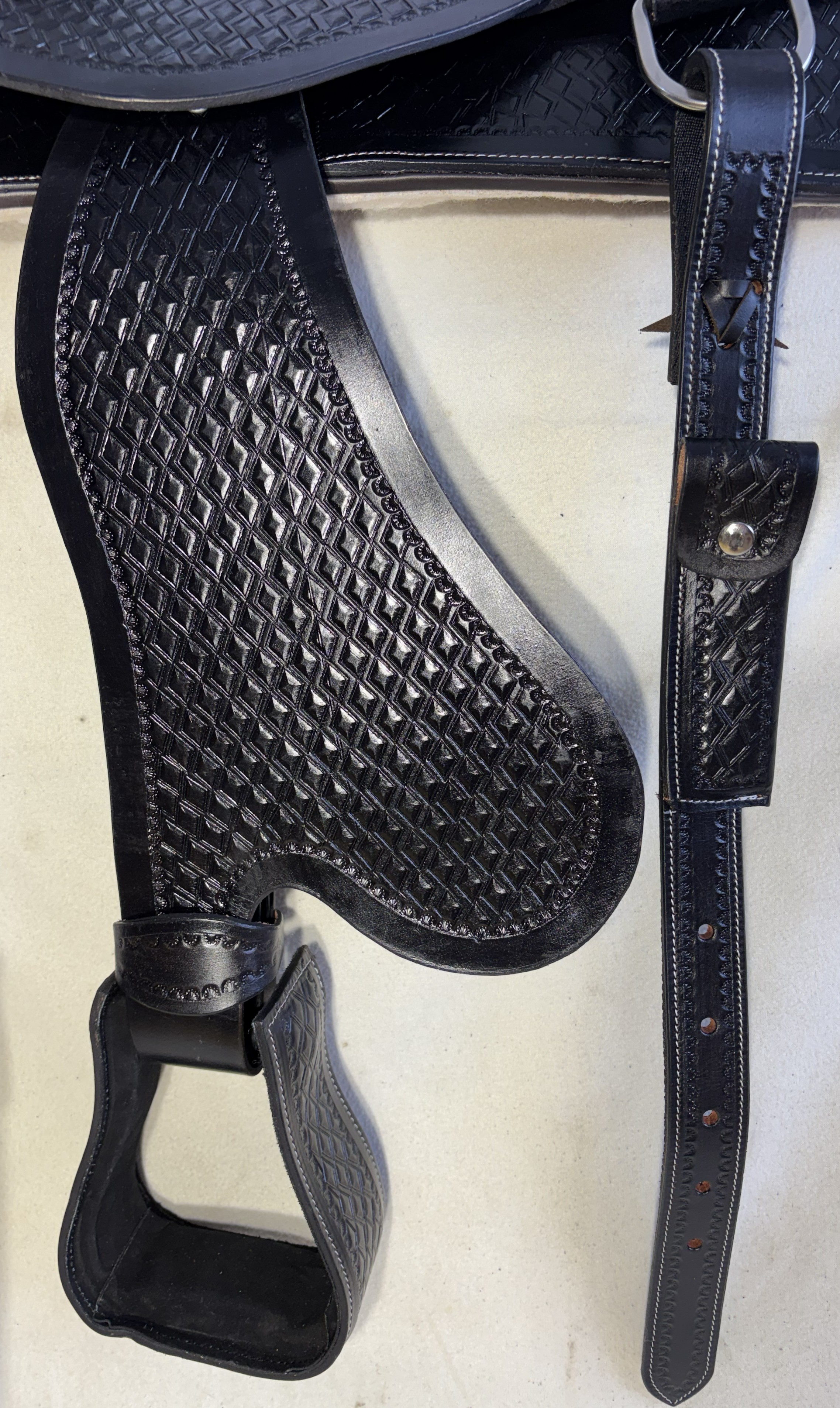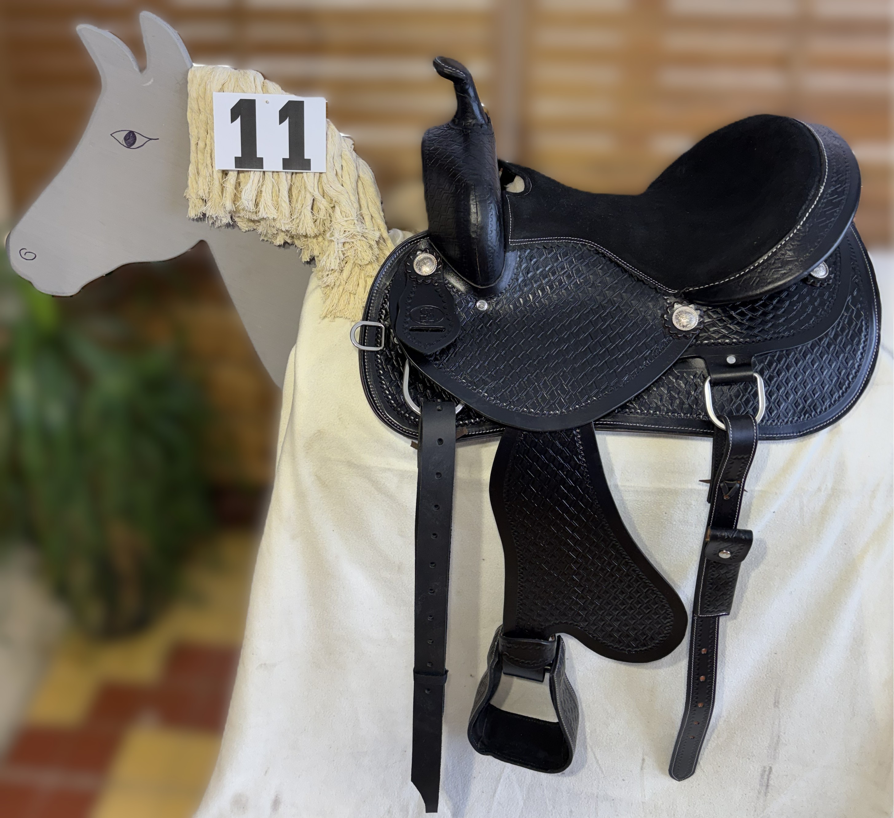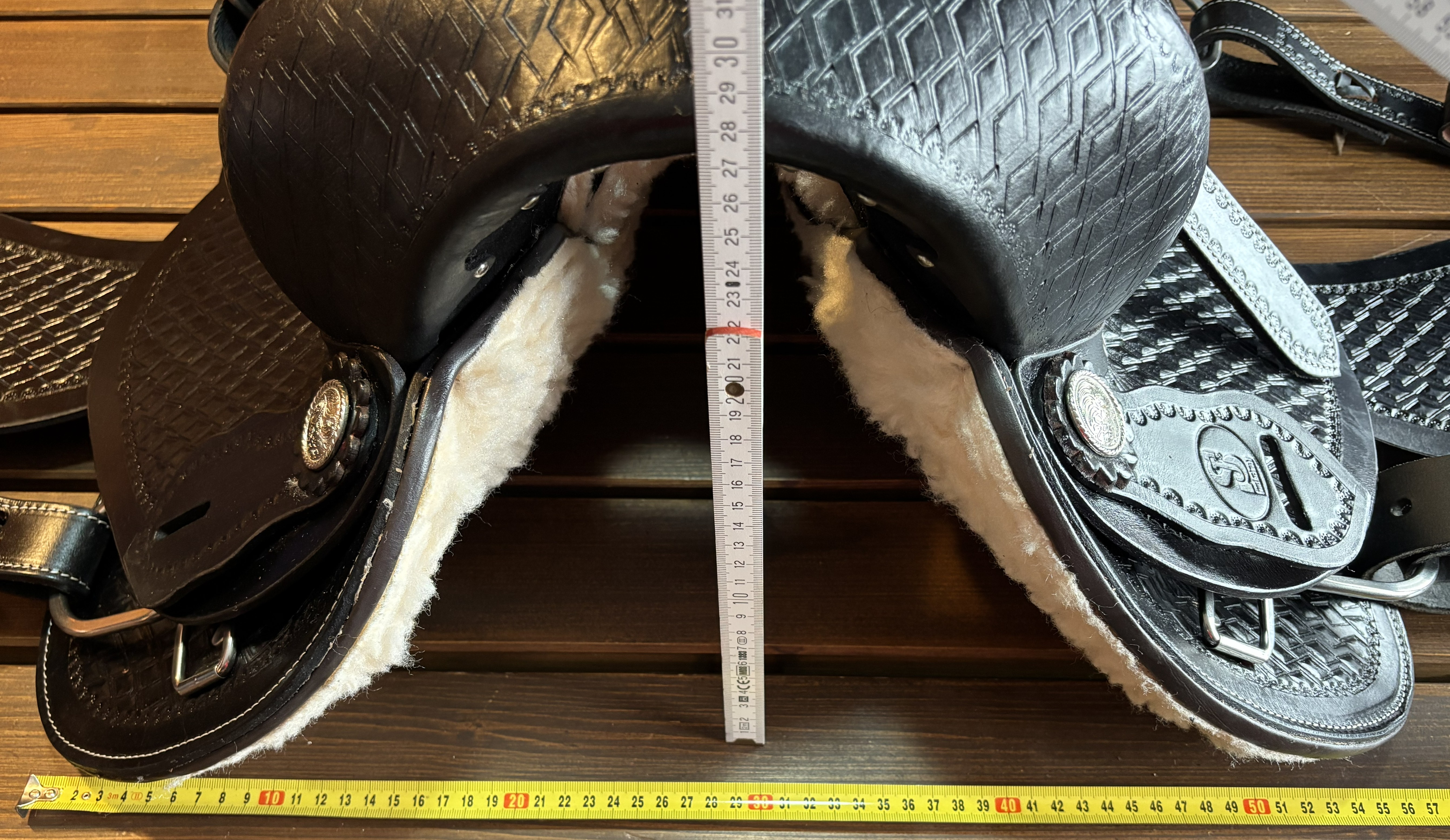 Westernové sedlo-komplet č.11) v černé barvě. Velikost sedel je Full/QH, 16” (40,5cm) i 17” (43cm) v sedu, a gulett/komorou 8” (20cm). Celková délka sedla je 66cm. Sedlo je v plné dekoraci Basket. Černý měkčený sed z "nubuk" kůže bez prošívání. Kvalitní a silná kůže na Fiber-glass kostře (lehké, pružné a pevné). Jednoduchý systém posouvání délky fendrových řemenů přes klasickou přezku. Sedlo je zkompletováno se: Zadními sedlovými řemeny k zadnímu podbřišníku, na levém řemenu s pouzdrem. Uzdečkou, poprsníkem a otěžemi vše v barvě i dekoraci sedla. Předním provázkovým podbřišníkem a zadním koženým podbřišníkem s propojovacím řemínkem. Ruční výroba.