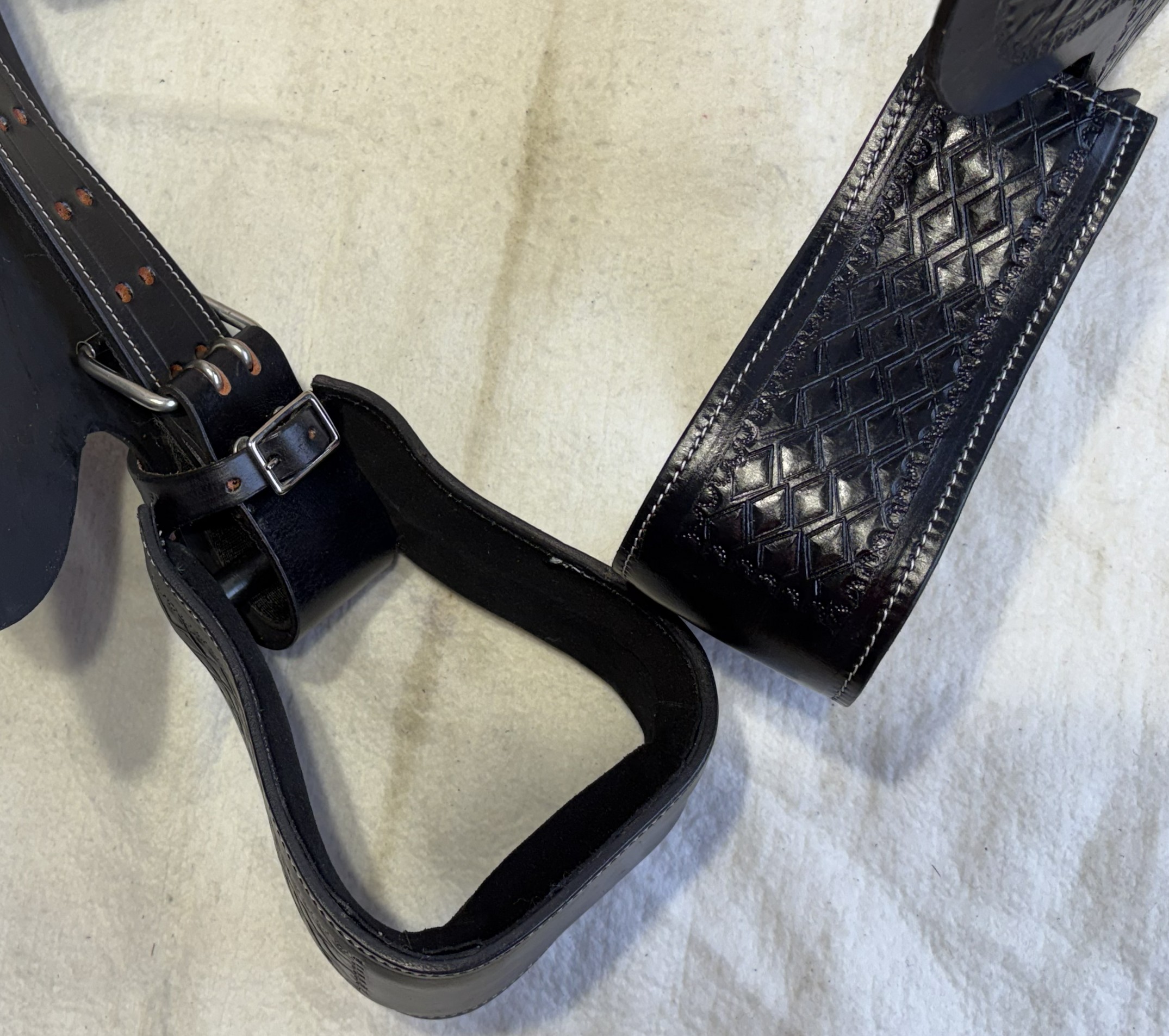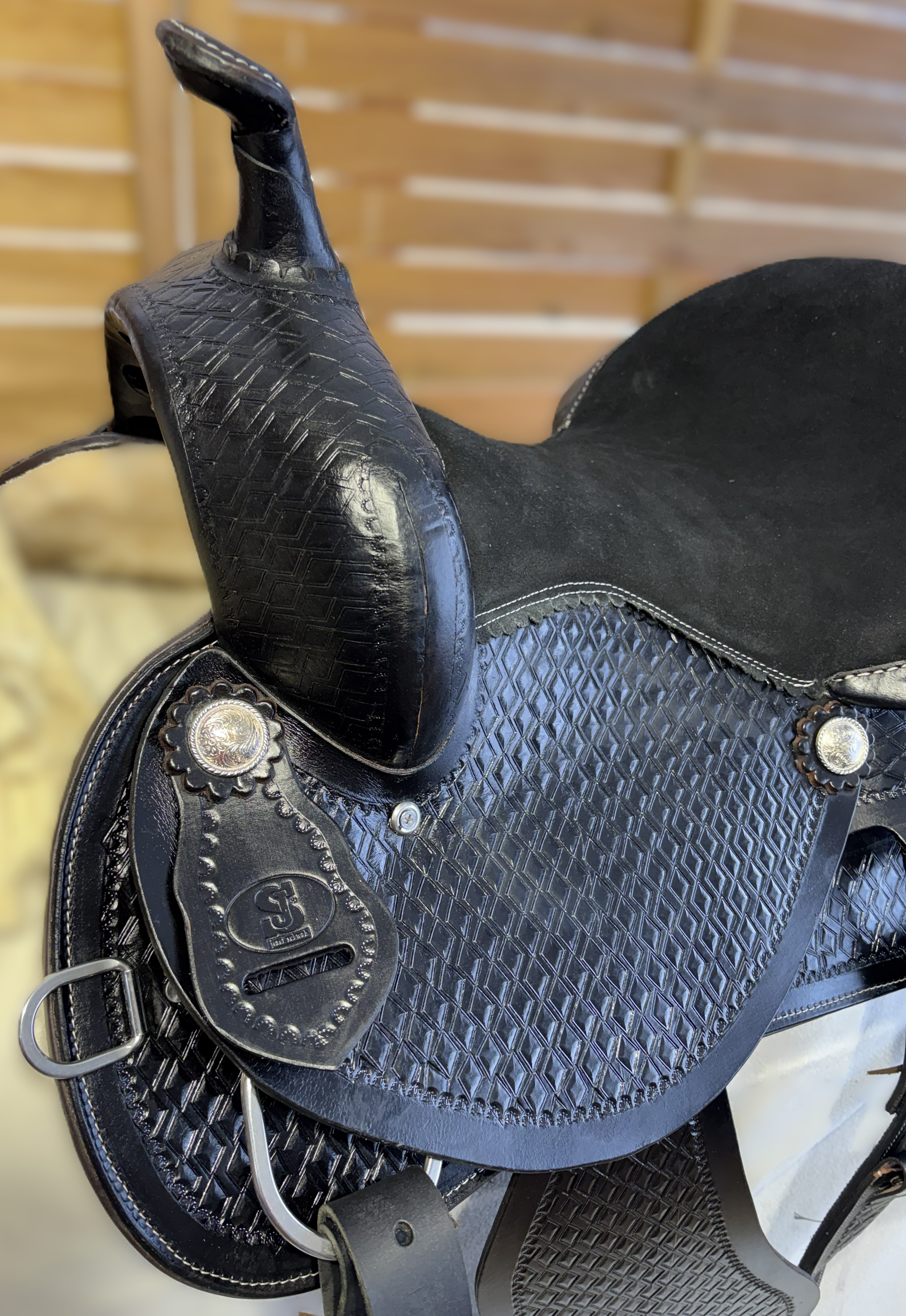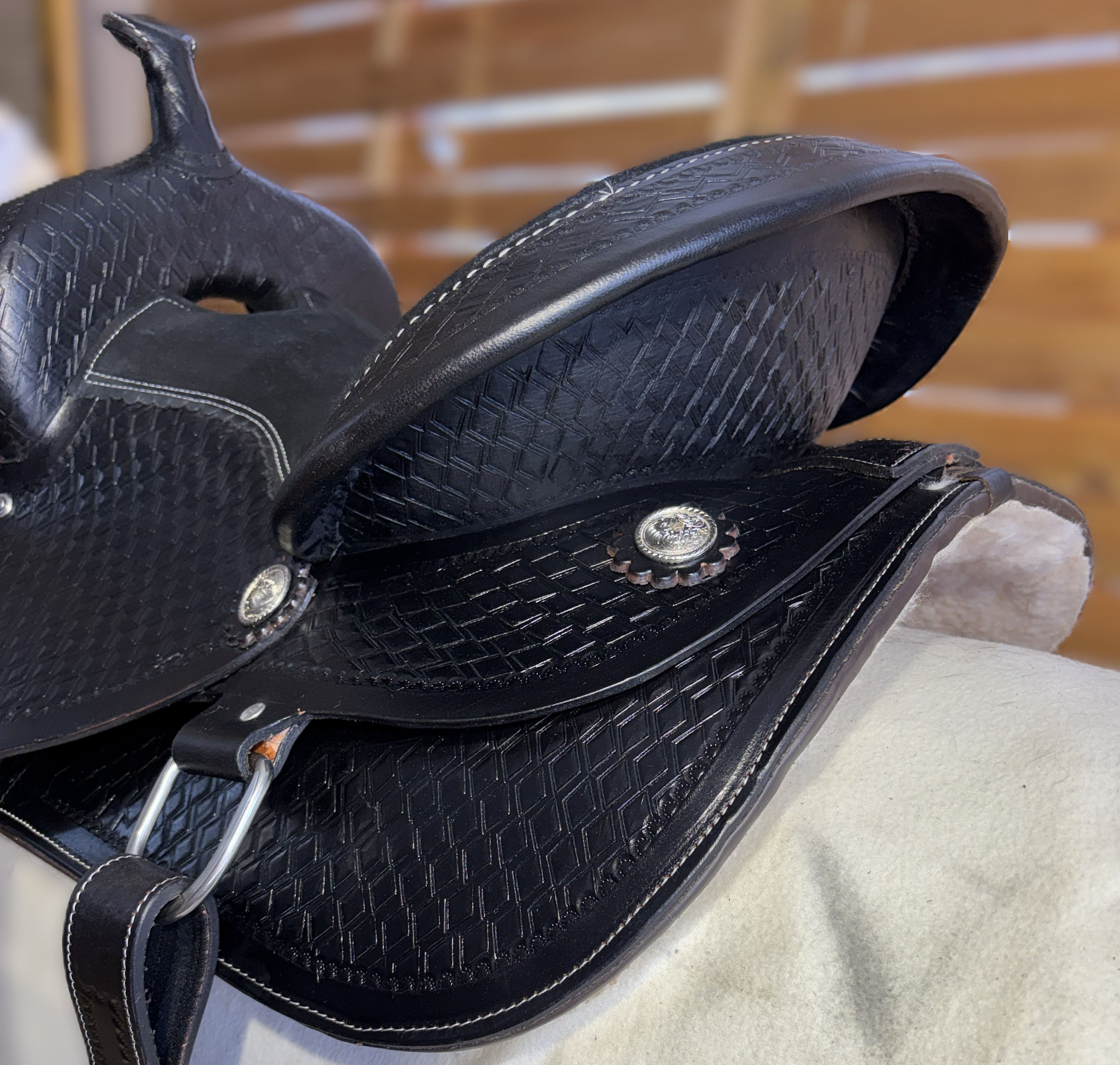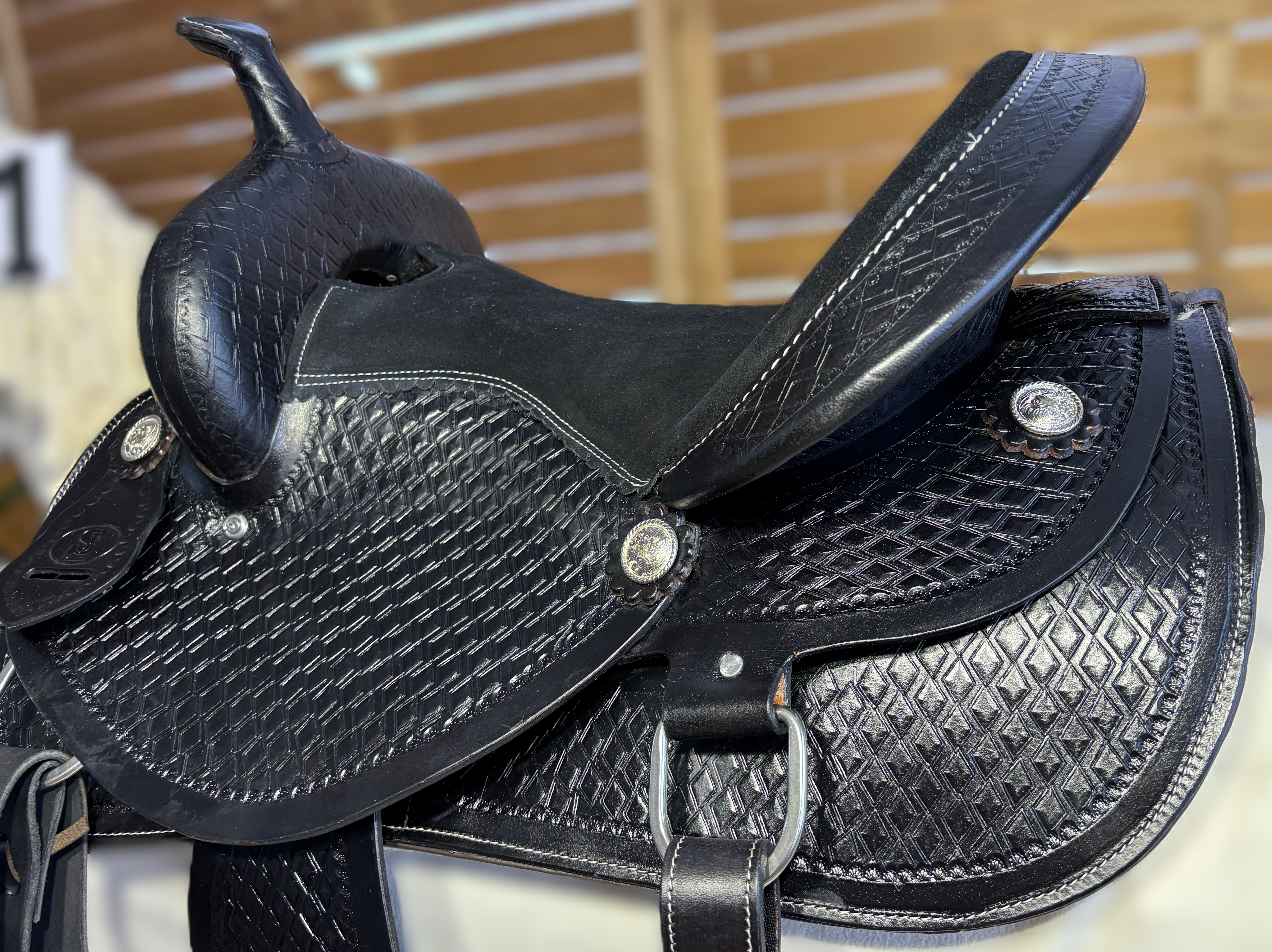 Westernové sedlo-komplet č.11) v černé barvě. Velikost sedel je Full/QH, 16” (40,5cm) i 17” (43cm) v sedu, a gulett/komorou 8” (20cm). Celková délka sedla je 66cm. Sedlo je v plné dekoraci Basket. Černý měkčený sed z "nubuk" kůže bez prošívání. Kvalitní a silná kůže na Fiber-glass kostře (lehké, pružné a pevné). Jednoduchý systém posouvání délky fendrových řemenů přes klasickou přezku. Sedlo je zkompletováno se: Zadními sedlovými řemeny k zadnímu podbřišníku, na levém řemenu s pouzdrem. Uzdečkou, poprsníkem a otěžemi vše v barvě i dekoraci sedla. Předním provázkovým podbřišníkem a zadním koženým podbřišníkem s propojovacím řemínkem. Ruční výroba.