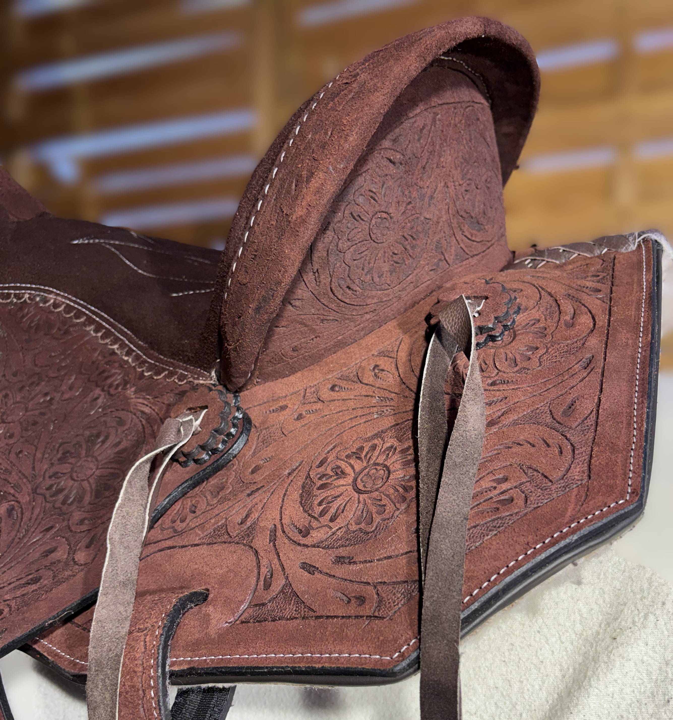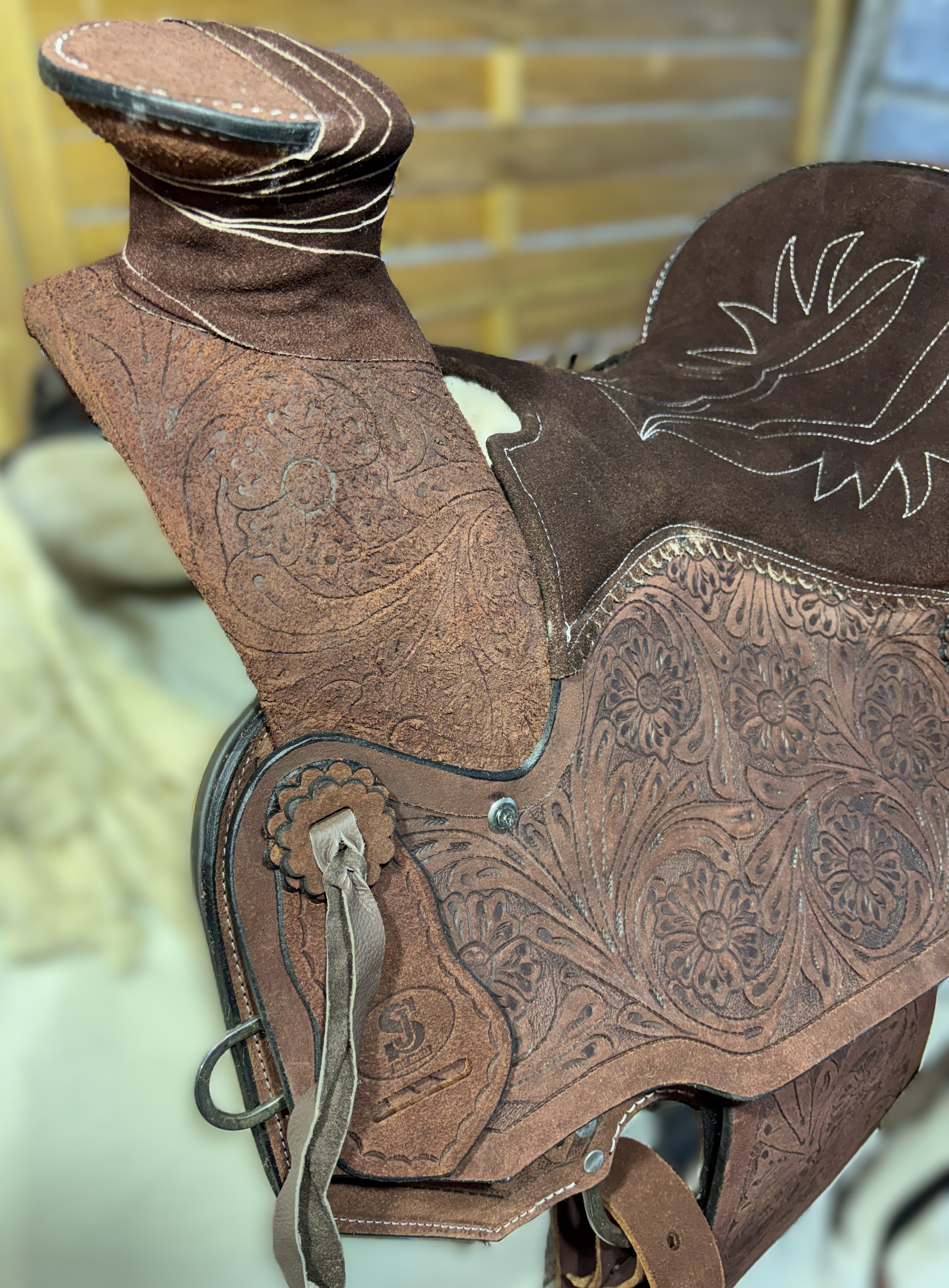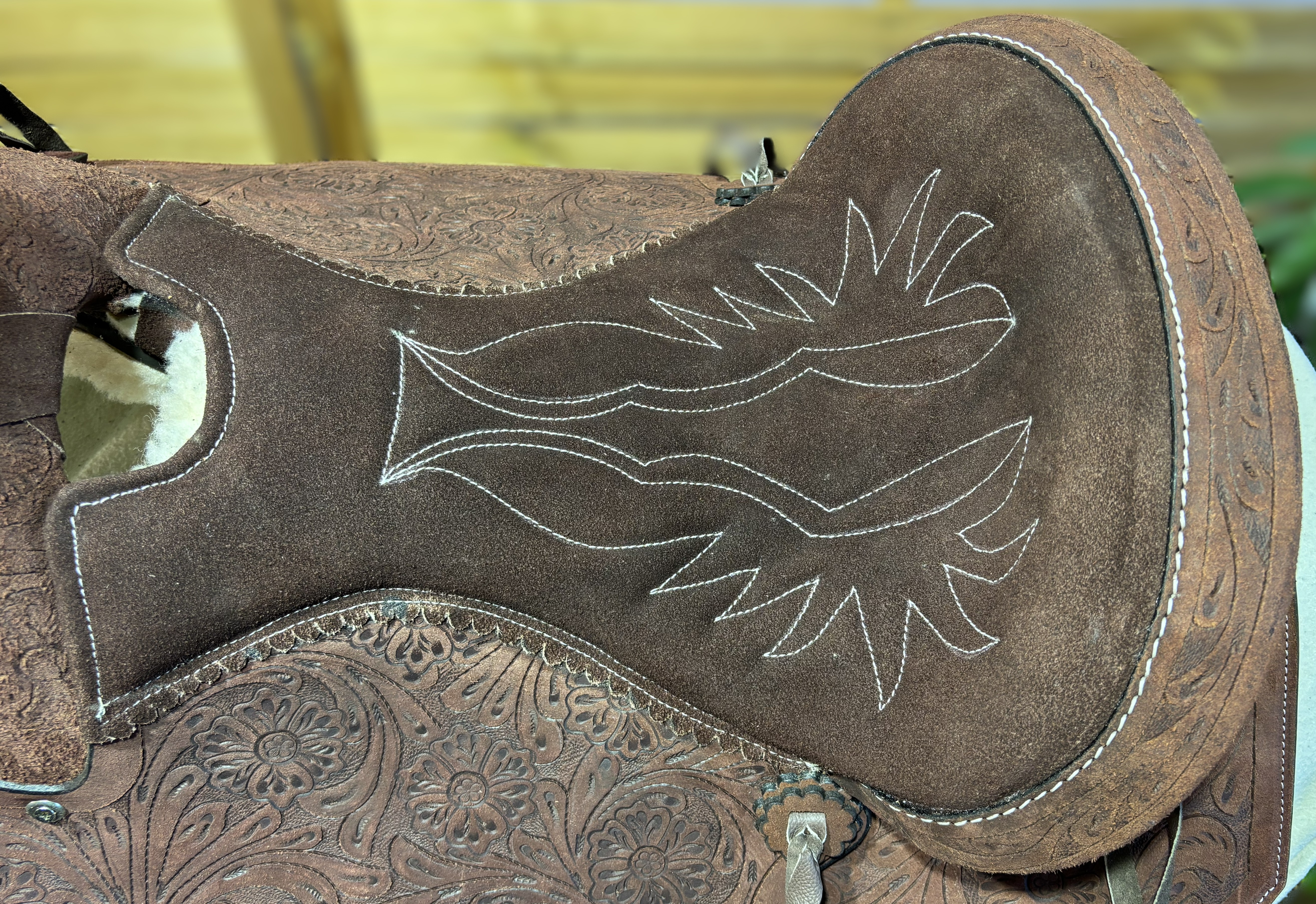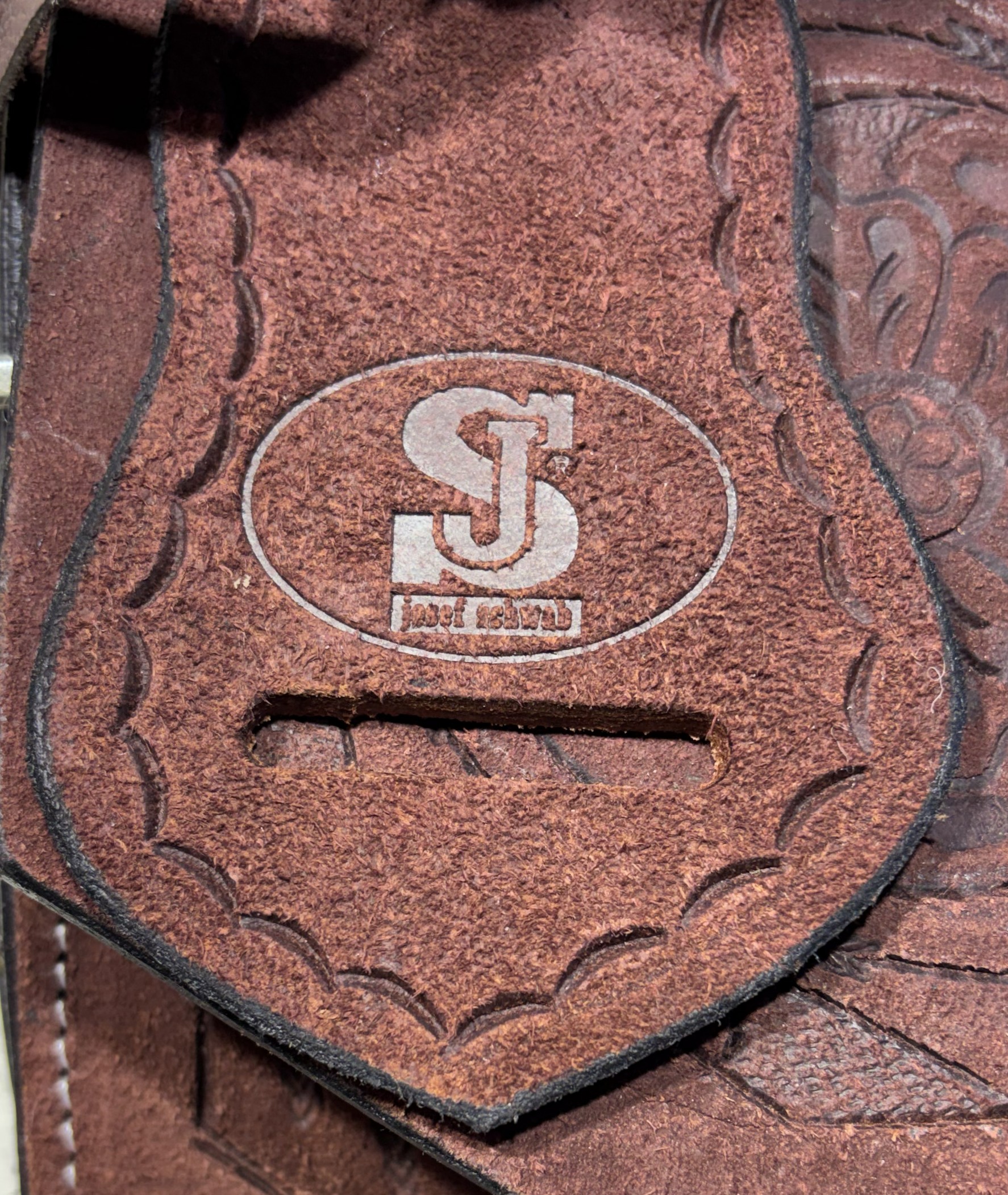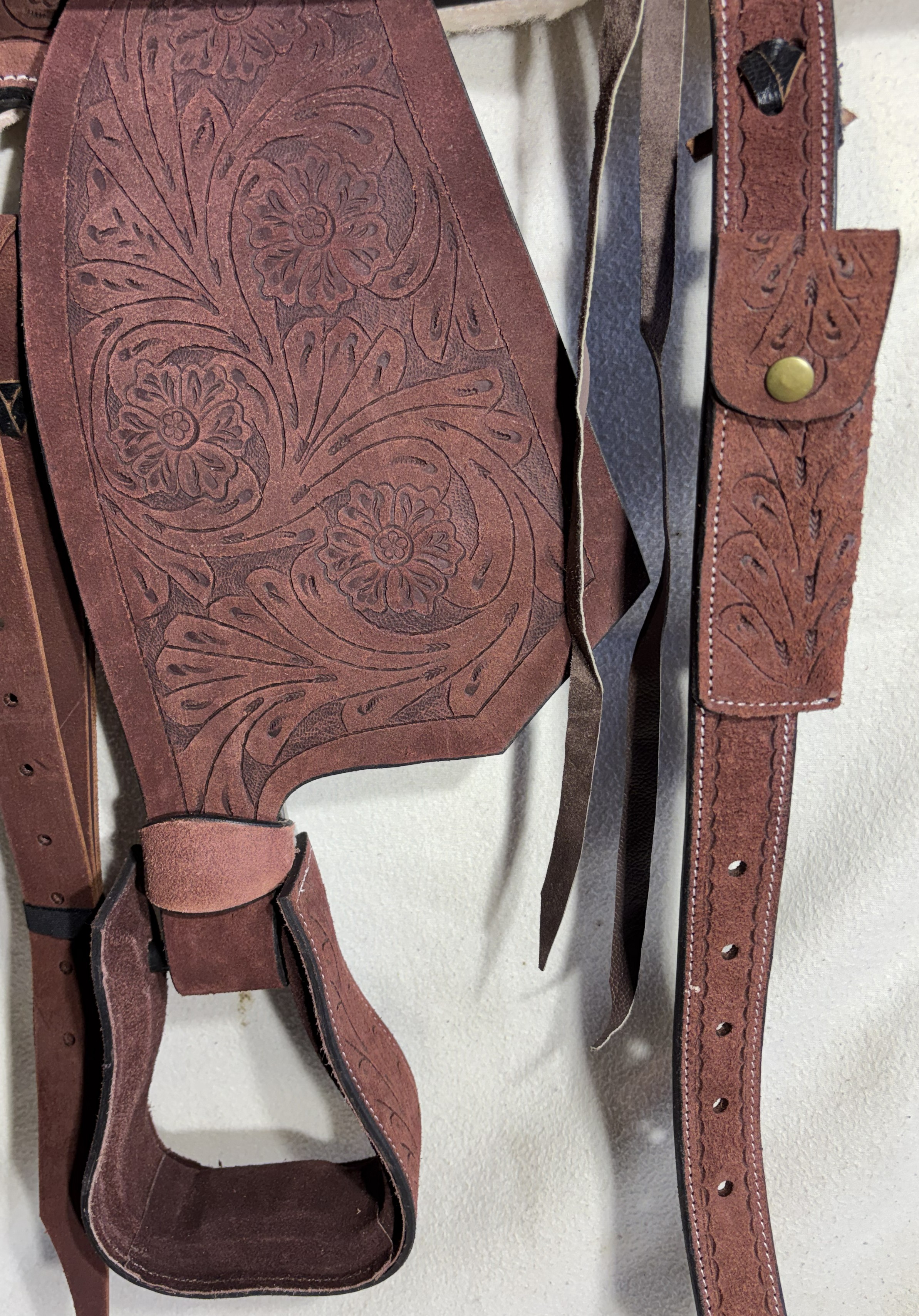 Westernové sedlo-komplet č.12) WADE z broušené kůže v tmavě hnědé barvě, s ostrými rohy. Velikost sedla je Full/QH, 16” (40,5cm) i 17” (43cm) v sedu, a gulett/komorou 9,5” (24,5cm). Celková délka sedla je 69cm. Sedlo je v celodekoraci Floral. Tmavě hnědý měkčený sed z "nubuk" kůže s prošíváním. Kvalitní a silná kůže na Fiber-glass kostře (lehké, pružné a pevné). Jednoduchý systém posouvání délky fendrových řemenů přes klasickou přezku. Součástí sedla jsou sedlové struny na přivázání bagáže nebo sedlové brašny. Sedlo je zkompletováno se: Zadními sedlovými řemeny k zadnímu podbřišníku, na levém řemenu s pouzdrem. Uzdečkou, poprsníkem a otěžemi vše v barvě i dekoraci sedla. Zadním koženým podbřišníkem s propojovacím řemínkem. Ruční výroba.