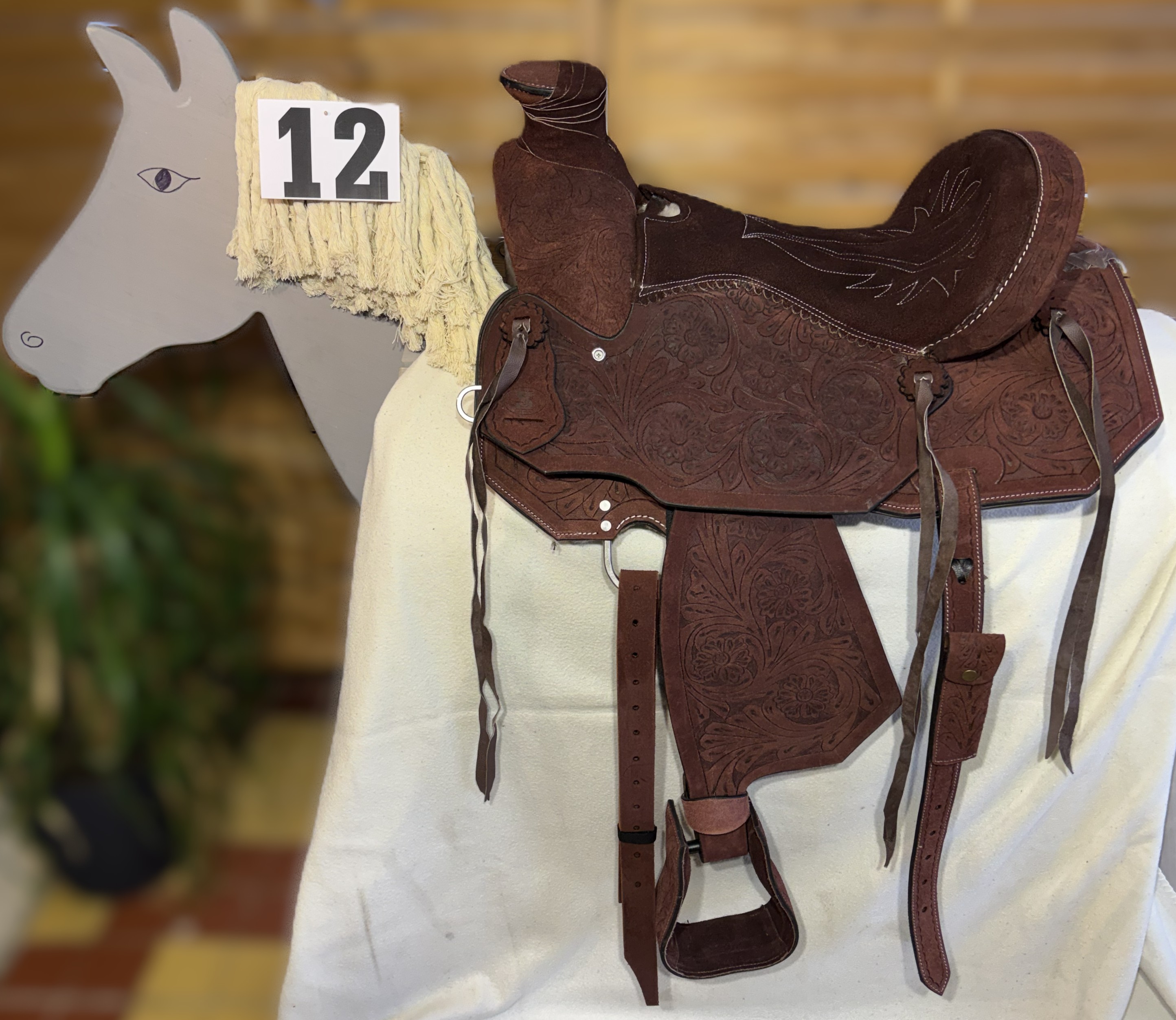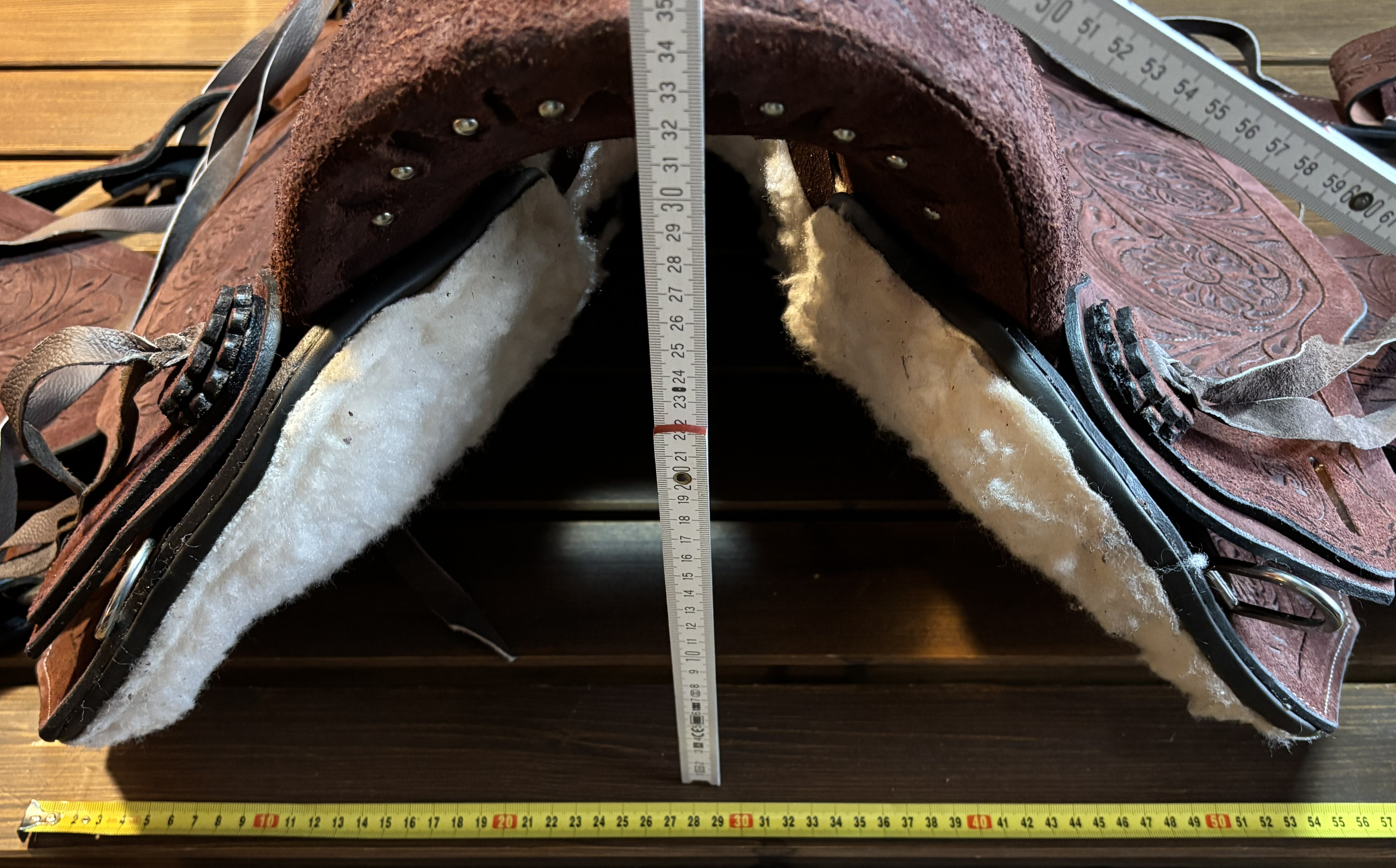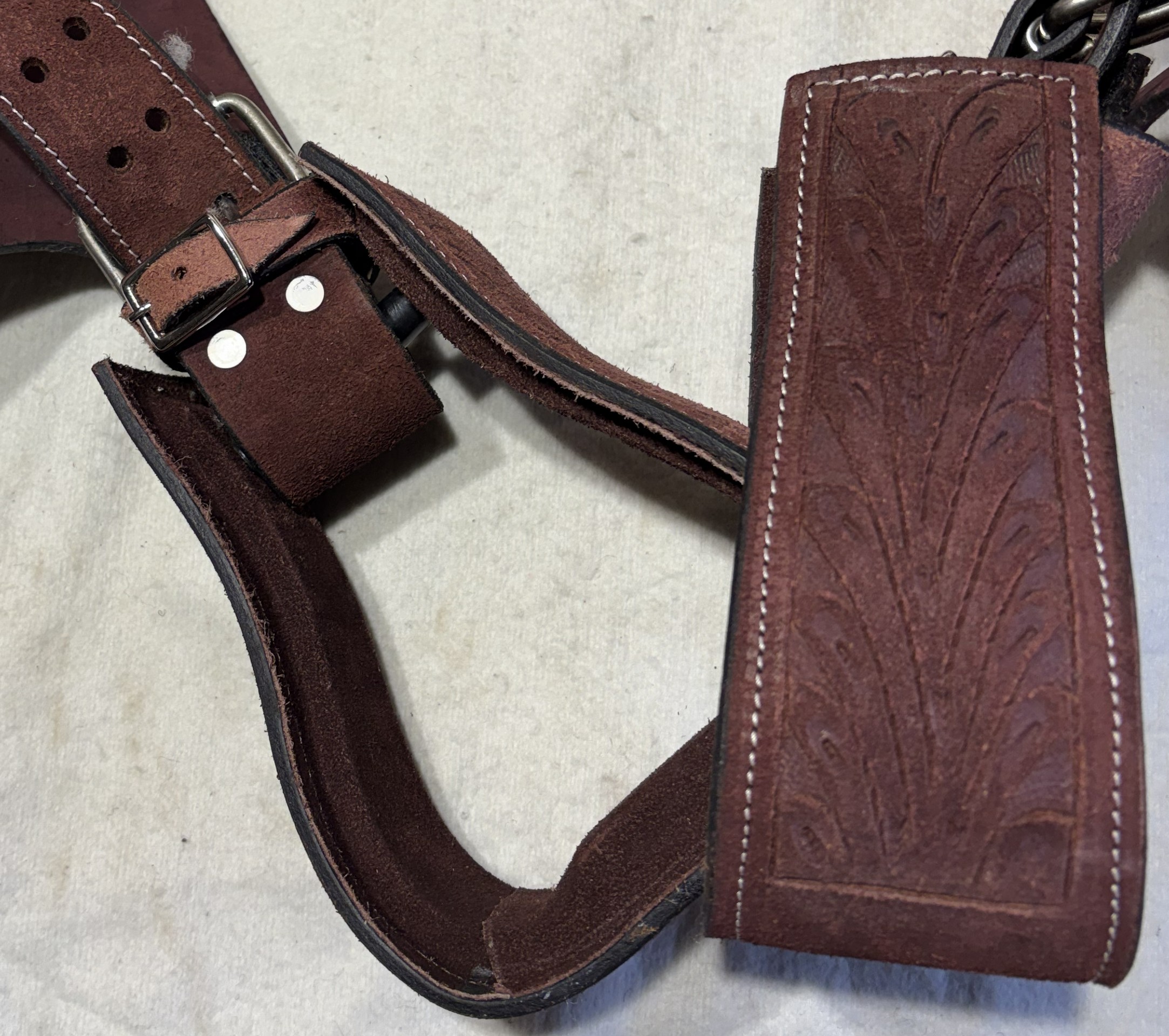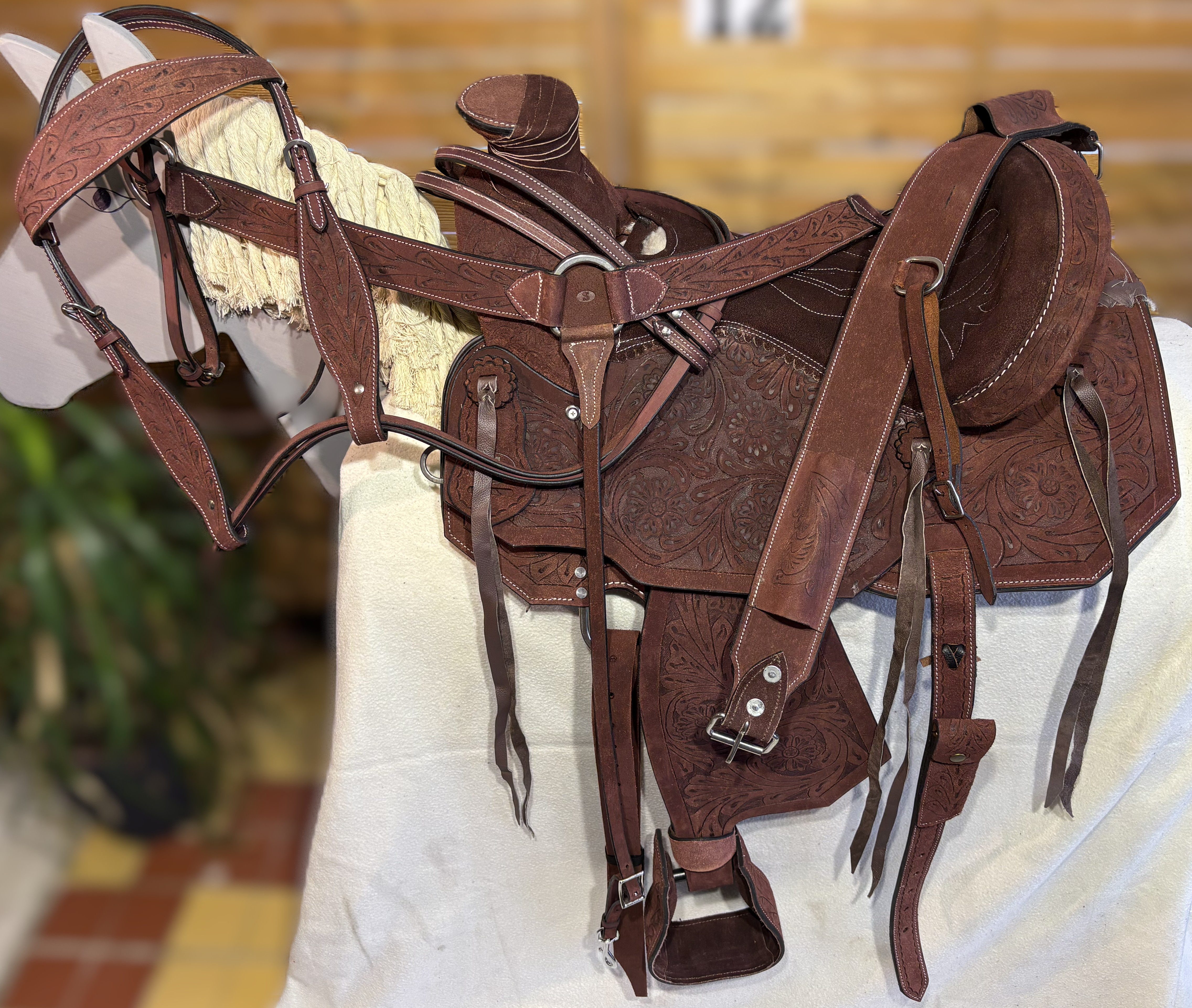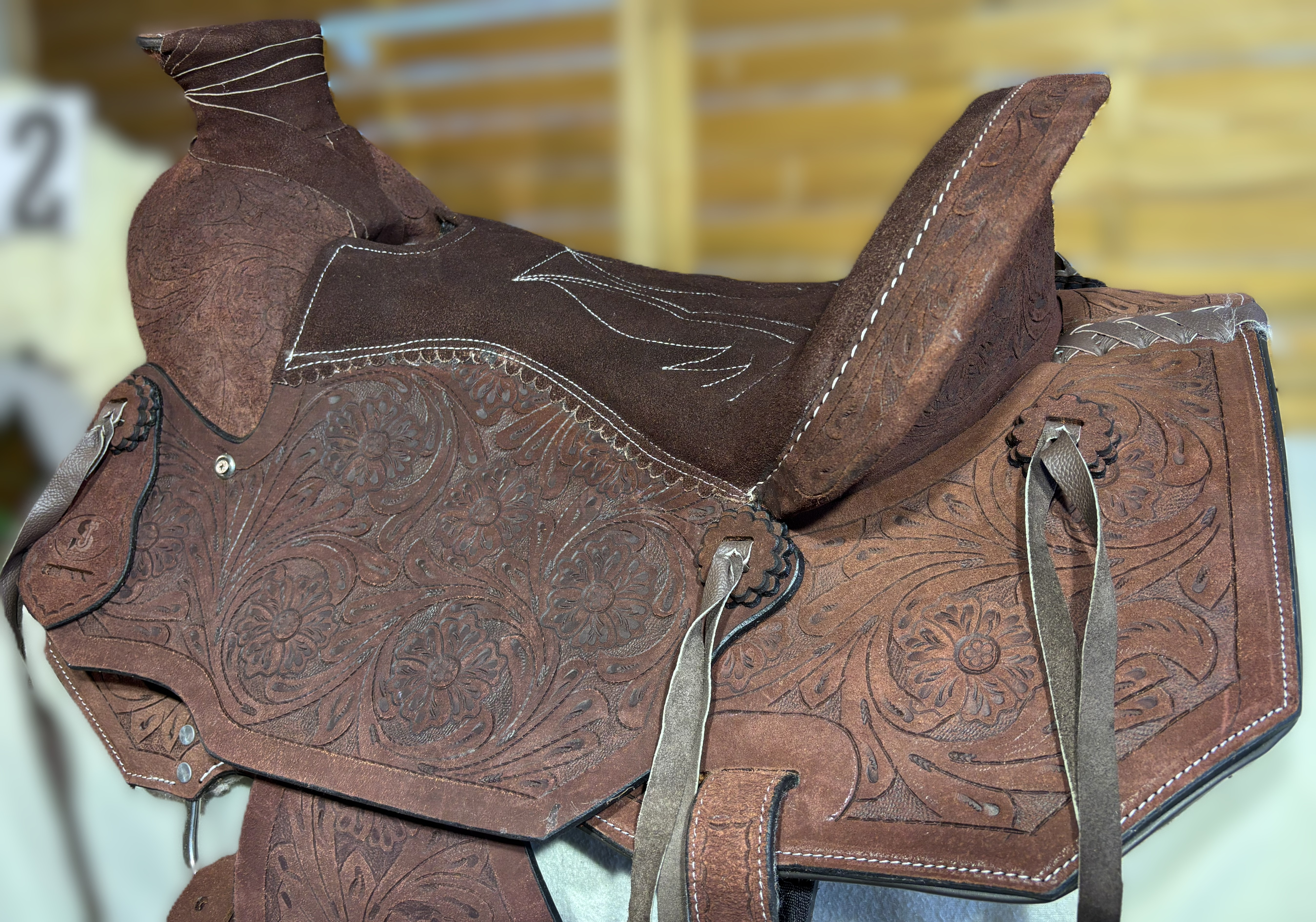 Westernové sedlo-komplet č.12) WADE z broušené kůže v tmavě hnědé barvě, s ostrými rohy. Velikost sedla je Full/QH, 16” (40,5cm) i 17” (43cm) v sedu, a gulett/komorou 9,5” (24,5cm). Celková délka sedla je 69cm. Sedlo je v celodekoraci Floral. Tmavě hnědý měkčený sed z "nubuk" kůže s prošíváním. Kvalitní a silná kůže na Fiber-glass kostře (lehké, pružné a pevné). Jednoduchý systém posouvání délky fendrových řemenů přes klasickou přezku. Součástí sedla jsou sedlové struny na přivázání bagáže nebo sedlové brašny. Sedlo je zkompletováno se: Zadními sedlovými řemeny k zadnímu podbřišníku, na levém řemenu s pouzdrem. Uzdečkou, poprsníkem a otěžemi vše v barvě i dekoraci sedla. Zadním koženým podbřišníkem s propojovacím řemínkem. Ruční výroba.