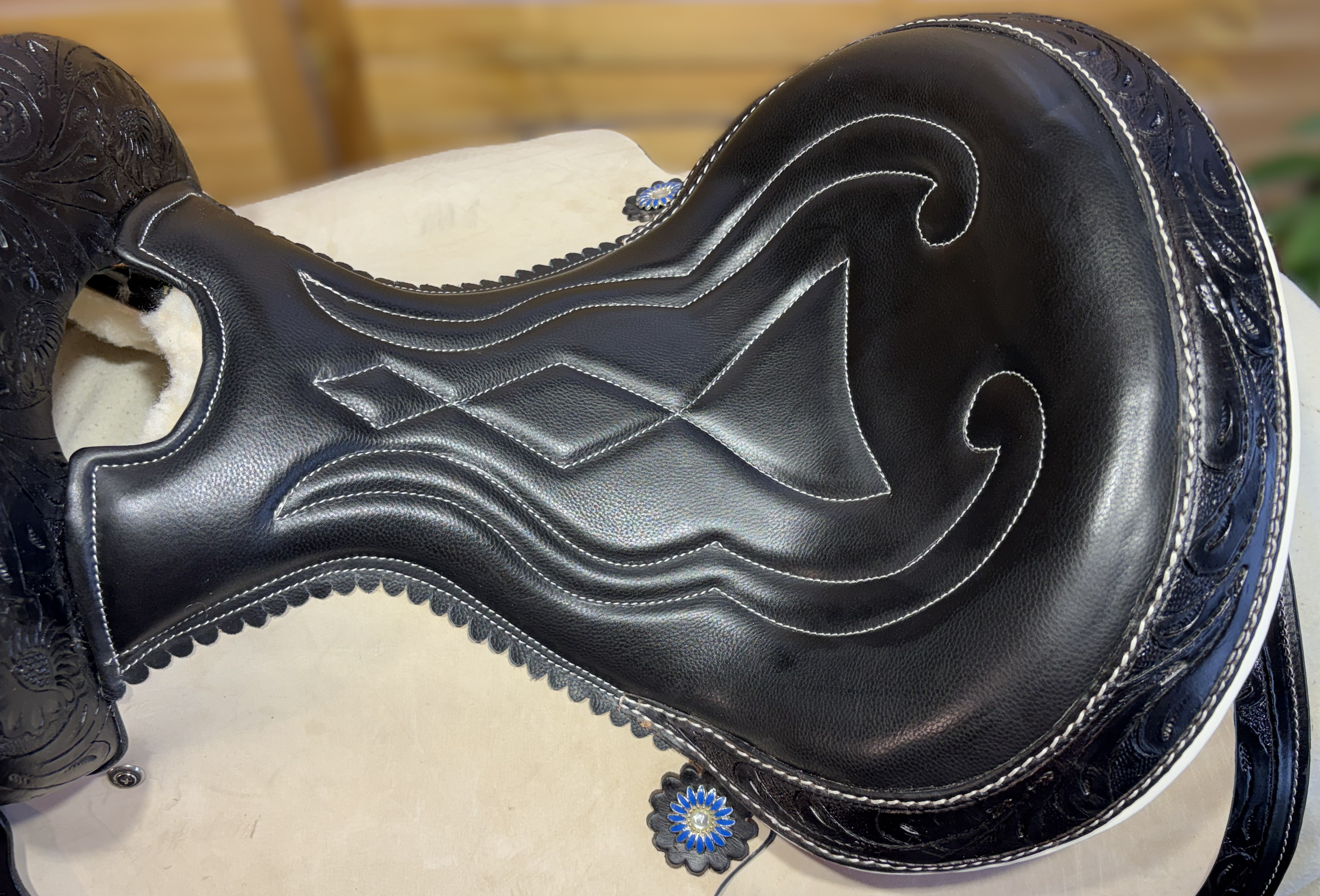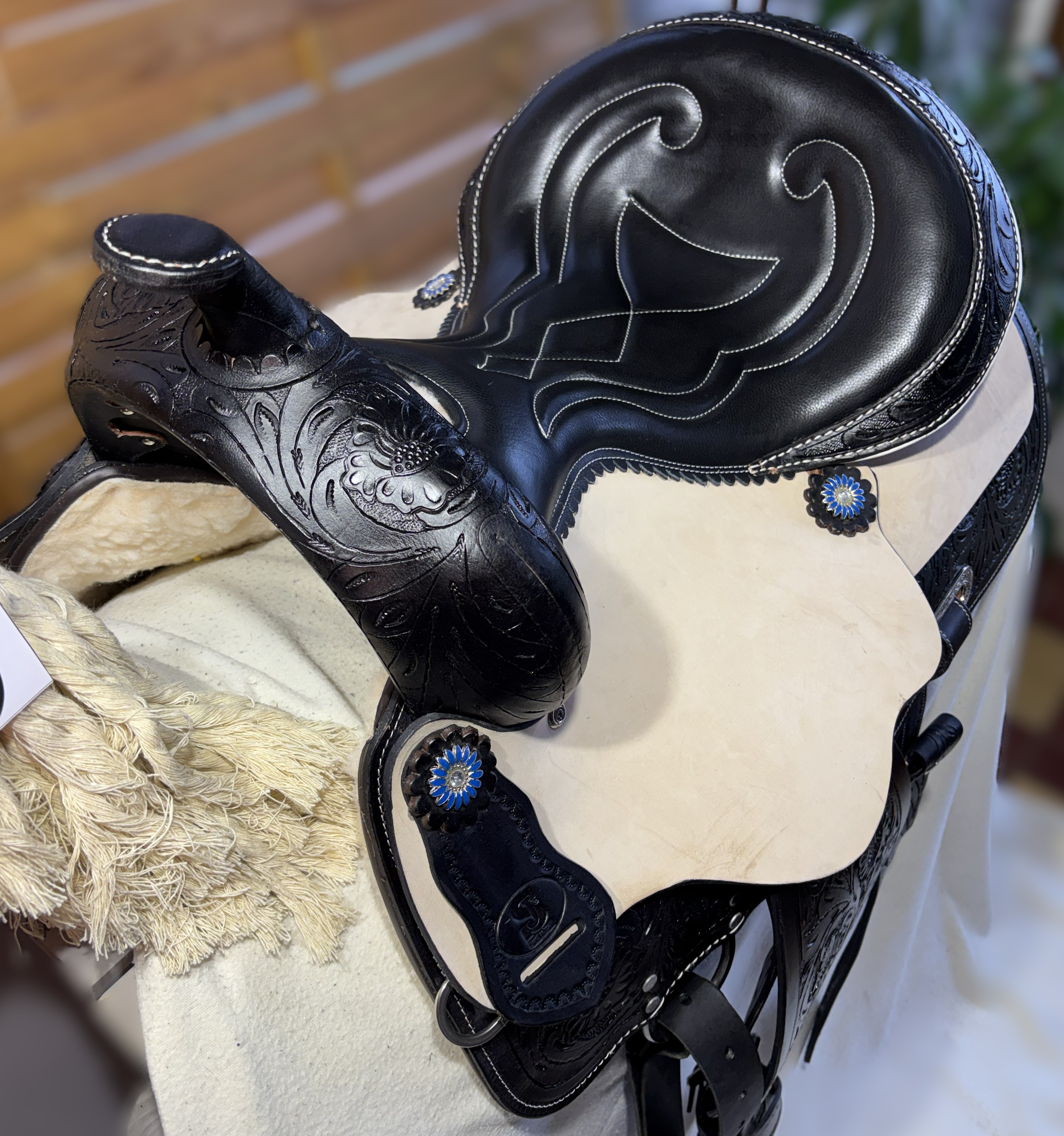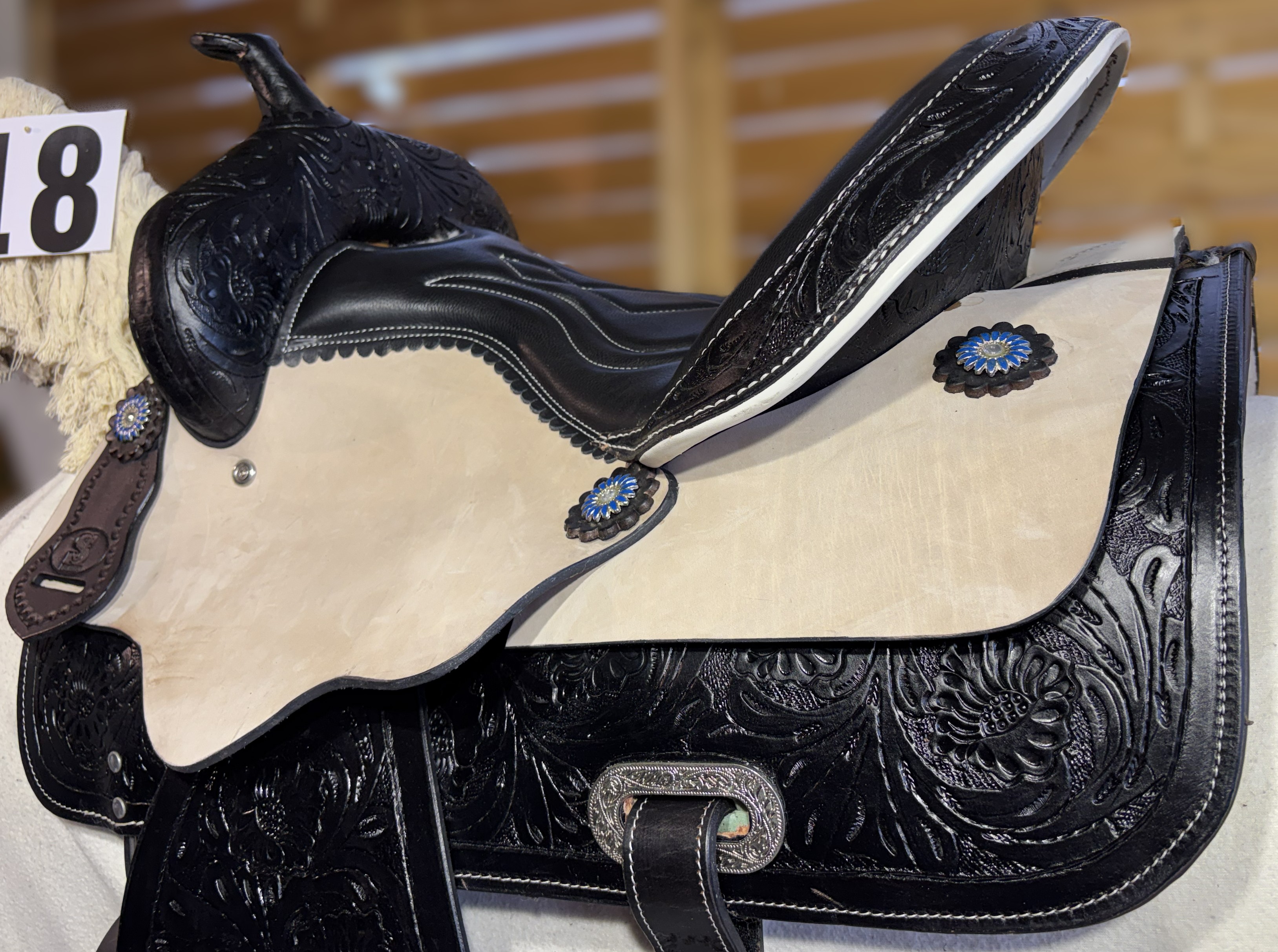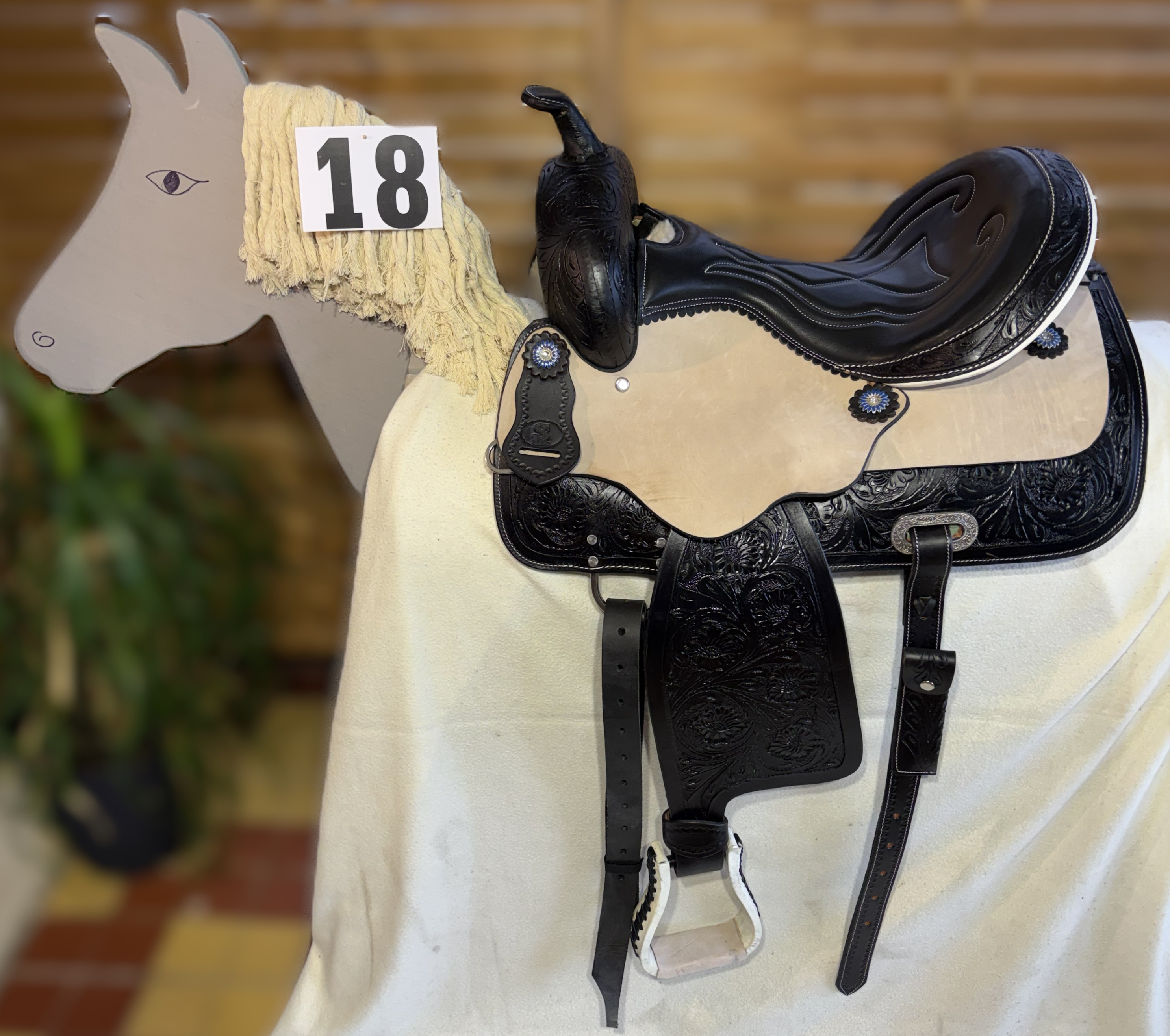 Westernové sedlo-komplet č.18) v černé barvě kombinované se světlou přírodní, s bílým lemem zadní rozsochy. Velikost sedla je Full/QH, 16” (40,5cm) i 17” (43cm) v sedu, a gulett/komorou 9,5” (24cm). Celková délka sedla je 65cm. Sedlo je v částečné dekoraci Floral. Sedlové bočnice hladké, bez zdobení. Černý měkký kožený sed s prošíváním Kvalitní a silná kůže na Fiber-glass kostře (lehké, pružné a pevné). Jednoduchý systém posouvání délky fendrových řemenů přes klasickou přezku. Sedlo je zkompletováno se: Zadními sedlovými řemeny k zadnímu podbřišníku, na levém řemenu s pouzdrem. Uzdečkou, poprsníkem a otěžemi vše v barvě i dekoraci sedla. Sedlovým pouzdrem. Předním provázkovým podbřišníkem a zadním koženým podbřišníkem s propojovacím řemínkem. Ruční výroba.