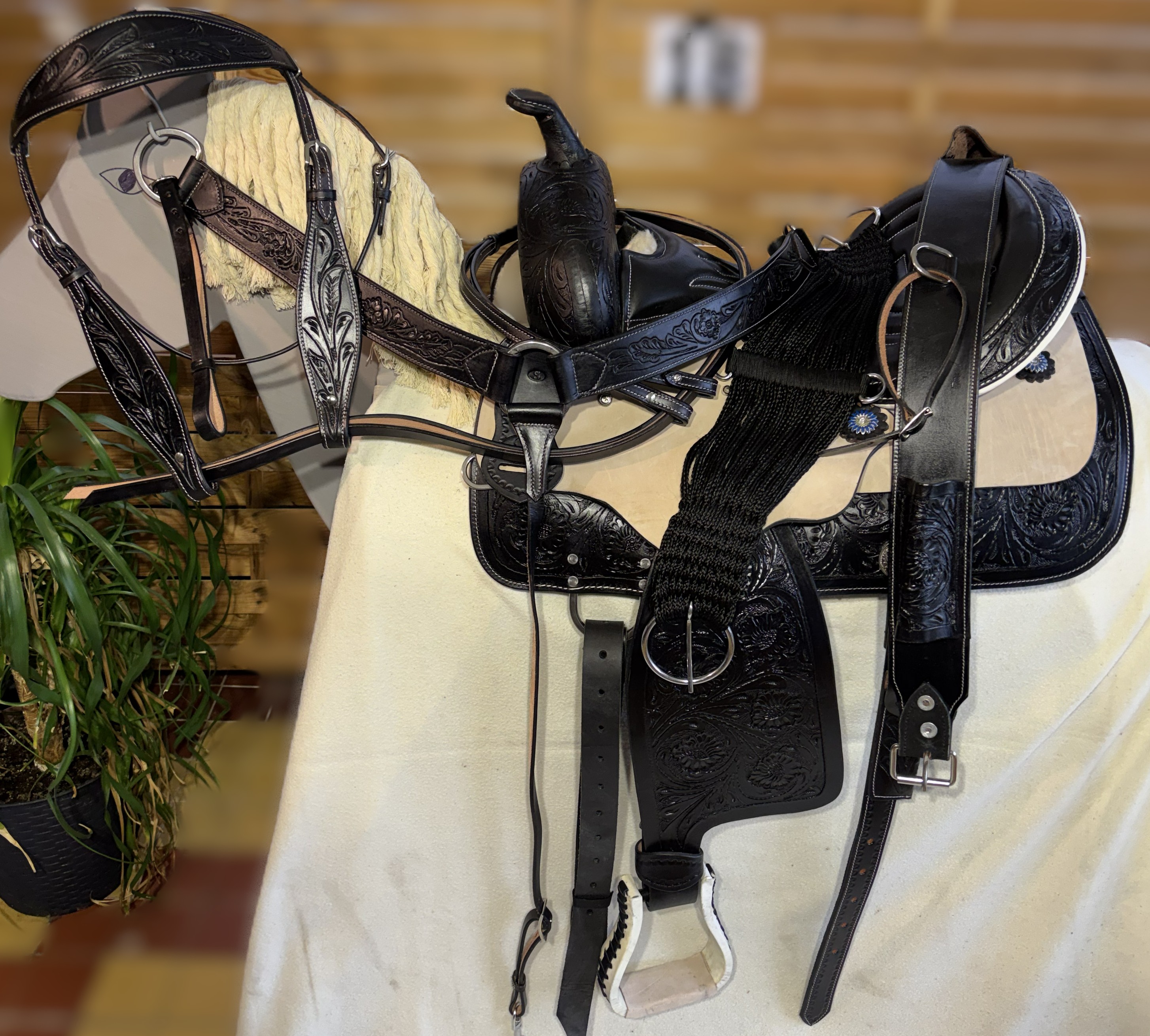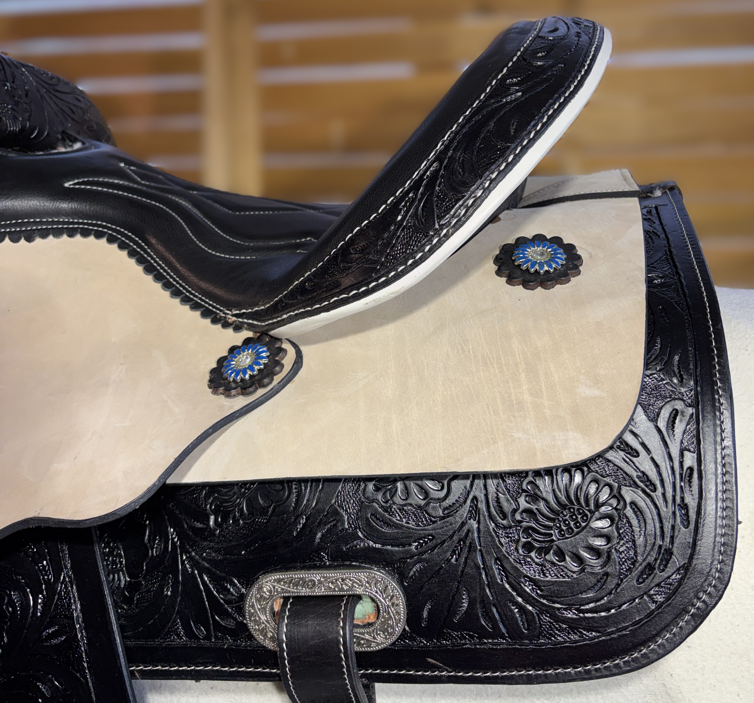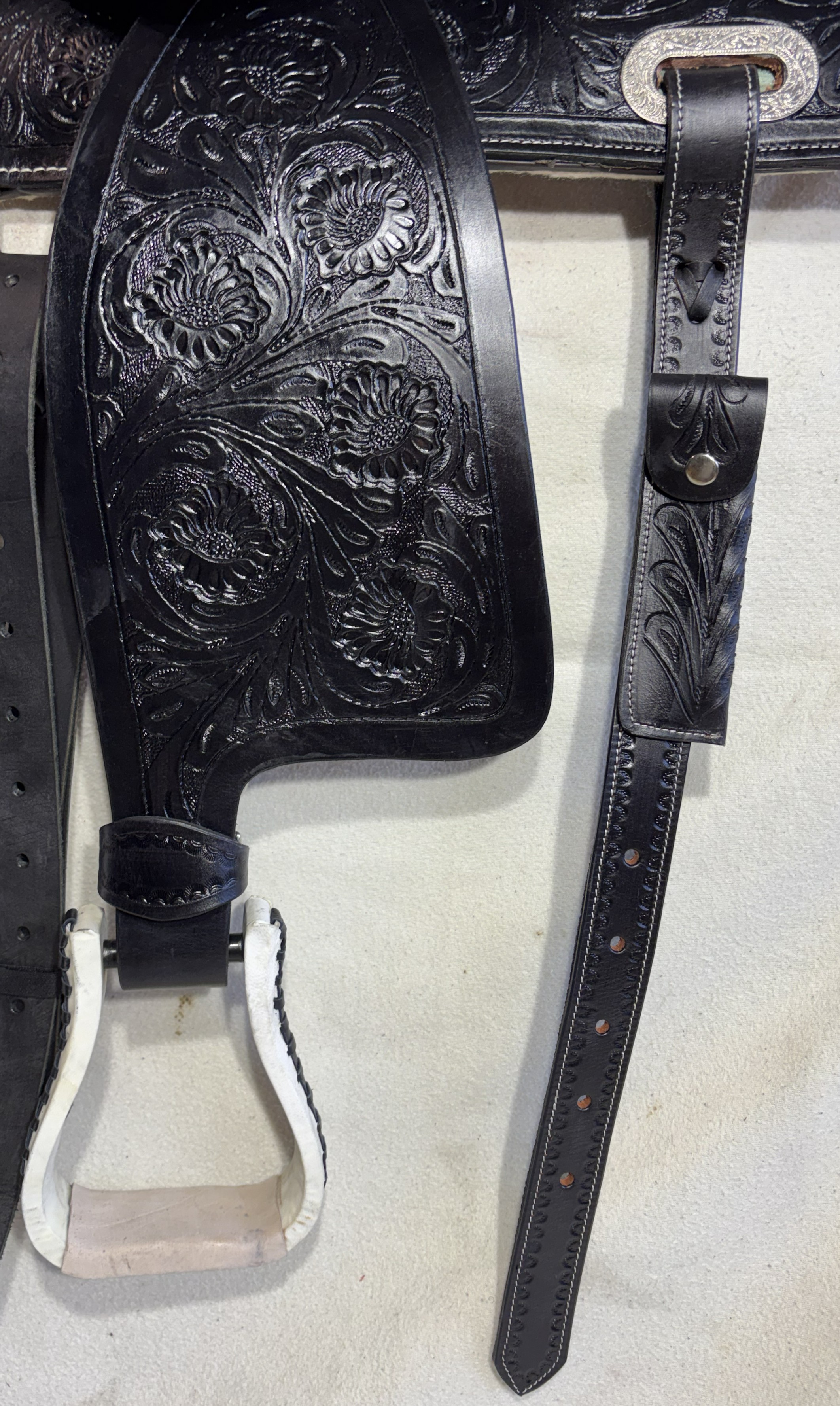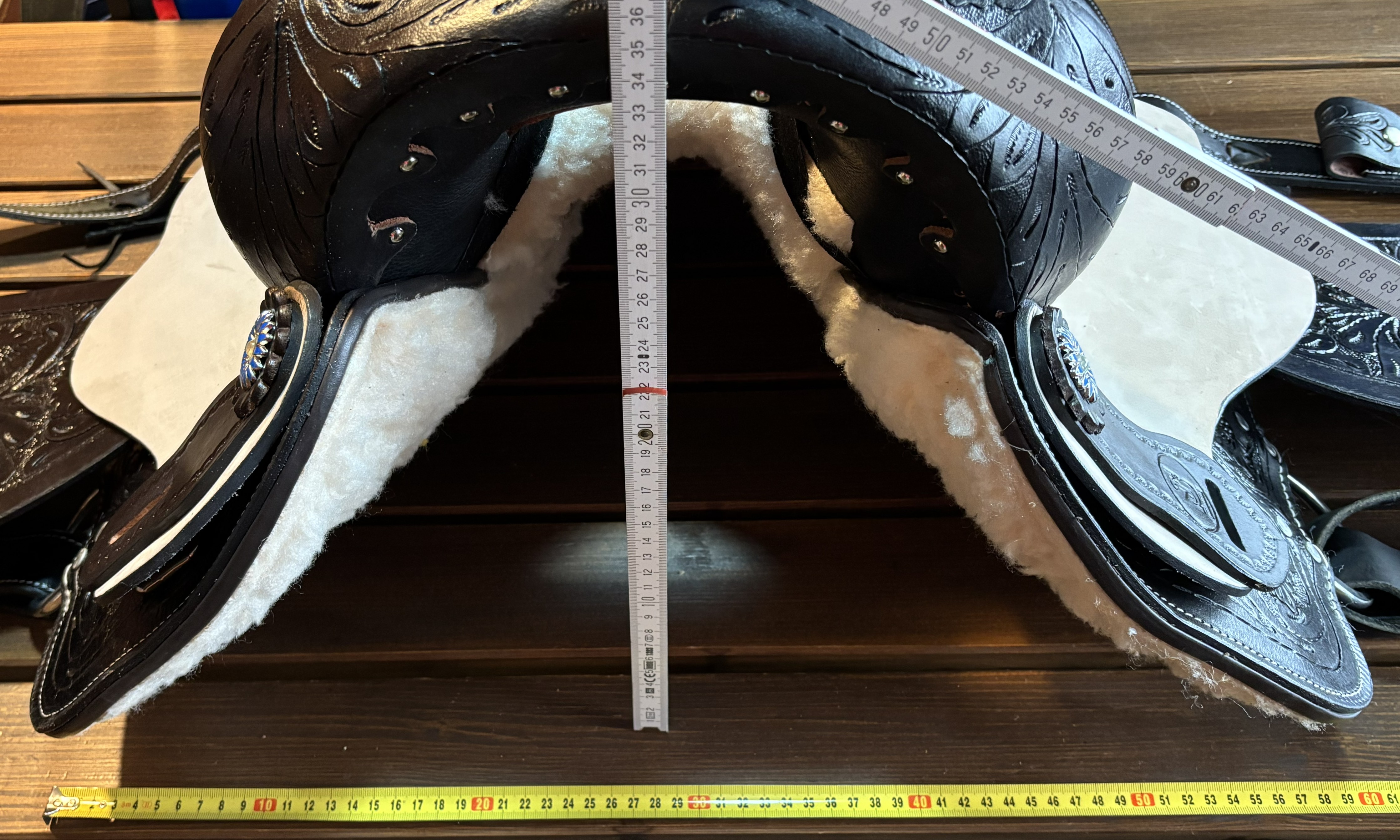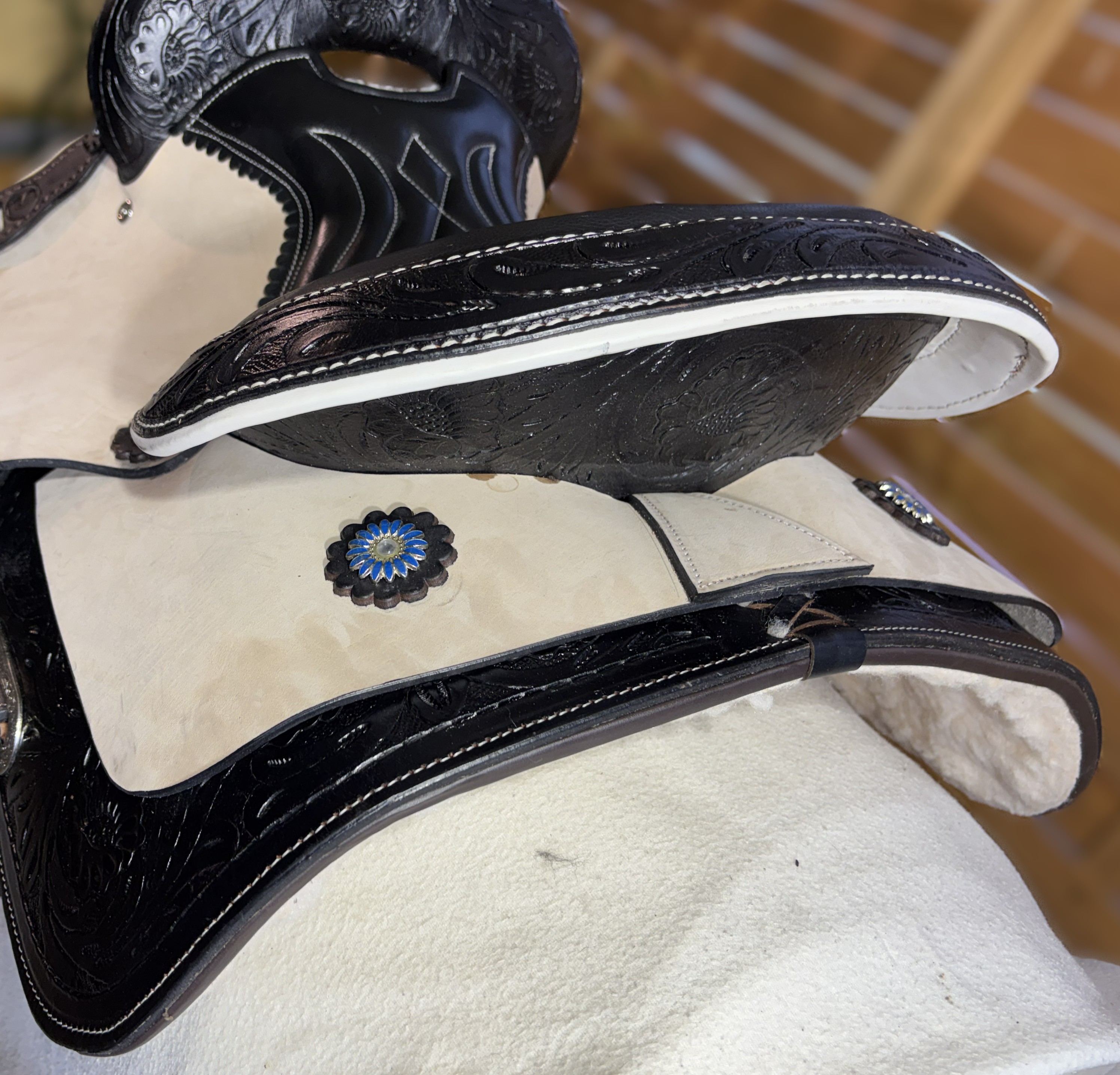 Westernové sedlo-komplet č.18) v černé barvě kombinované se světlou přírodní, s bílým lemem zadní rozsochy. Velikost sedla je Full/QH, 16” (40,5cm) i 17” (43cm) v sedu, a gulett/komorou 9,5” (24cm). Celková délka sedla je 65cm. Sedlo je v částečné dekoraci Floral. Sedlové bočnice hladké, bez zdobení. Černý měkký kožený sed s prošíváním Kvalitní a silná kůže na Fiber-glass kostře (lehké, pružné a pevné). Jednoduchý systém posouvání délky fendrových řemenů přes klasickou přezku. Sedlo je zkompletováno se: Zadními sedlovými řemeny k zadnímu podbřišníku, na levém řemenu s pouzdrem. Uzdečkou, poprsníkem a otěžemi vše v barvě i dekoraci sedla. Sedlovým pouzdrem. Předním provázkovým podbřišníkem a zadním koženým podbřišníkem s propojovacím řemínkem. Ruční výroba.