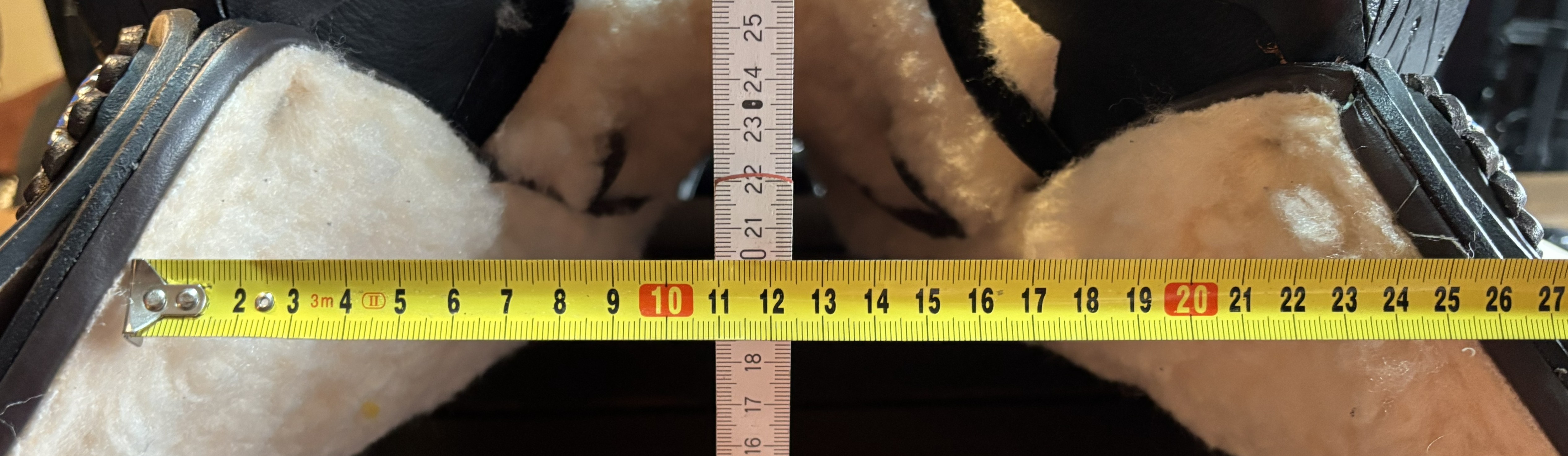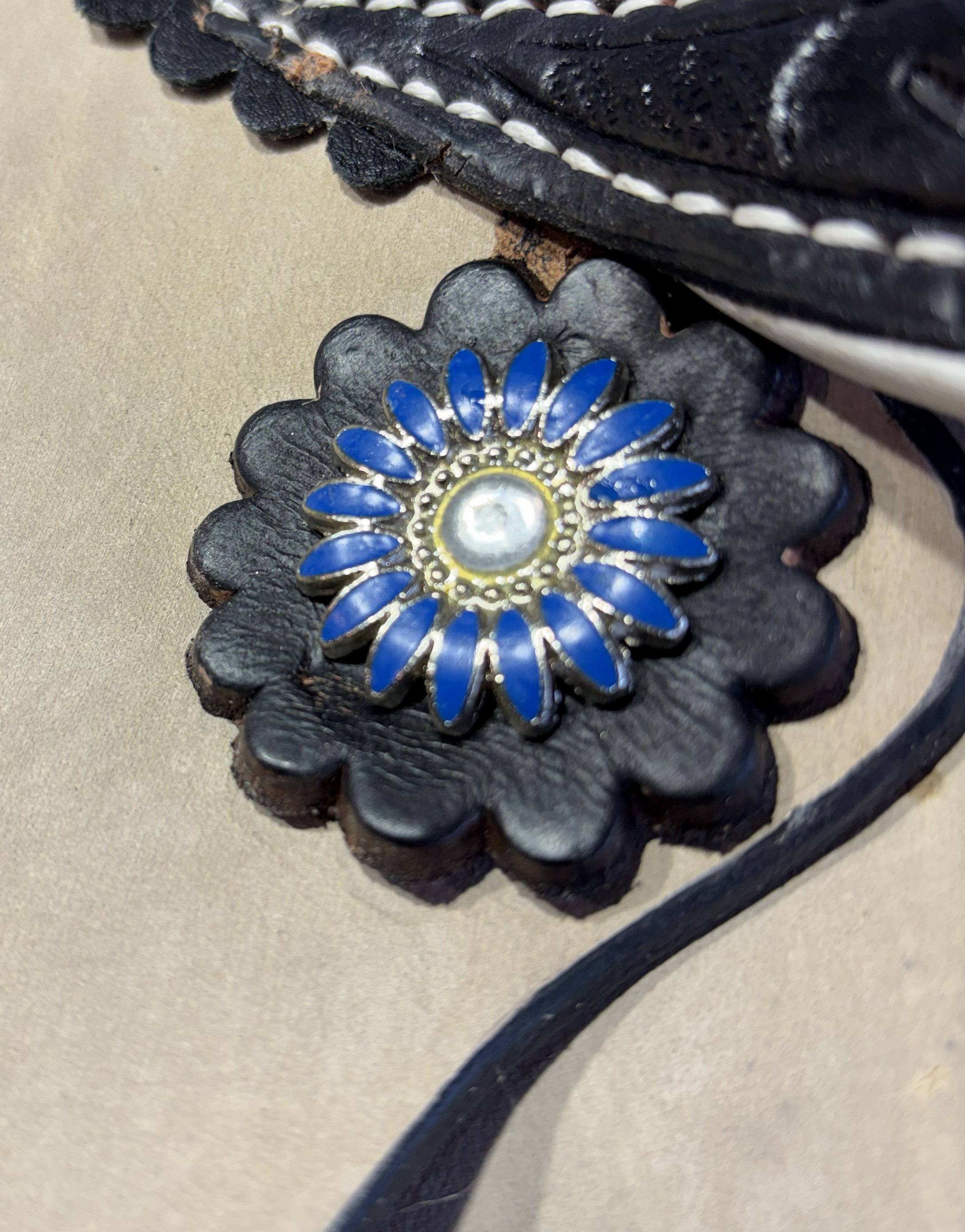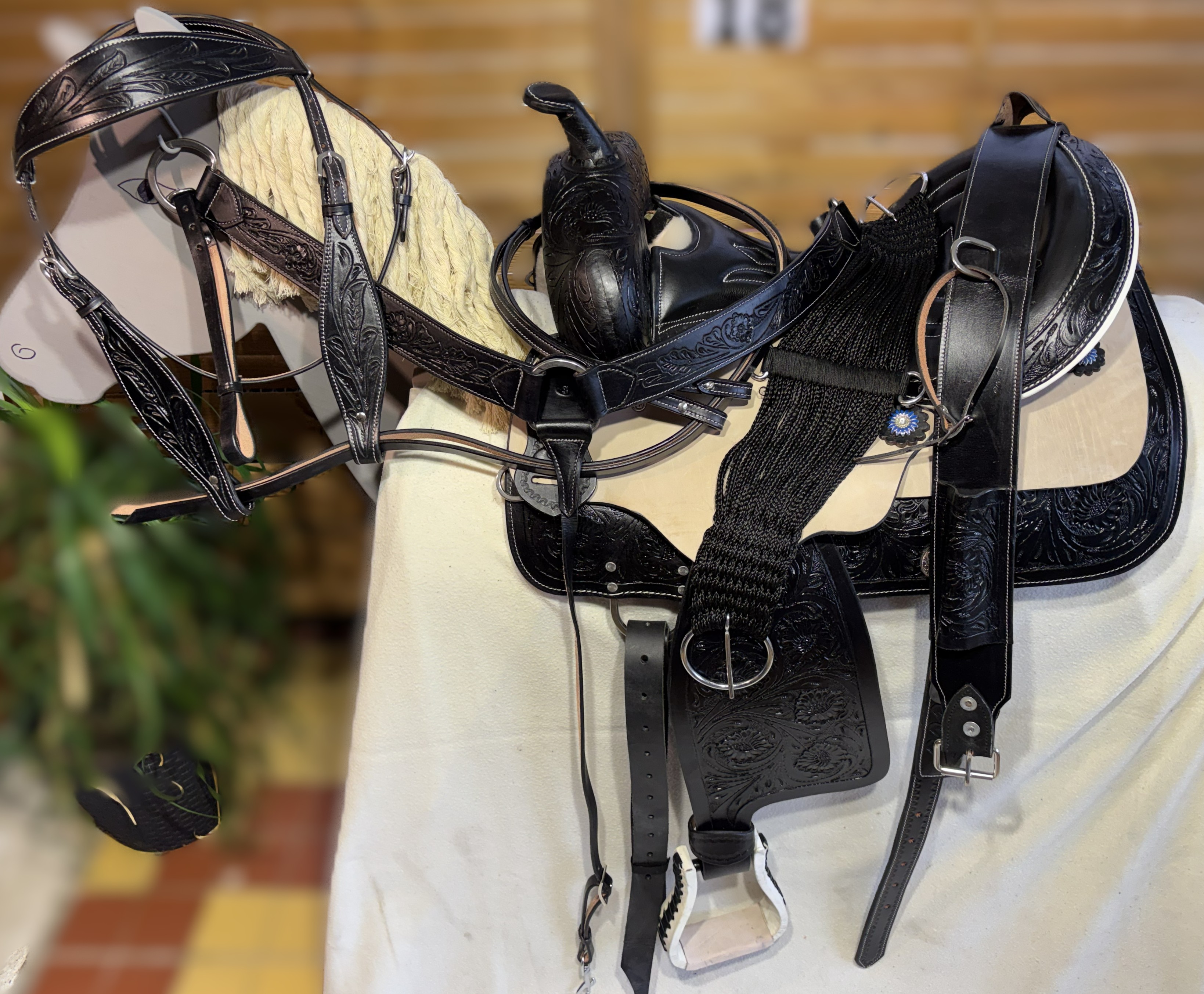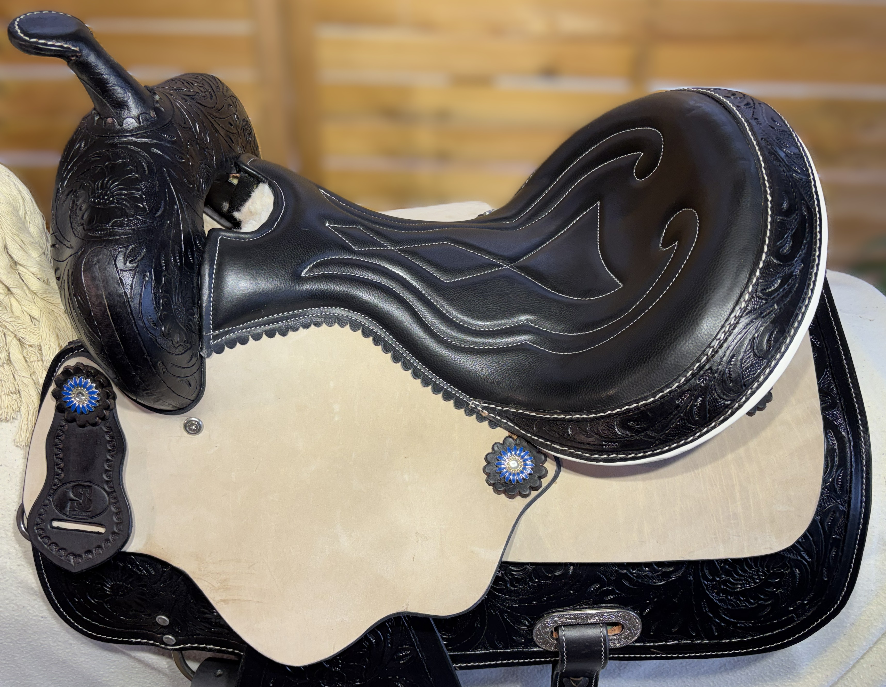 Westernové sedlo-komplet č.18) v černé barvě kombinované se světlou přírodní, s bílým lemem zadní rozsochy. Velikost sedla je Full/QH, 16” (40,5cm) i 17” (43cm) v sedu, a gulett/komorou 9,5” (24cm). Celková délka sedla je 65cm. Sedlo je v částečné dekoraci Floral. Sedlové bočnice hladké, bez zdobení. Černý měkký kožený sed s prošíváním Kvalitní a silná kůže na Fiber-glass kostře (lehké, pružné a pevné). Jednoduchý systém posouvání délky fendrových řemenů přes klasickou přezku. Sedlo je zkompletováno se: Zadními sedlovými řemeny k zadnímu podbřišníku, na levém řemenu s pouzdrem. Uzdečkou, poprsníkem a otěžemi vše v barvě i dekoraci sedla. Sedlovým pouzdrem. Předním provázkovým podbřišníkem a zadním koženým podbřišníkem s propojovacím řemínkem. Ruční výroba.