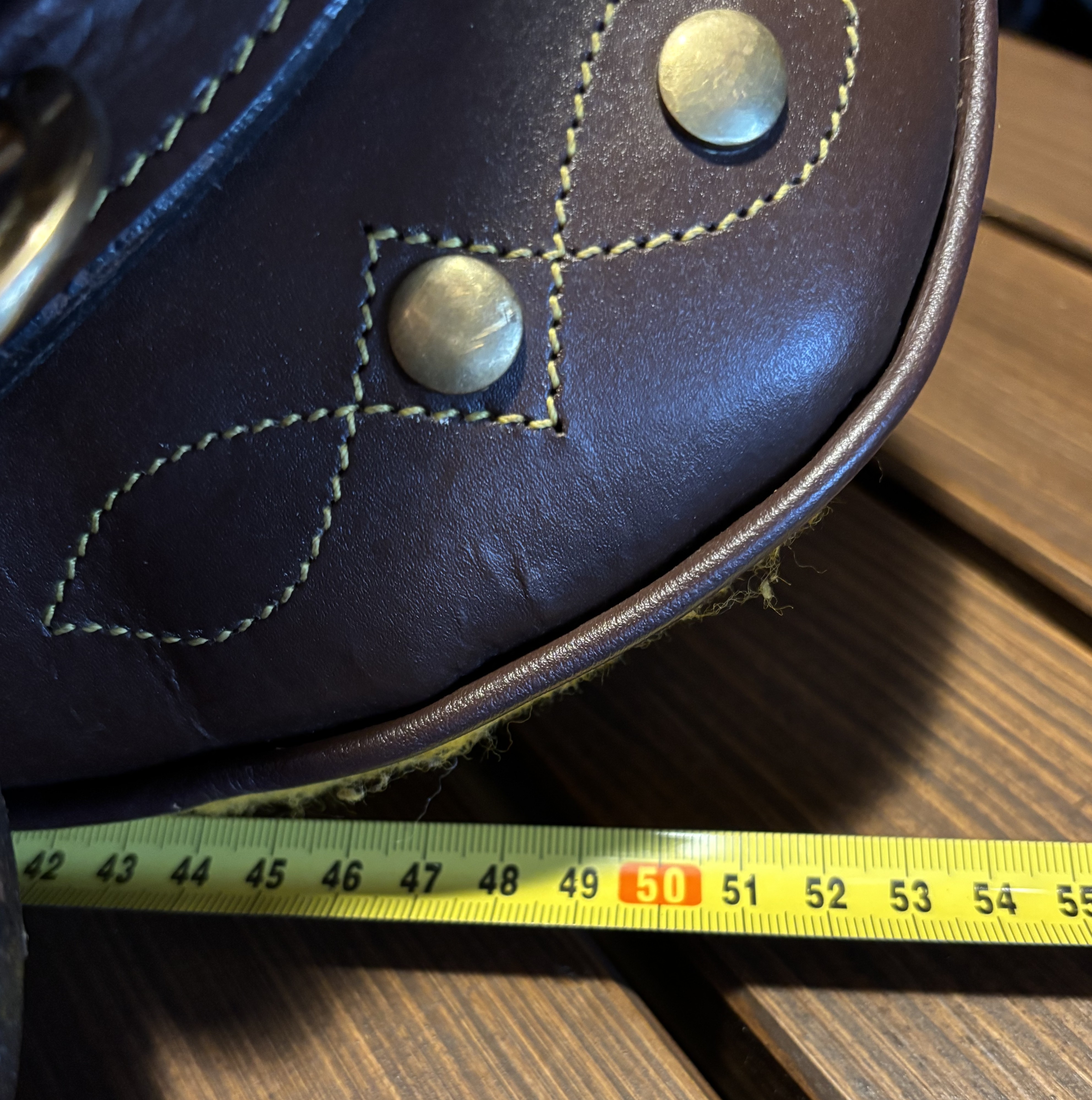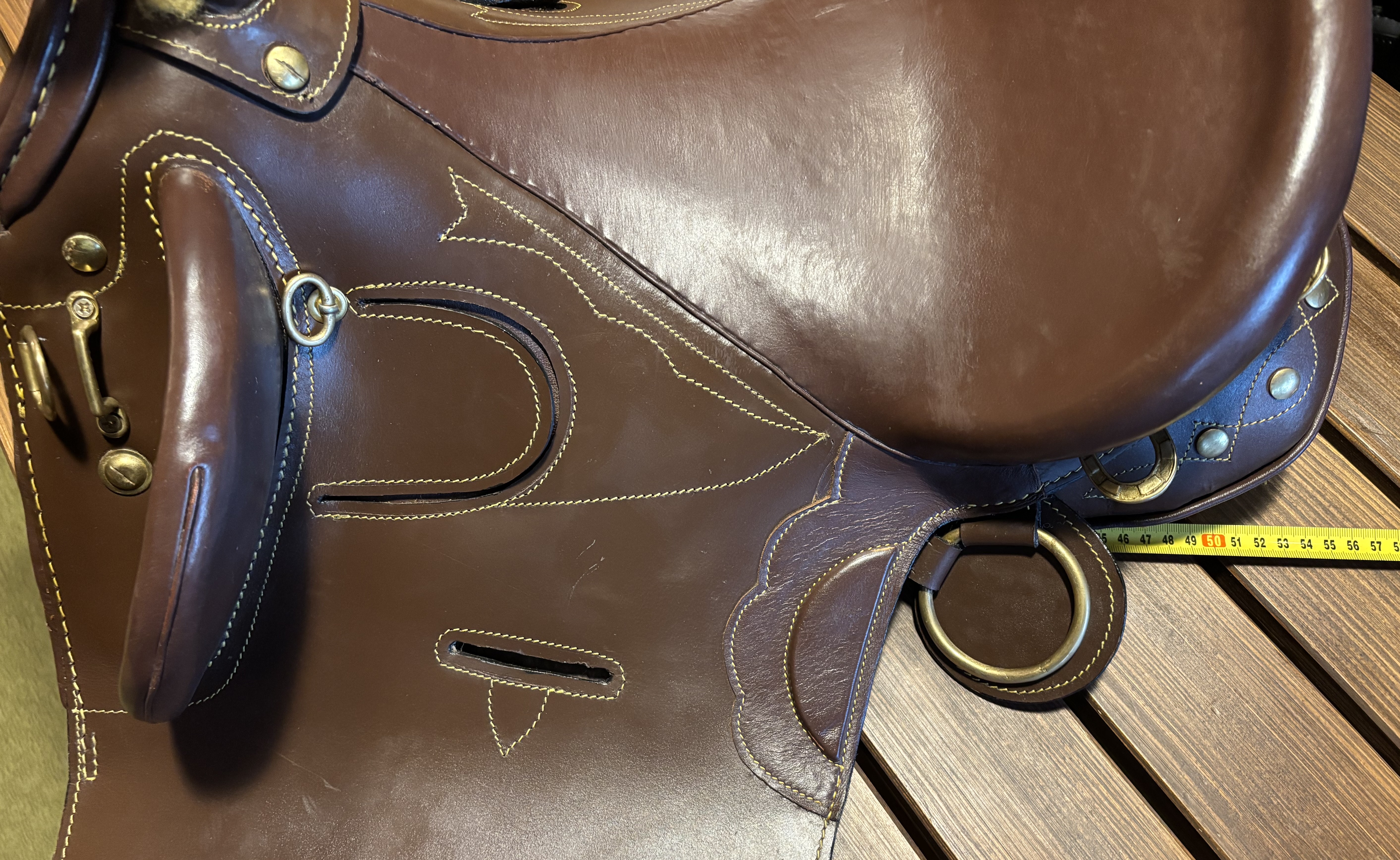 Hnědé australské turistické sedlo s hruškou, koženým sedem a žlutým lemovaným švem. Mosazné/zlaté “déčka” zadní a boční pro přivázání brašen nebo nákladu, přední pro poprsník nebo martingal. Dřevěné kolenní opěrky potažené kůží. Kvalitní a silná kůže na dřevěné kostře. Sedlové polštáře plněné vlněnou drtí. Délka sedu 35cm/14”, komora 18cm/7”, více rozměrů ve fotkách. Sedlo obsahuje přední podbřišník s chlupatinou o délce 100cm a šířce 10cm, třmenové řemeny se třmeny/pár a podpínkový řemen k zajištění zámků třmenových řemenů, vše v barvě sedla. Dekorace sedla “Australian design”. Ideální sedlo na turistiku. Celková délka sedla 55cm. Ruční výroba.