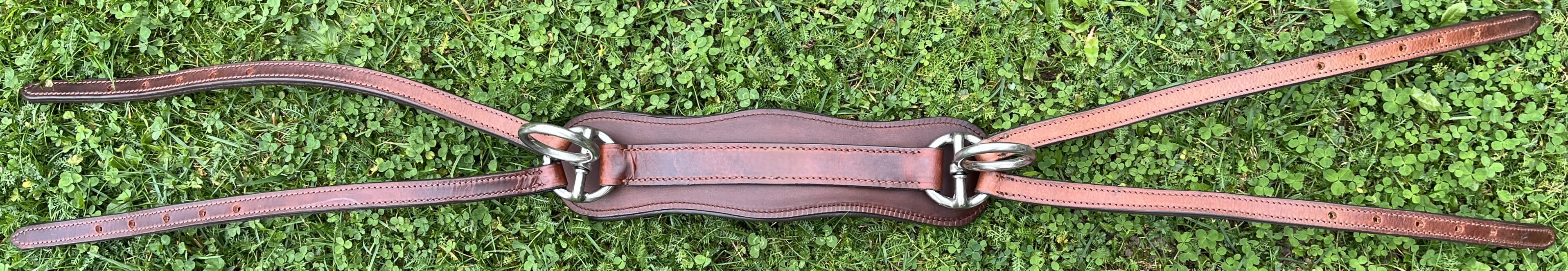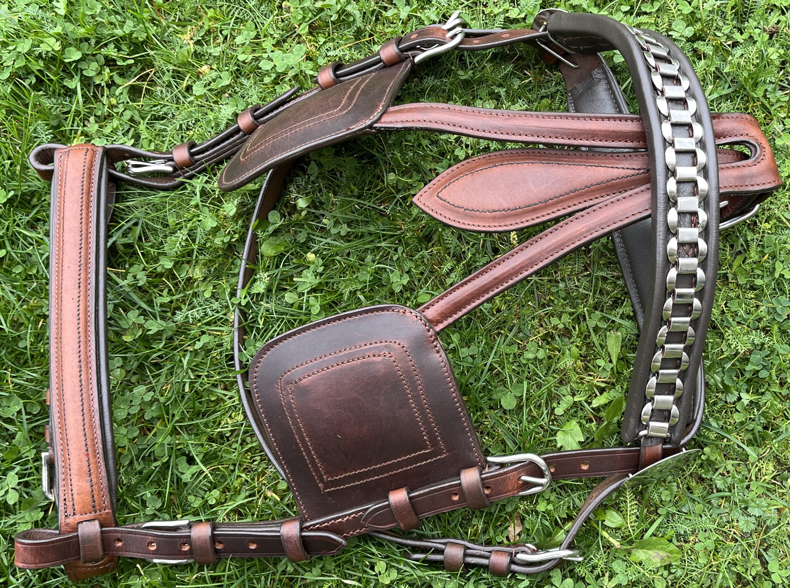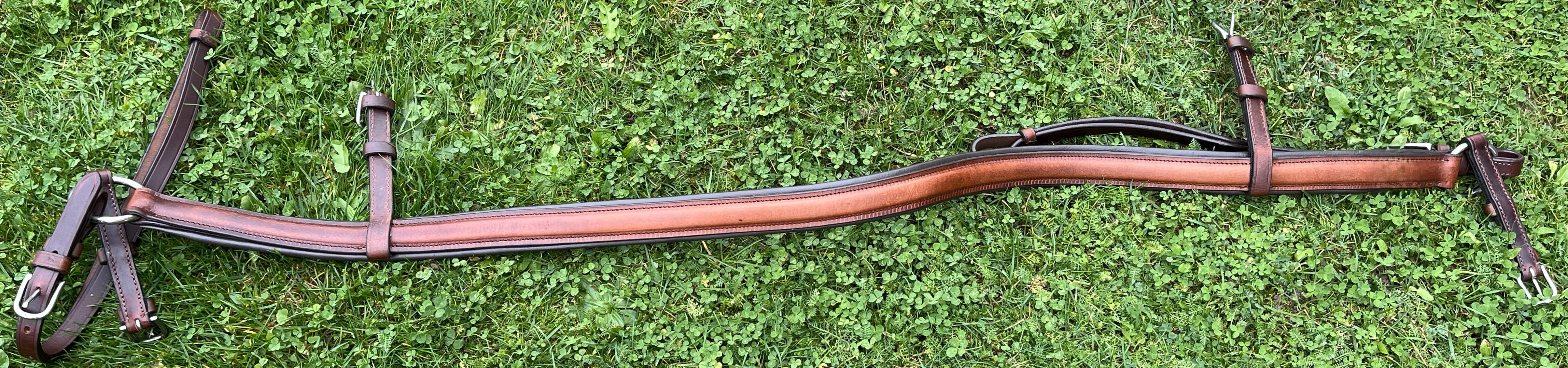 Tažný, kompletní, poprsní postroj hnědé barvy, jednospřežní, o velikosti Full. Součástí kompletu jsou: Uzda, opratě, postraňky/pobočáky-pár, náhřbeník, podbřišník, podocasník, nákrčník, poprsník, nákřižník, náojní řemeny-pár, zadní zádržový řemen. Všechny části postroje jsou vyrobené z prémiové kůže, kvalitních doplňkových materiálů a vše důkladně zpracované pro tažné zatížení. Ruční výroba.