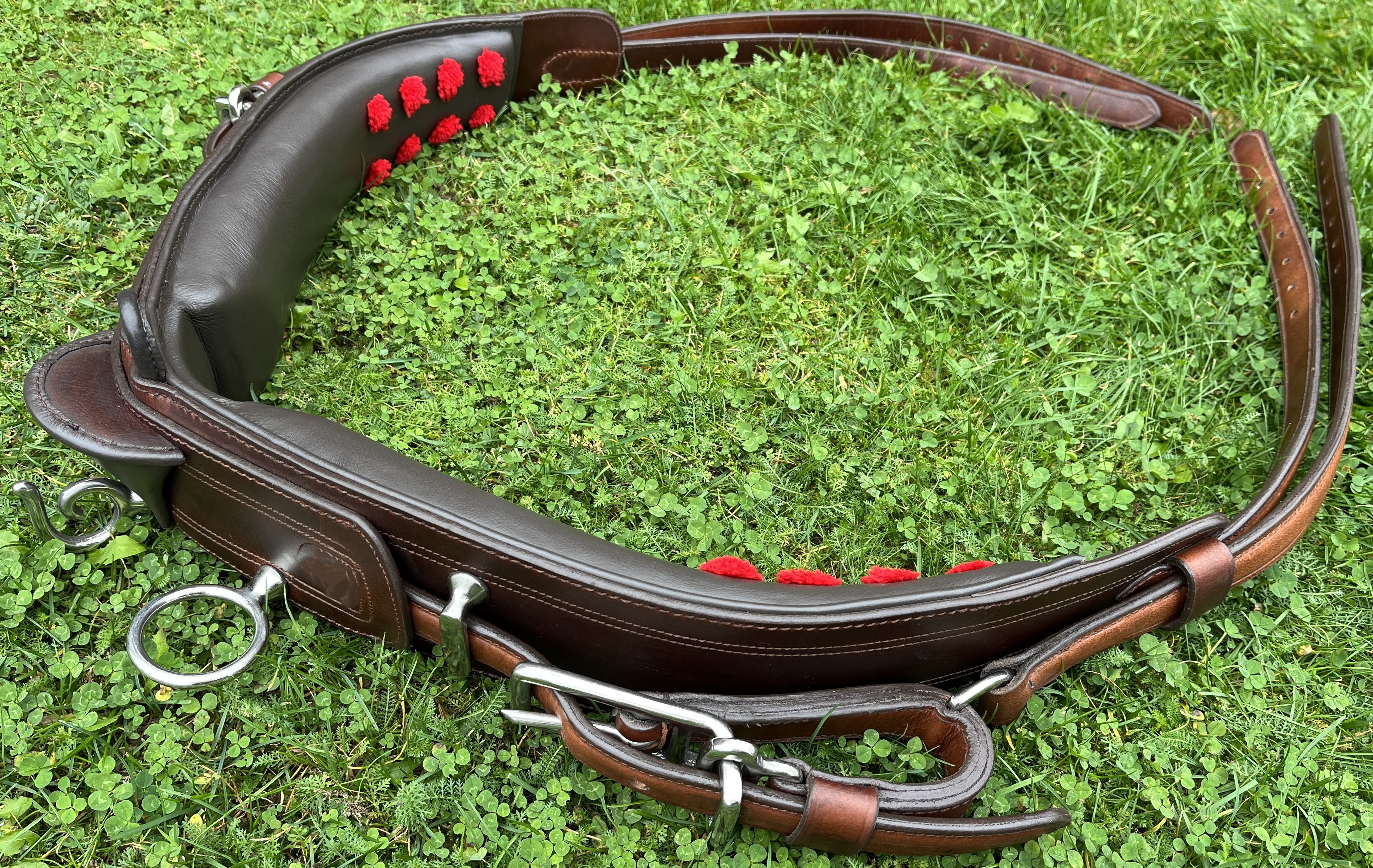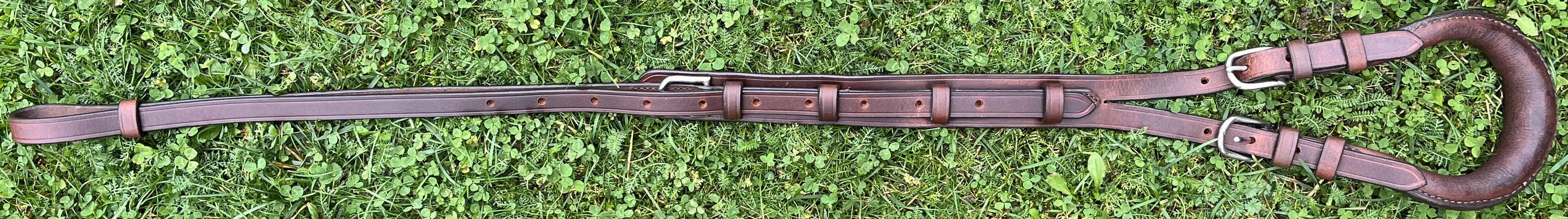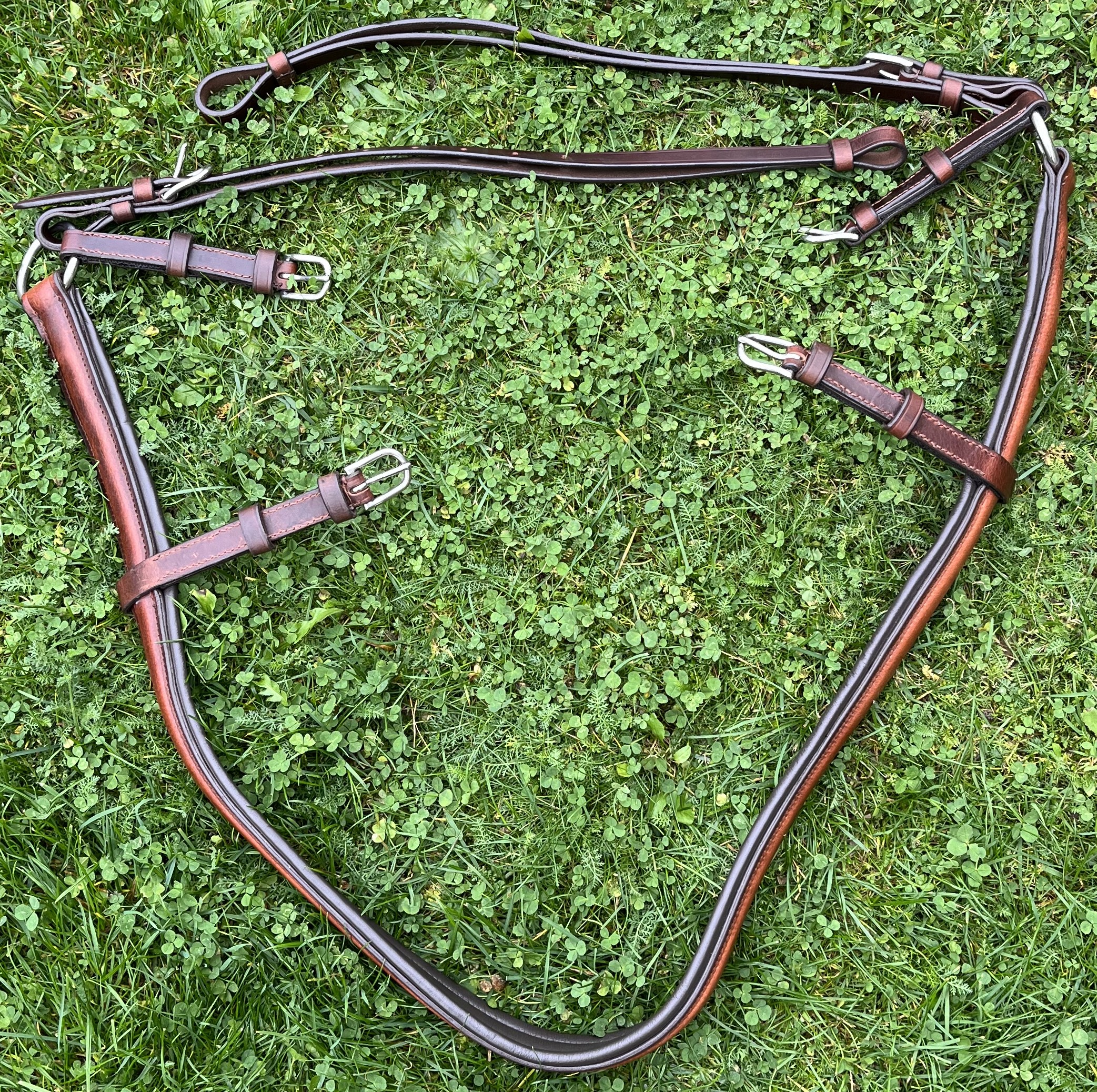 Tažný, kompletní, poprsní postroj hnědé barvy, jednospřežní, o velikosti Full. Součástí kompletu jsou: Uzda, opratě, postraňky/pobočáky-pár, náhřbeník, podbřišník, podocasník, nákrčník, poprsník, nákřižník, náojní řemeny-pár, zadní zádržový řemen. Všechny části postroje jsou vyrobené z prémiové kůže, kvalitních doplňkových materiálů a vše důkladně zpracované pro tažné zatížení. Ruční výroba.