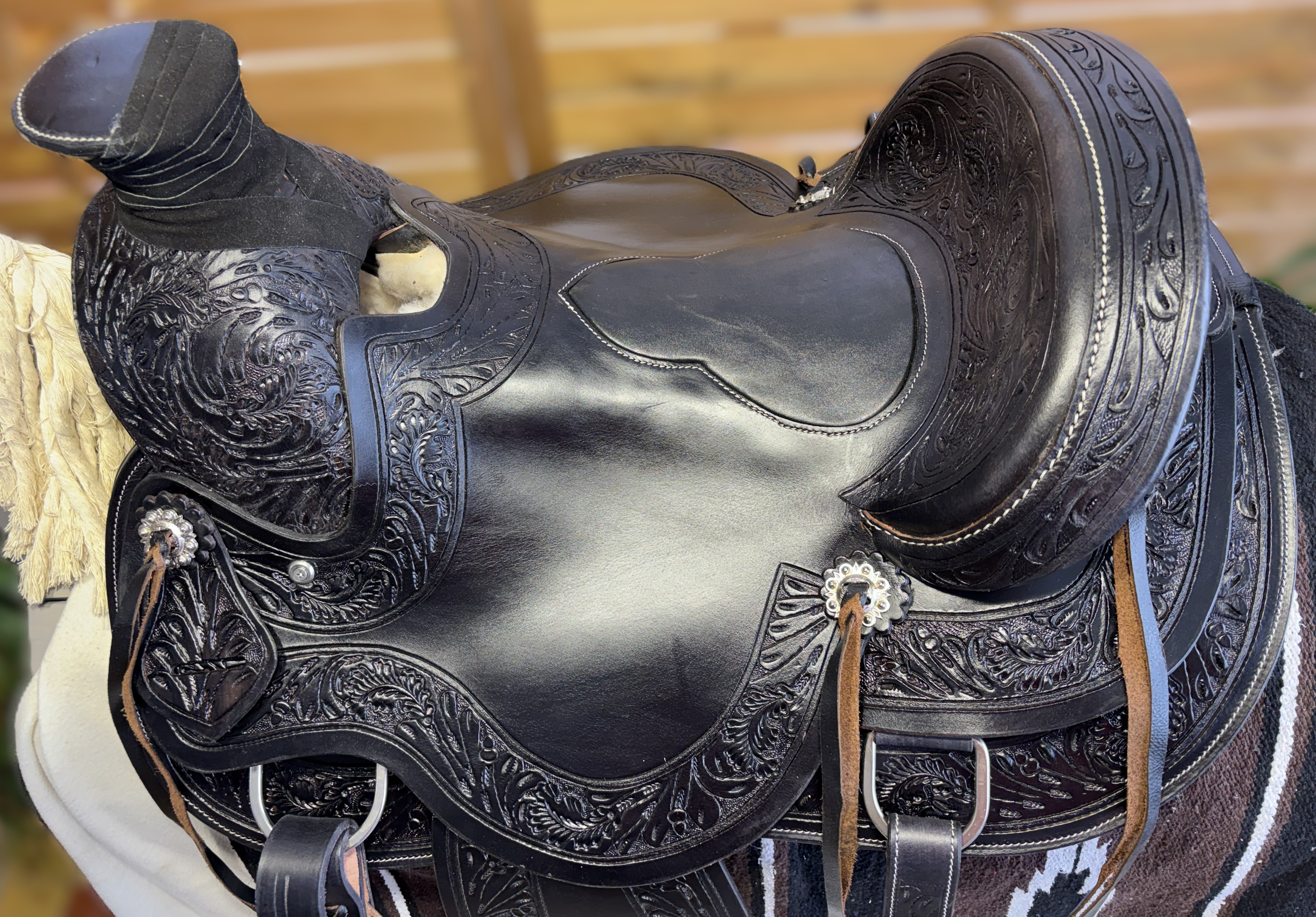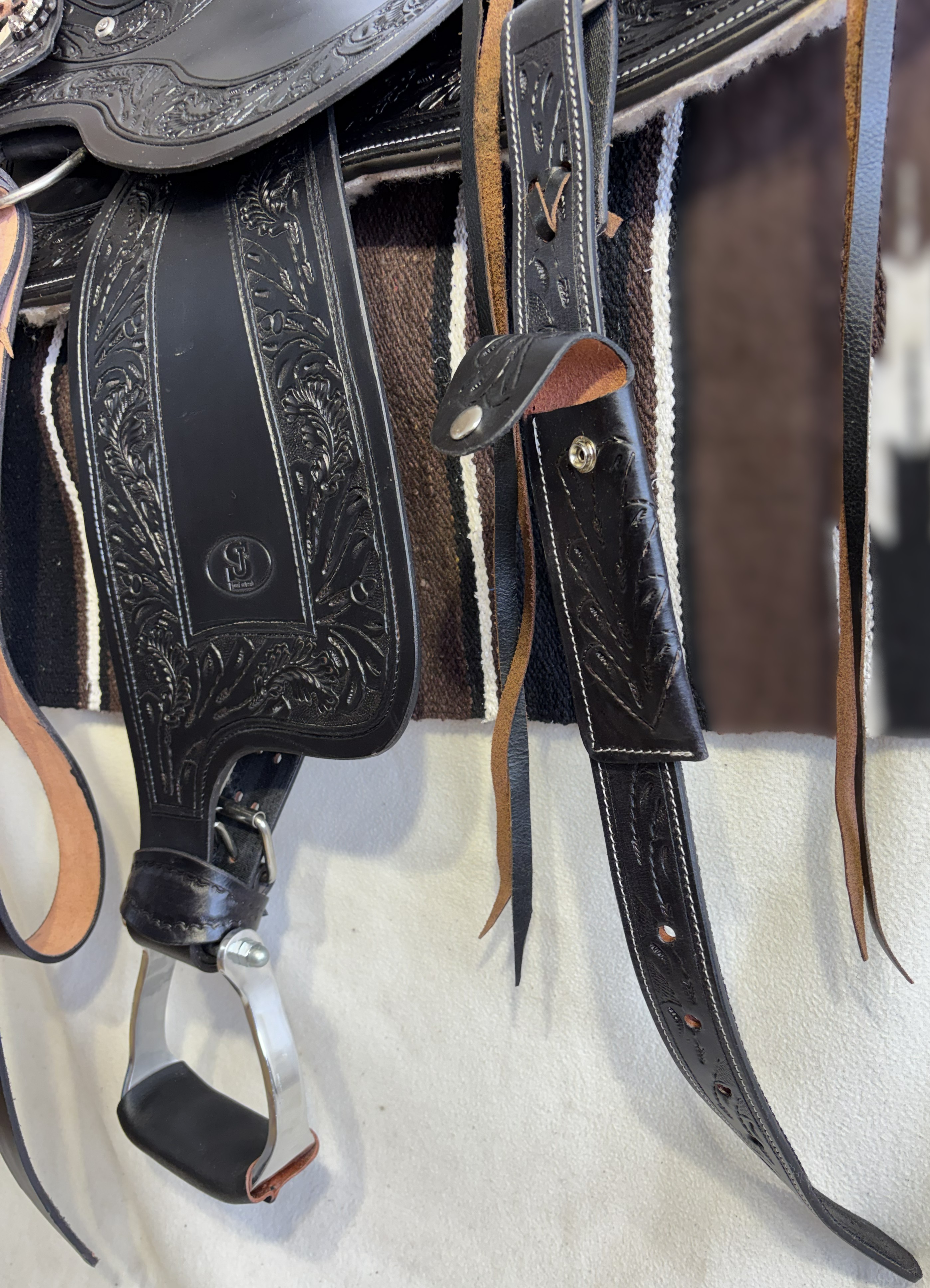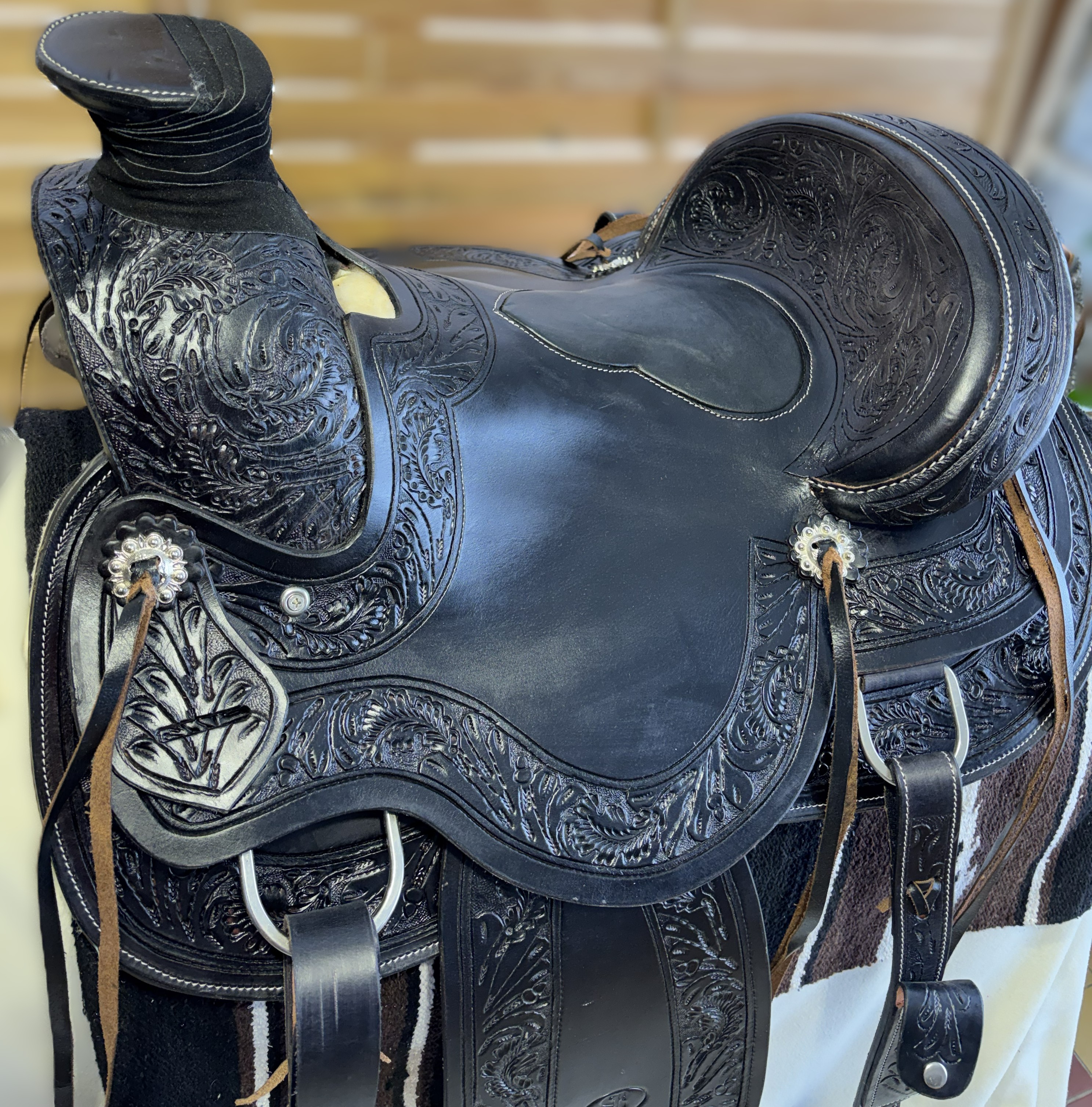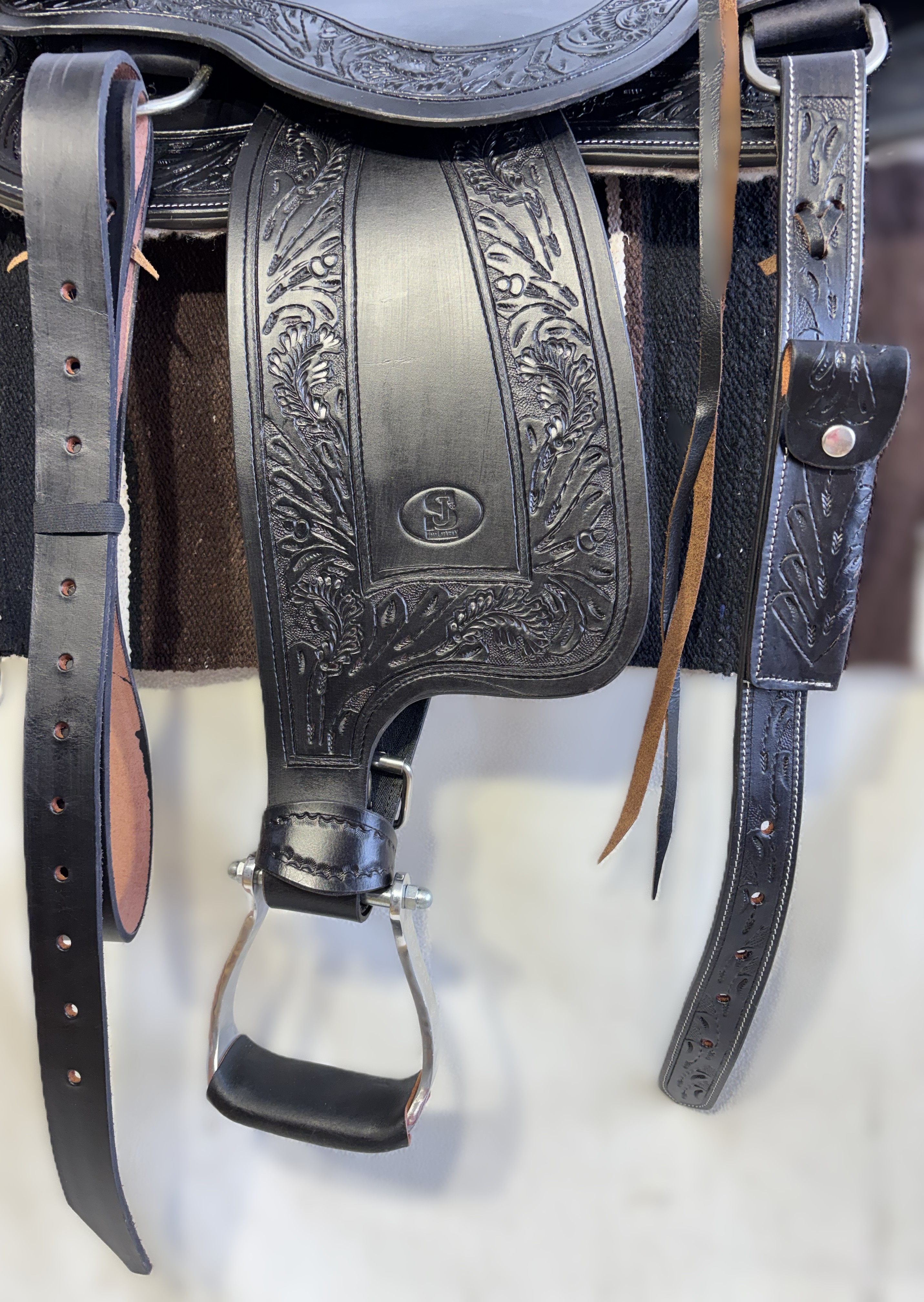 Westernové sedlo-komplet č.2) WADE v černé barvě s měkčeným koženým sedem. Velikost sedel je Full/QH, 16” (40,5cm) i 17” (43cm) v sedu, gulett/komorou 8,5” (21,5cm). Celková délka sedla je 69cm. Sedlo je v částečné dekoraci Floral. Kvalitní a silná kůže na Fiber-glass kostře (lehké, pružné a pevné). Jednoduchý systém posouvání délky fendrových řemenů přes klasickou přezku. Třmeny jsou z leštěného tvrzeného hliníku, s koženými nášlapy. Součástí sedla jsou sedlové struny na přivázání bagáže nebo sedlové brašny. Sedlo je zkompletováno se: Zadními sedlovými řemeny k zadnímu podbřišníku, na levém řemenu s pouzdrem. Uzdečkou, poprsníkem a otěžemi vše v barvě i dekoraci sedla. Předním provázkovým podbřišníkem a zadním koženým podbřišníkem s propojovacím řemínkem. Westernovou podsedlovou Nawaho dekou. Ruční výroba