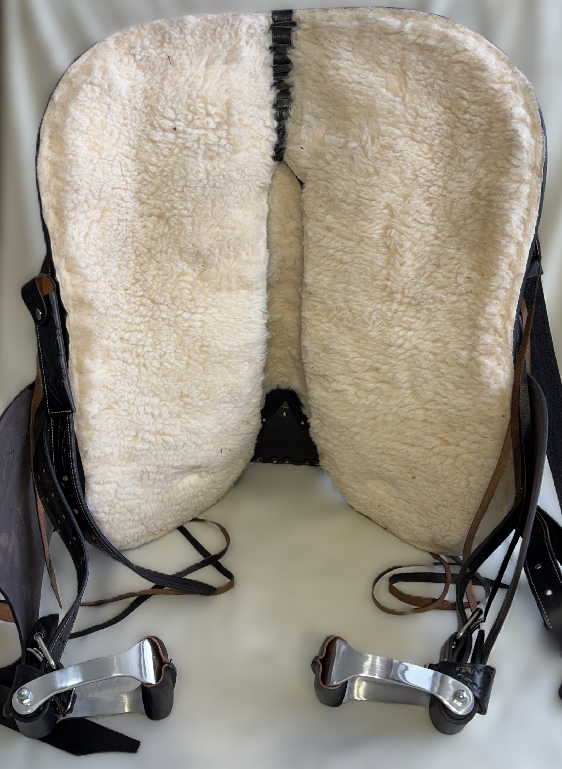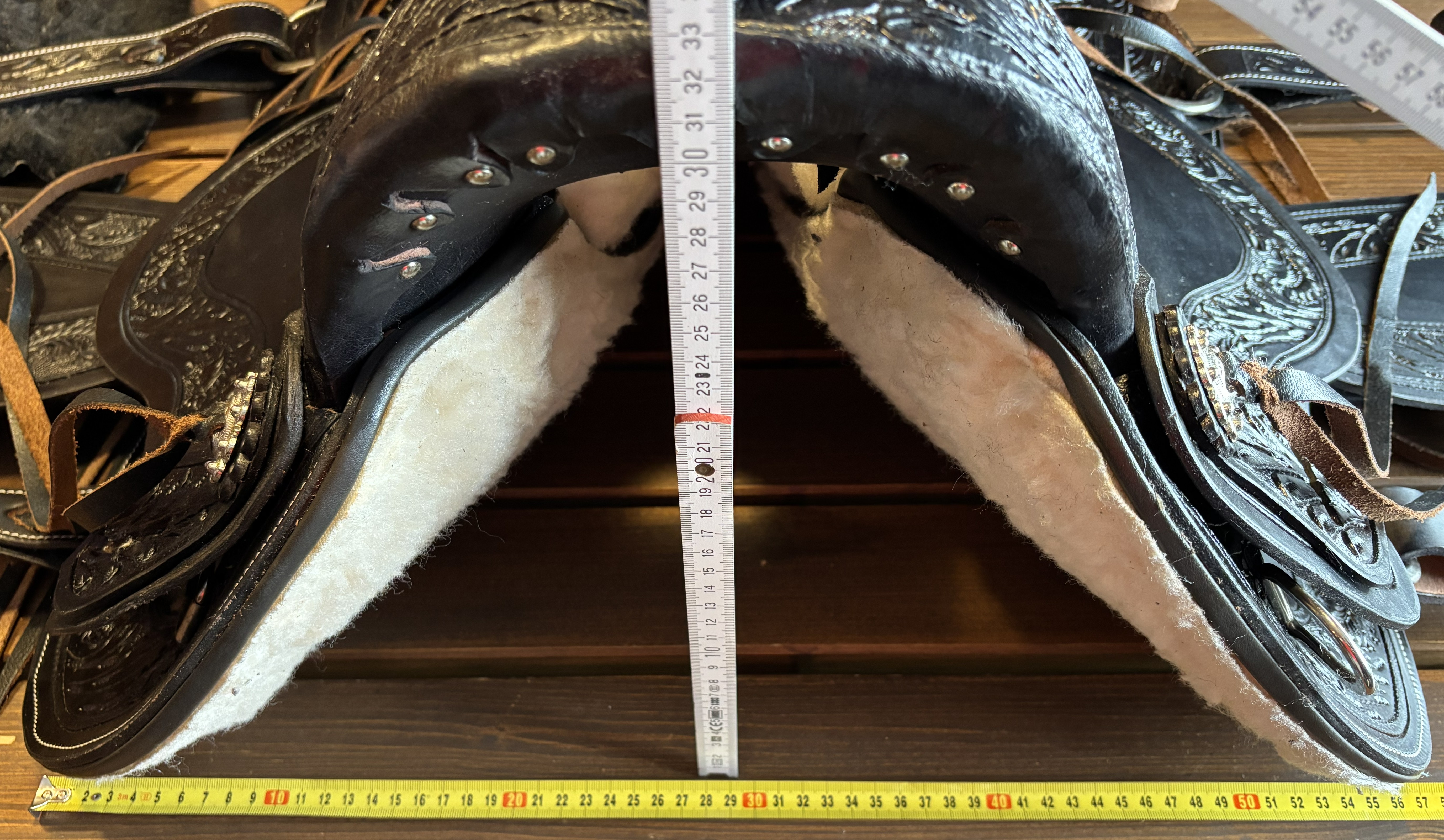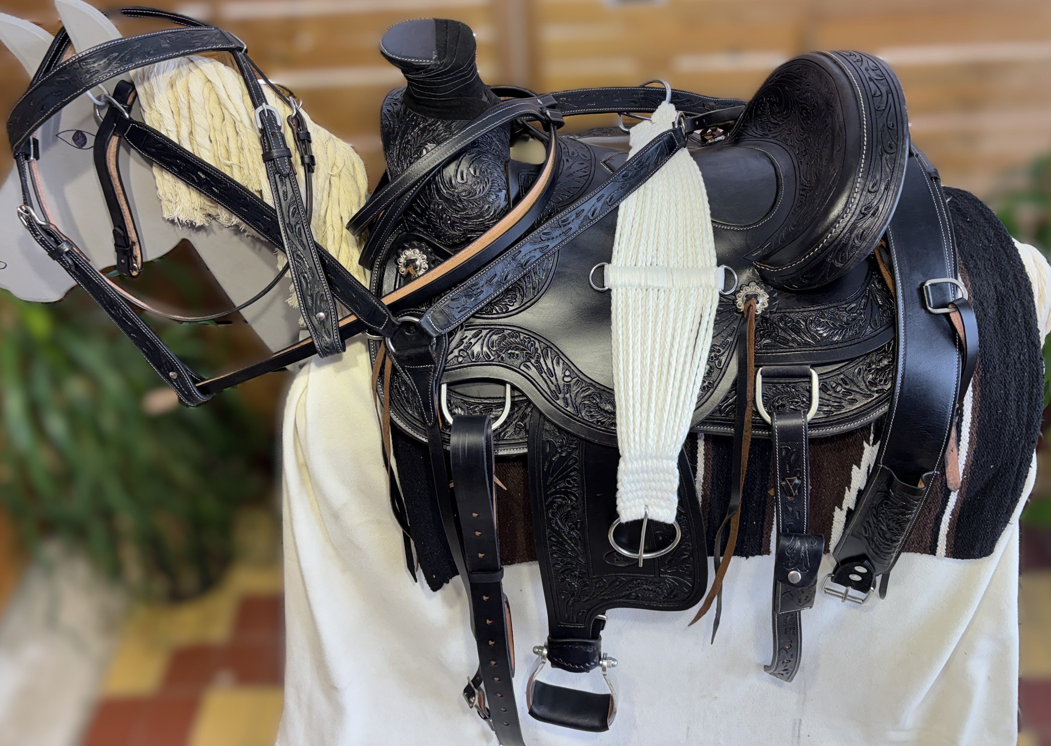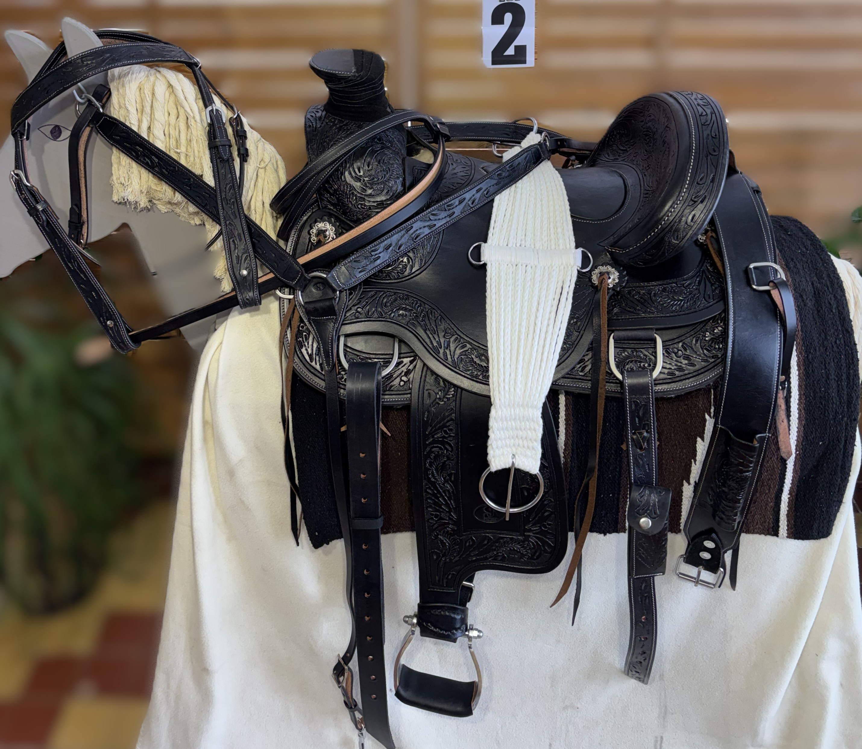 Westernové sedlo-komplet č.2) WADE v černé barvě s měkčeným koženým sedem. Velikost sedel je Full/QH, 16” (40,5cm) i 17” (43cm) v sedu, gulett/komorou 8,5” (21,5cm). Celková délka sedla je 69cm. Sedlo je v částečné dekoraci Floral. Kvalitní a silná kůže na Fiber-glass kostře (lehké, pružné a pevné). Jednoduchý systém posouvání délky fendrových řemenů přes klasickou přezku. Třmeny jsou z leštěného tvrzeného hliníku, s koženými nášlapy. Součástí sedla jsou sedlové struny na přivázání bagáže nebo sedlové brašny. Sedlo je zkompletováno se: Zadními sedlovými řemeny k zadnímu podbřišníku, na levém řemenu s pouzdrem. Uzdečkou, poprsníkem a otěžemi vše v barvě i dekoraci sedla. Předním provázkovým podbřišníkem a zadním koženým podbřišníkem s propojovacím řemínkem. Westernovou podsedlovou Nawaho dekou. Ruční výroba