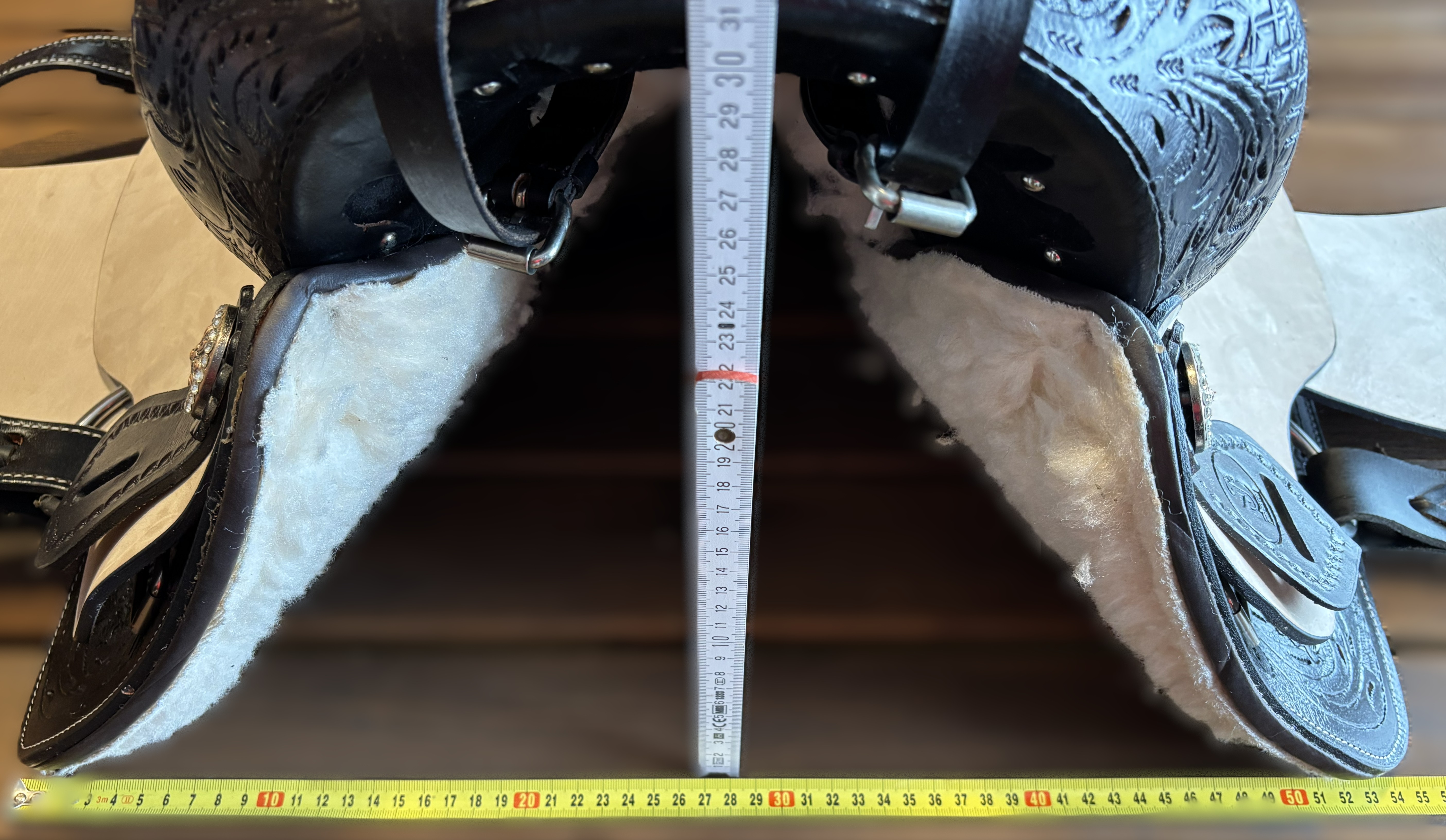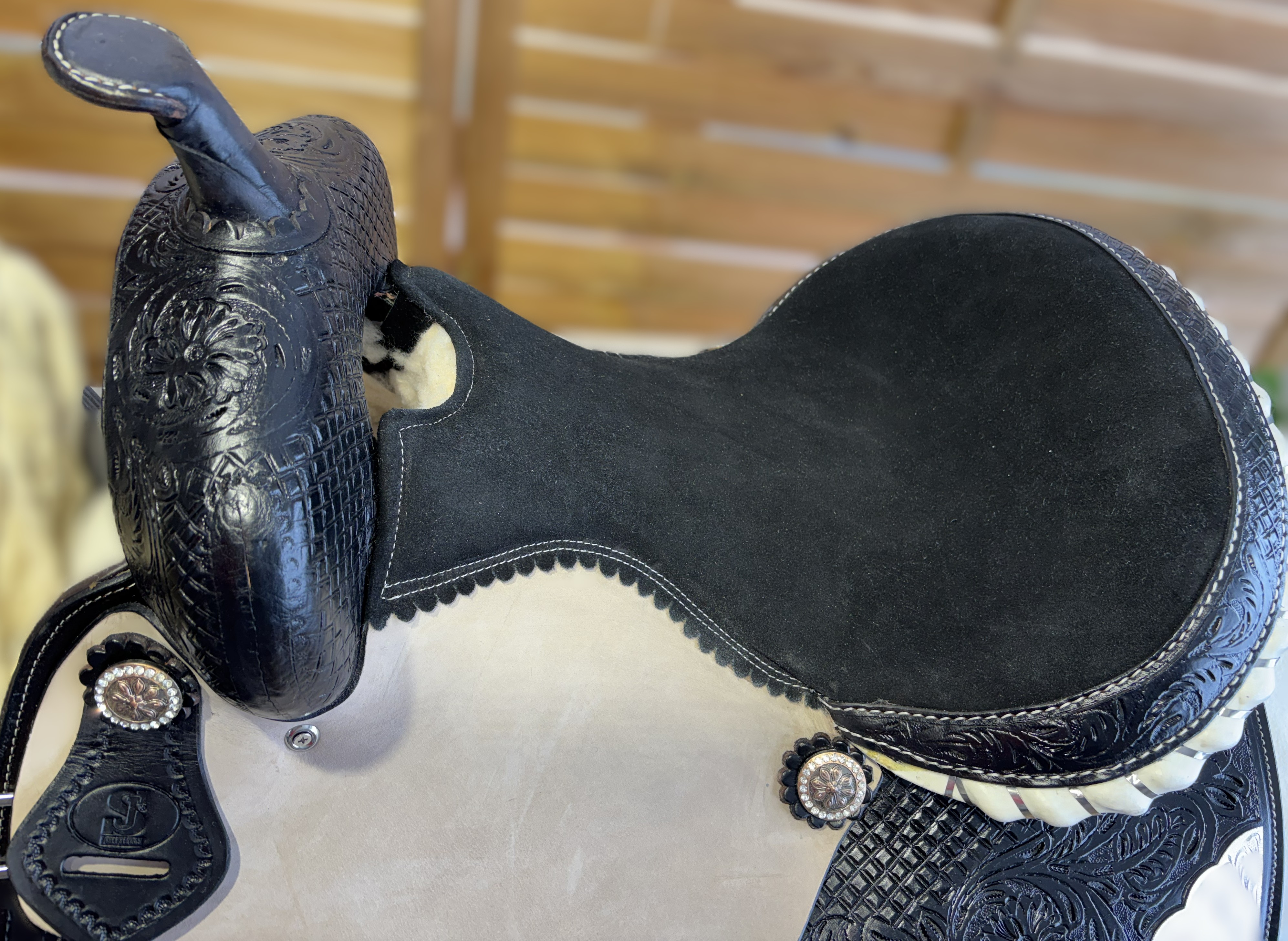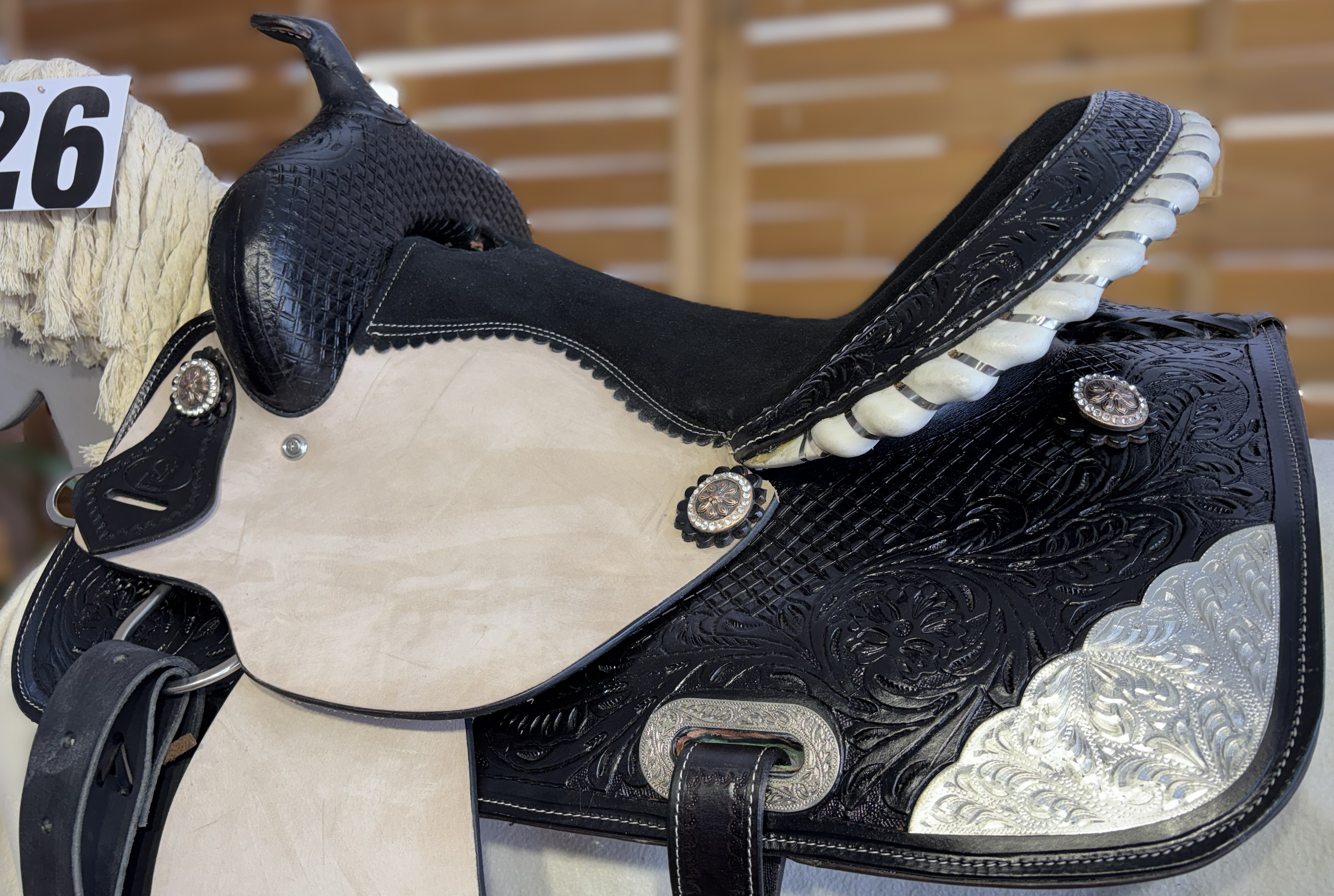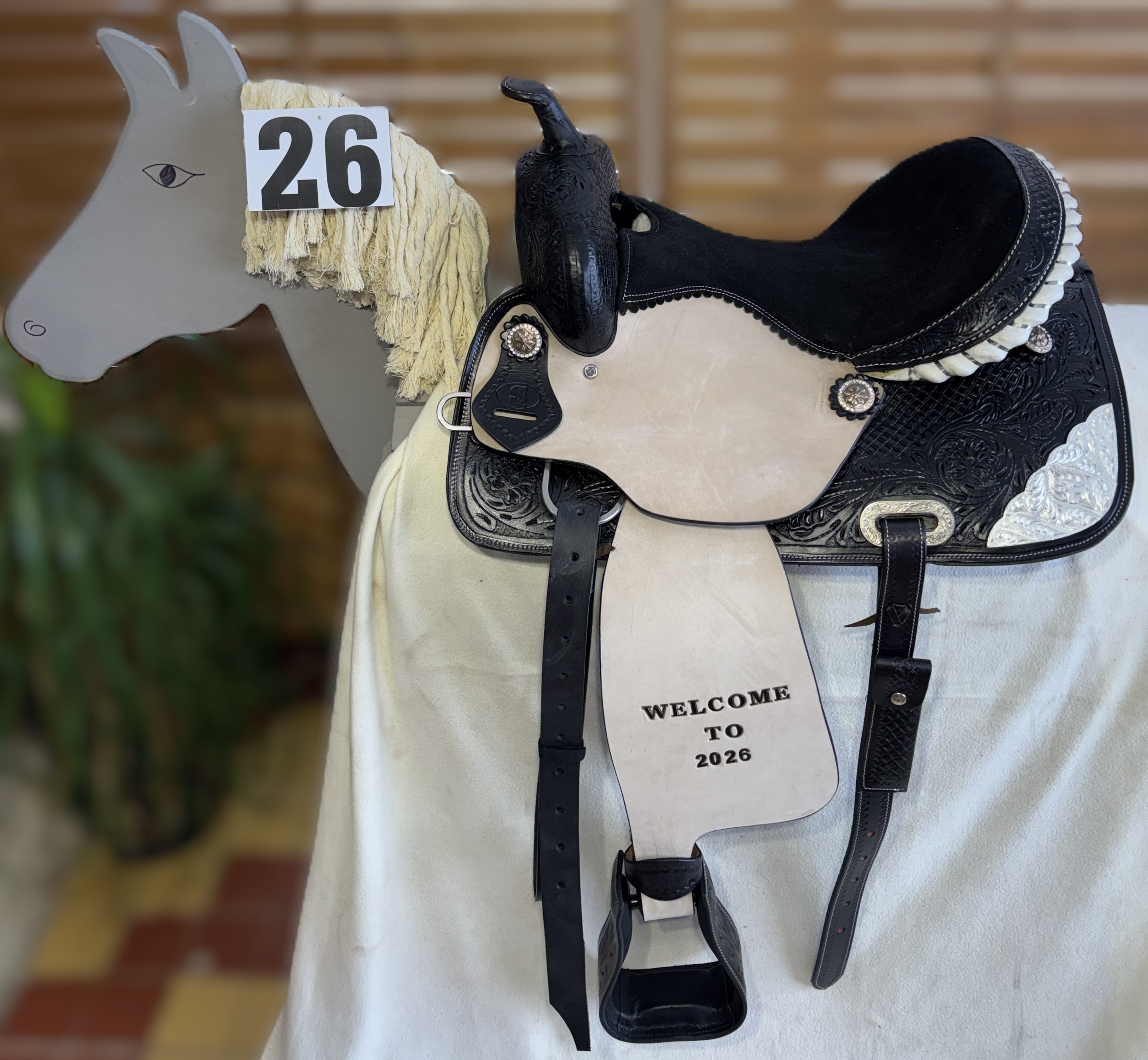 Westernové sedlo-komplet č.26) v limitující serii “Welcome to 2026” v černé barvě kombinované se světlou přírodní, kovovými doplňky a bílým lemem zadní rozsochy. Velkost sedel je Full/QH, 16” (40,5cm) i 17” (43cm) v sedu, a gulett/komorou 9,5” (24,5cm). Celková délka sedla je 64cm. Sedlo je v dekoraci Basket/Floral. Sedlové bočnice a fendry hladké, bez zdobení, s raženým popisem. Černý měkčený sed z "nubuk" kůže bez prošívání. Kvalitní a silná kůže na Fiber-glass kostře (lehké, pružné a pevné). Jednoduchý systém posouvání délky fendrových řemenů přes klasickou přezku. Třmeny jsou z leštěného tvrzeného hliníku, s koženými nášlapy. Sedlo je zkompletováno se: Zadními sedlovými řemeny k zadnímu podbřišníku, na levém řemenu s pouzdrem. Uzdečkou, poprsníkem a otěžemi vše v barvě i dekoraci sedla. Sedlovým pouzdrem. Předním provázkovým podbřišníkem a zadním koženým podbřišníkem s propojovacím řemínkem. Ruční výroba.