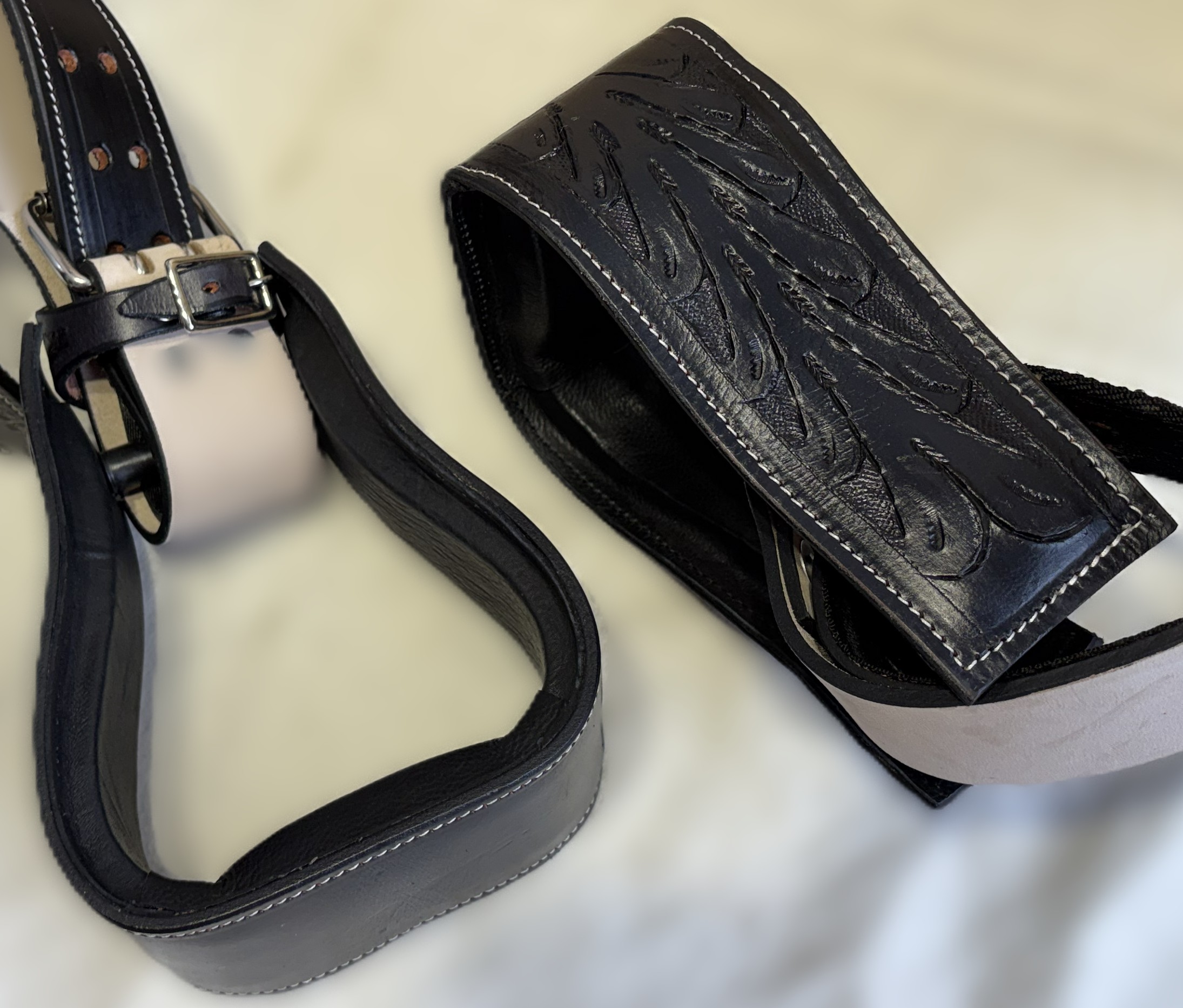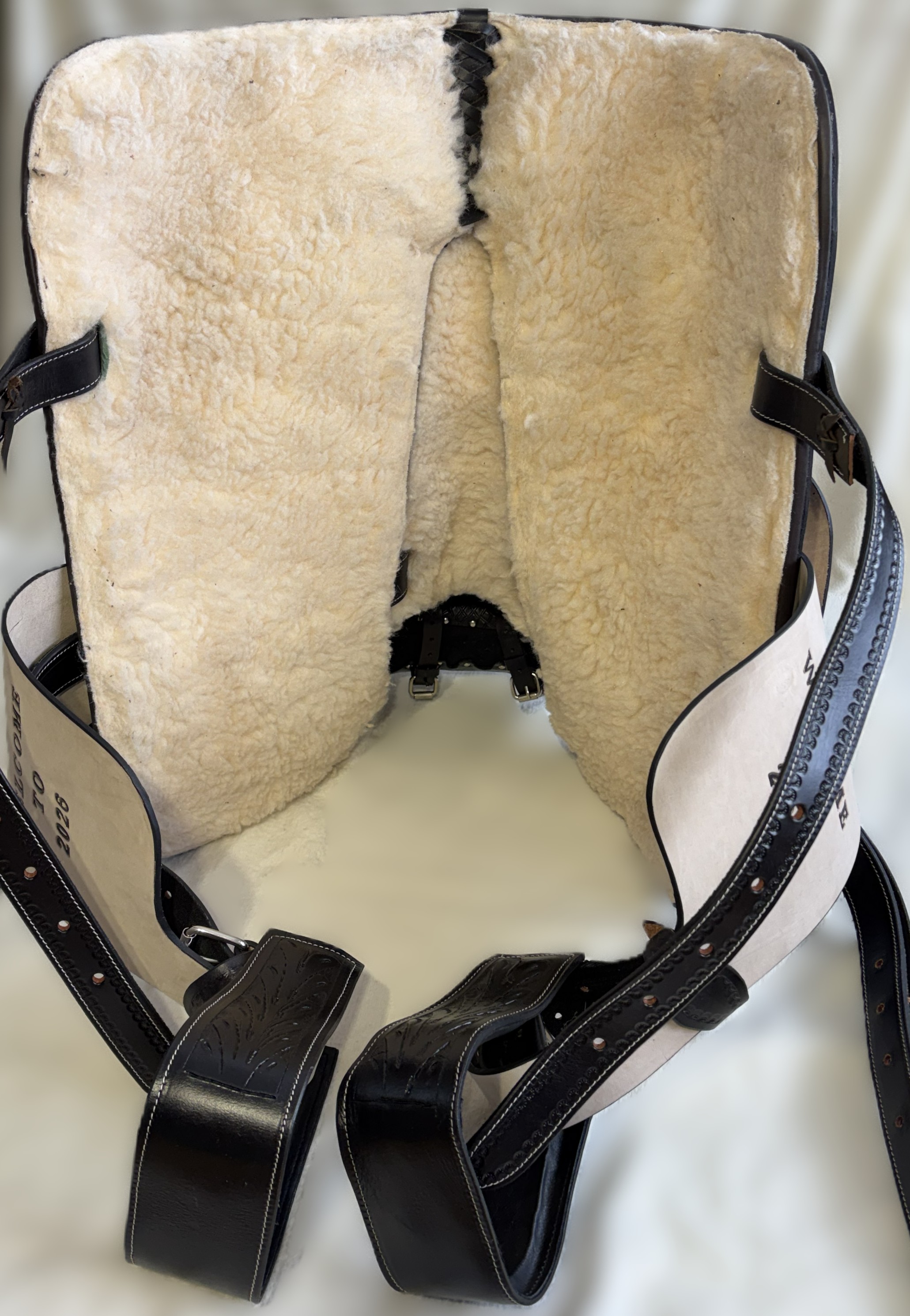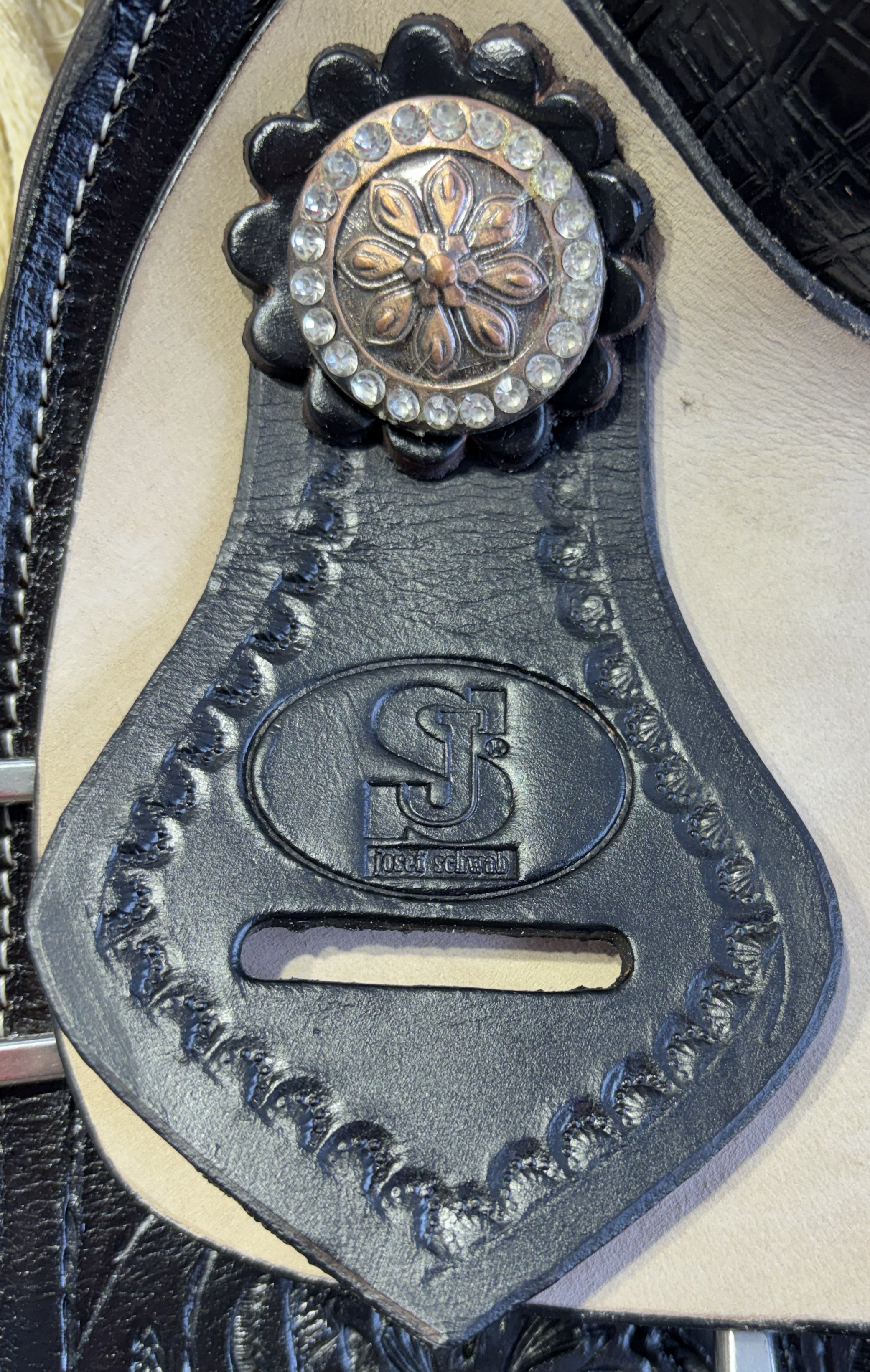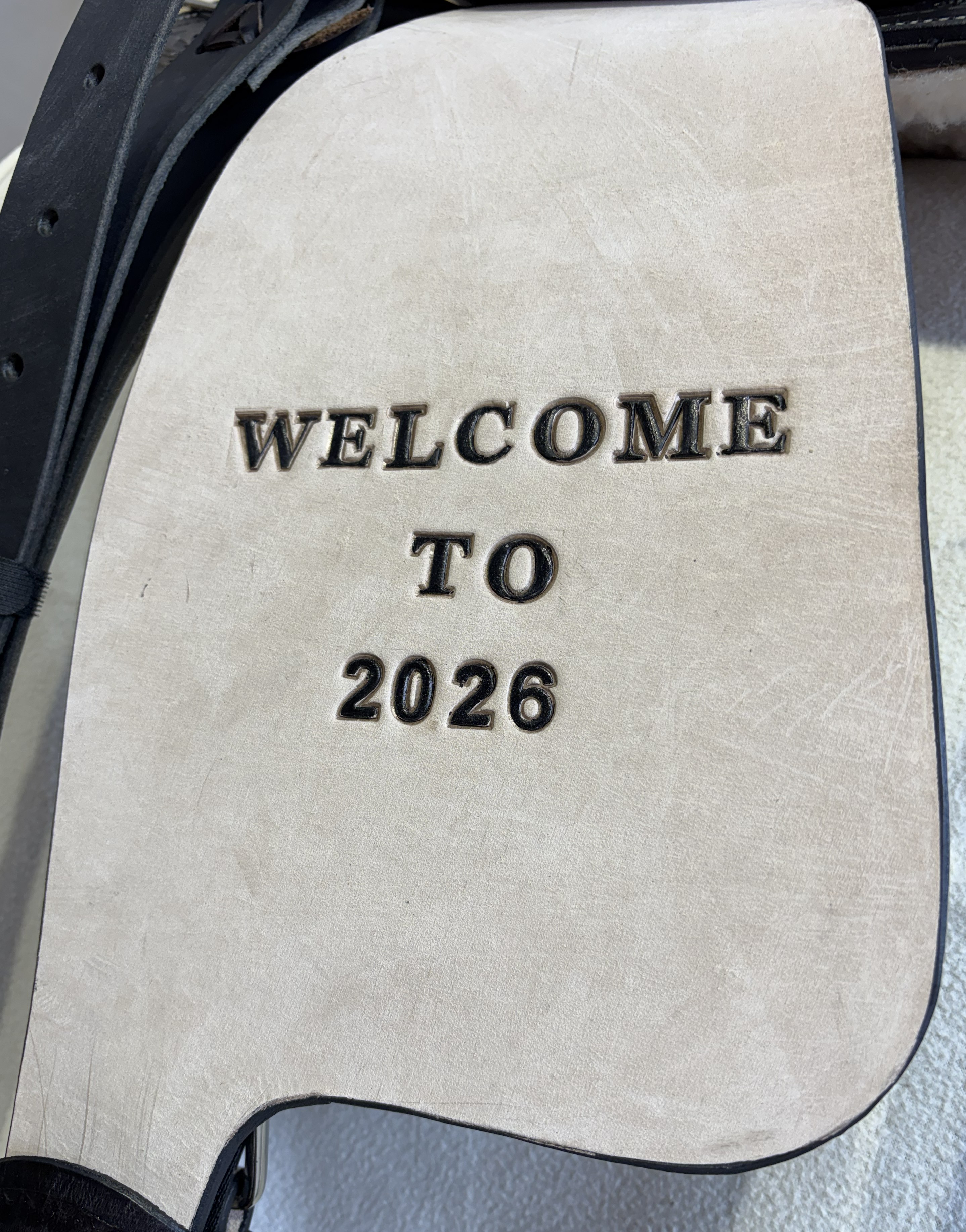 Westernové sedlo-komplet č.26) v limitující serii “Welcome to 2026” v černé barvě kombinované se světlou přírodní, kovovými doplňky a bílým lemem zadní rozsochy. Velkost sedel je Full/QH, 16” (40,5cm) i 17” (43cm) v sedu, a gulett/komorou 9,5” (24,5cm). Celková délka sedla je 64cm. Sedlo je v dekoraci Basket/Floral. Sedlové bočnice a fendry hladké, bez zdobení, s raženým popisem. Černý měkčený sed z "nubuk" kůže bez prošívání. Kvalitní a silná kůže na Fiber-glass kostře (lehké, pružné a pevné). Jednoduchý systém posouvání délky fendrových řemenů přes klasickou přezku. Třmeny jsou z leštěného tvrzeného hliníku, s koženými nášlapy. Sedlo je zkompletováno se: Zadními sedlovými řemeny k zadnímu podbřišníku, na levém řemenu s pouzdrem. Uzdečkou, poprsníkem a otěžemi vše v barvě i dekoraci sedla. Sedlovým pouzdrem. Předním provázkovým podbřišníkem a zadním koženým podbřišníkem s propojovacím řemínkem. Ruční výroba.